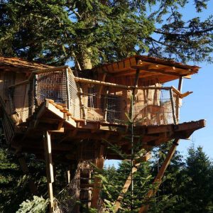 ABANE nous fait rêver avec de jolies cabanes, authentiques, de 10 à 20 mètres carrés, perchées à 4, 8, 10 mètres du sol, éclairées à la bougie, avec toilettes sèches, où l’on hisse un panier repas pour ne profiter que de l’instant présent. Ces cabanes sont des modèles uniques, déposés, avec des murs obliques. Elles ressemblent aux cabanes de nos rêves et de nos livres d’enfant.
