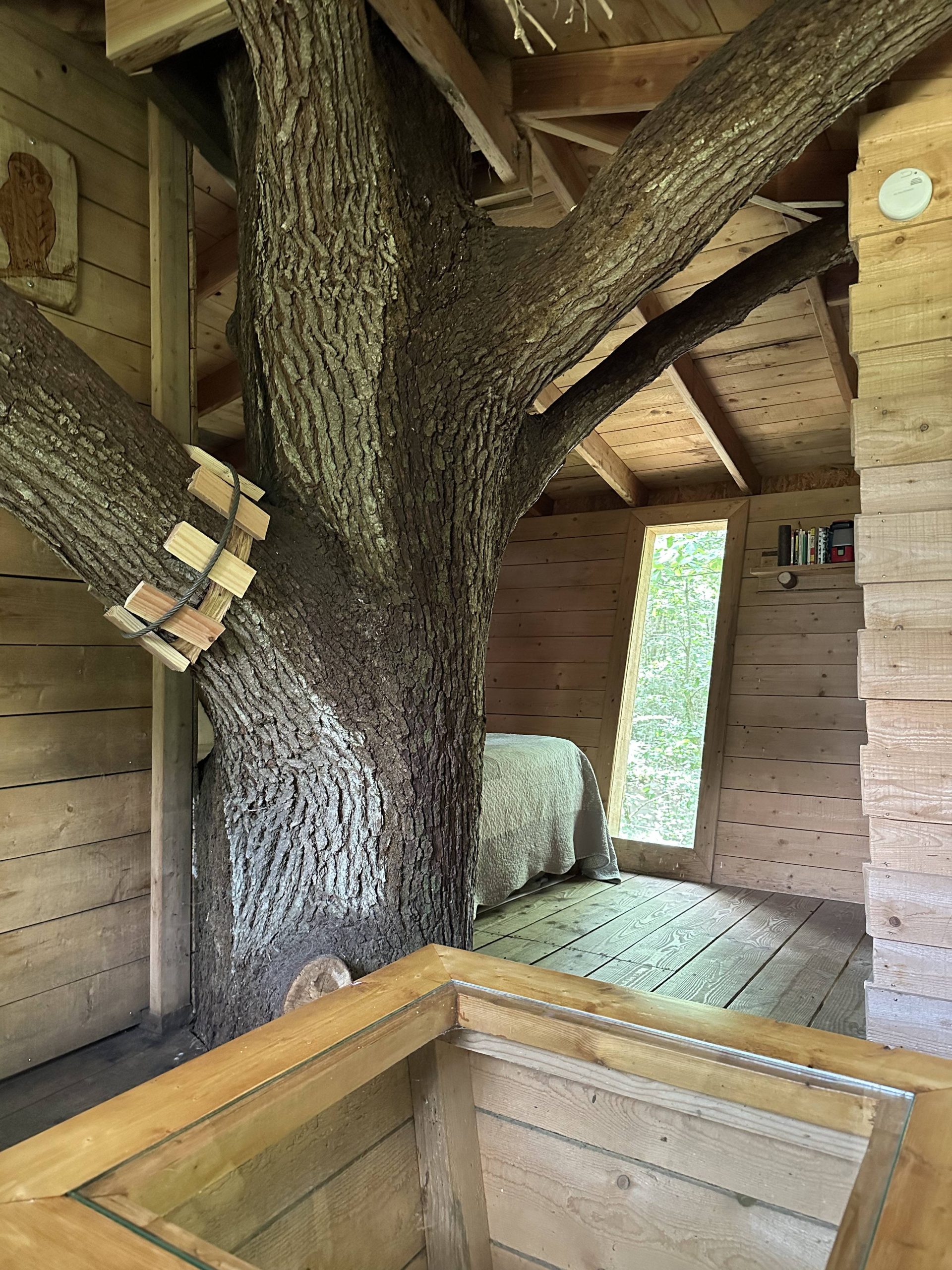 La cabane Hulotte est nichée dans le bois de l’Orbière et perchée à 8m de haut.