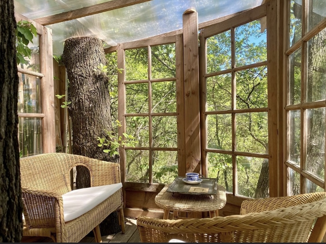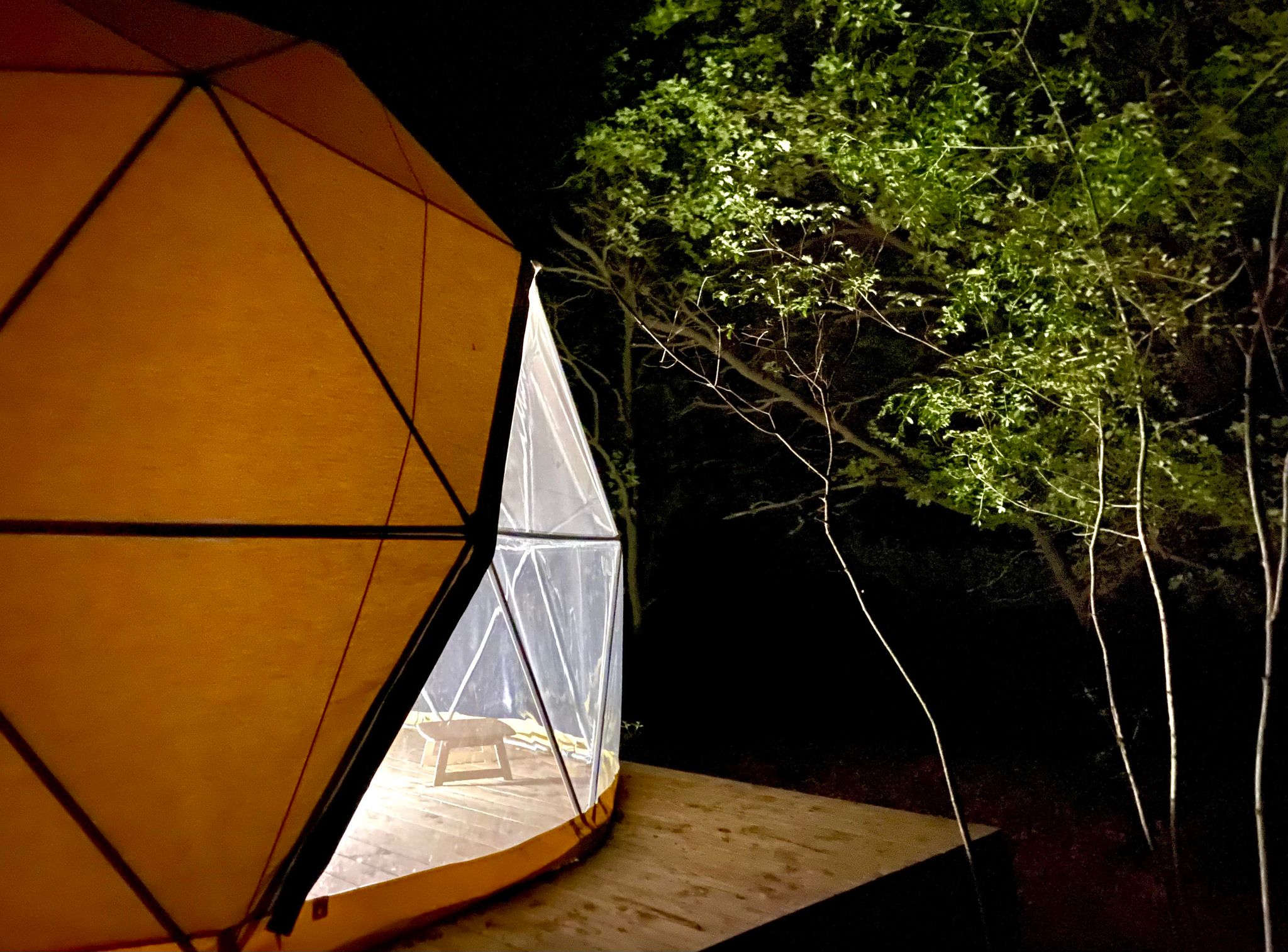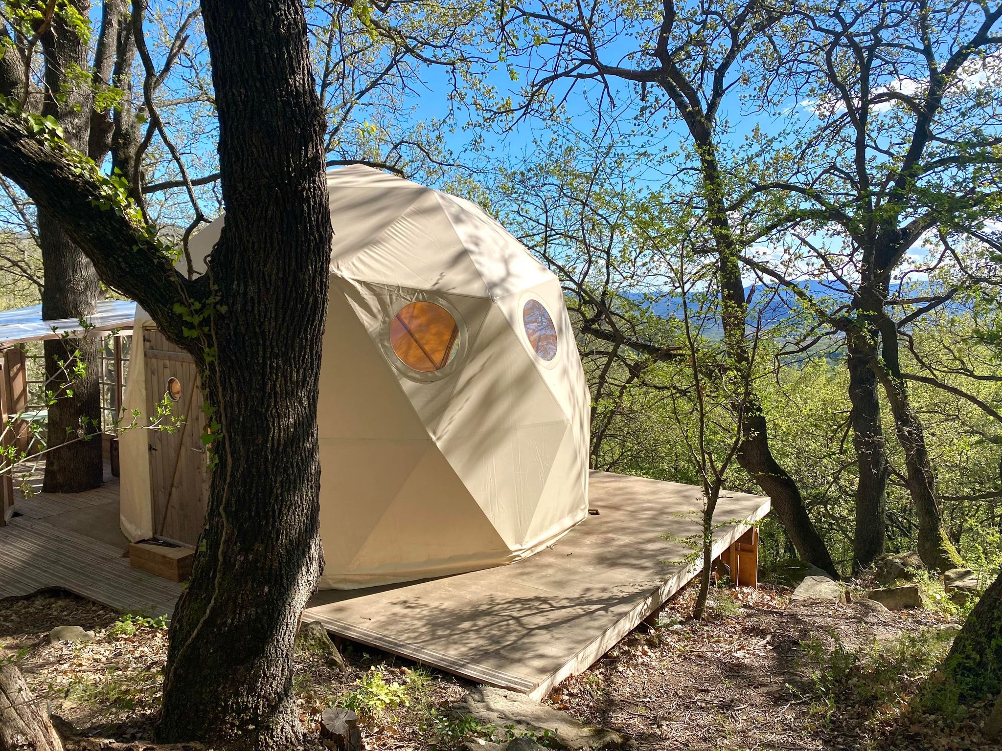 Chaque dôme possède sa terrasse attenante, sa douche extérieure sous les chênes et des toilettes sèches.