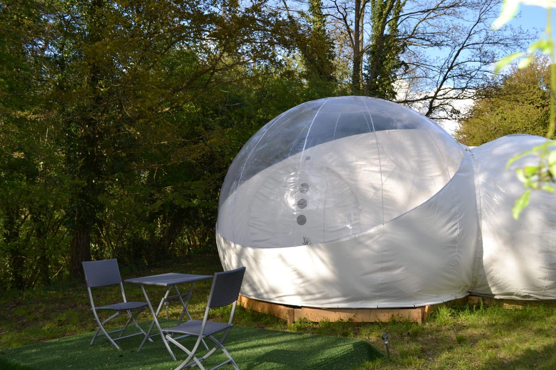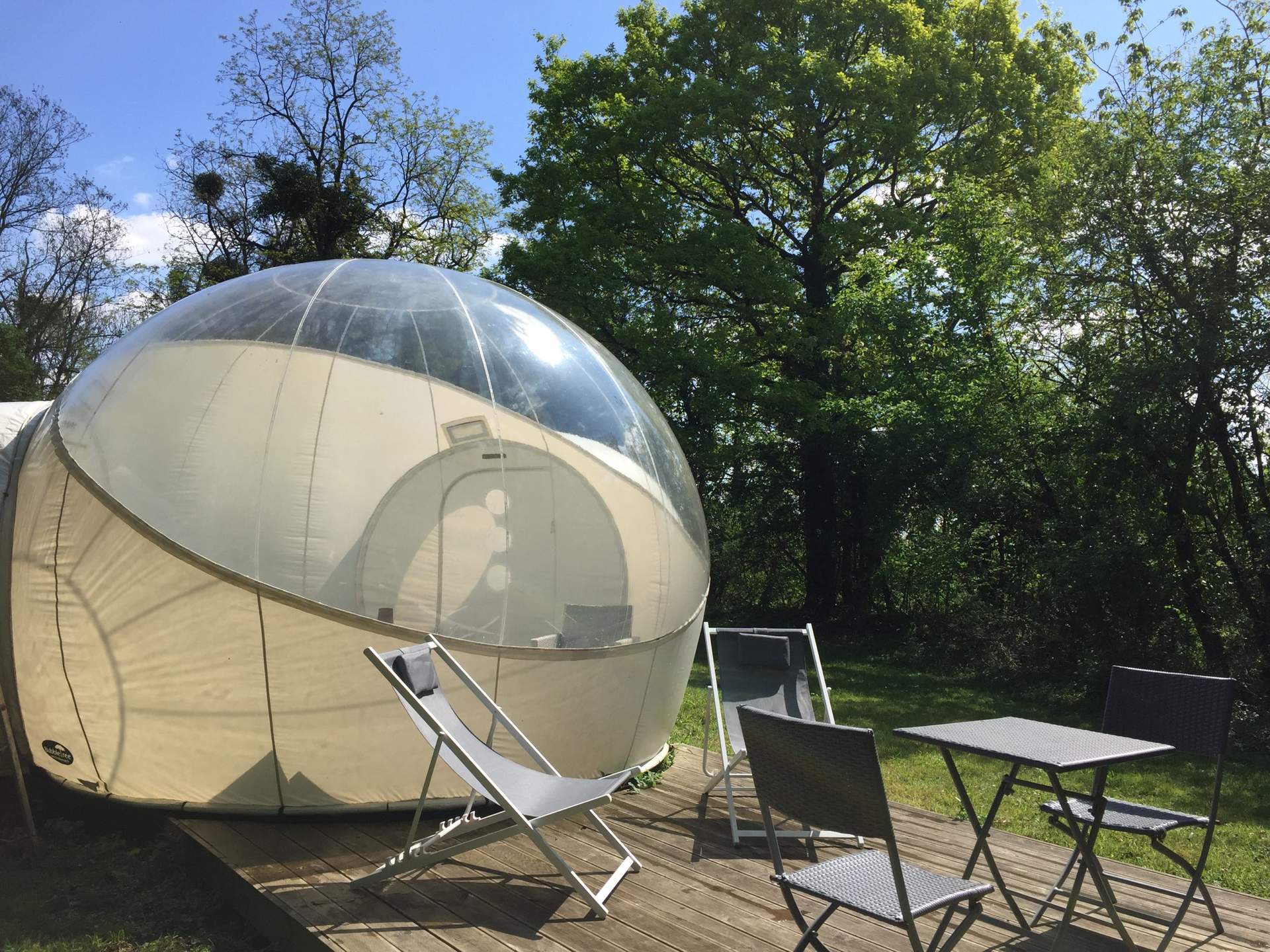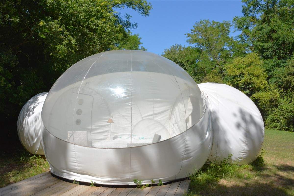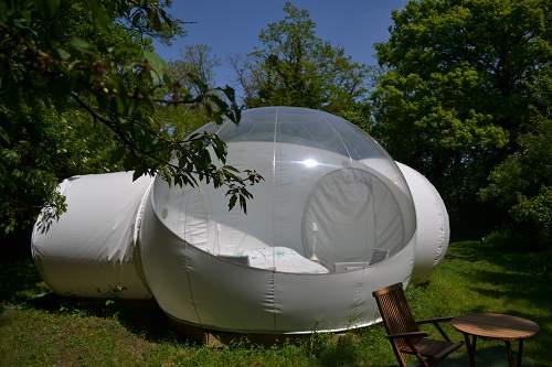 La bubble Star permet de passer une nuit à la belle étoile. C’est un espace d’hôtes plutôt insolite, ultra design, dans un environnement “glamping”. Ce confort décalé dans cet endroit verdoyant offre un spectacle céleste inoubliable. Composée d’un lit double douillet, cette bulle dispose d’un mobilier intérieur contemporain, de toilette sèche écologique, à l’électricité et dispose également d’une terrasse extérieure meublée où vous pouvez savourer petits déjeuners au réveil, dîner au clair de lune… tout est possible sur simple réservation.