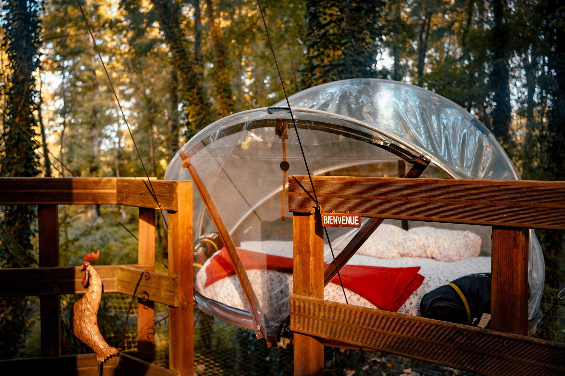 Toutes nos accommodations donnent accès à une gamme d’activités divertissantes qui feront le bonheur des petits et des grands : piscine, trampoline, ping-pong, baby-foot, tir à l’arc, terrains de volleyball, de basketball et de football, ainsi que des karts à pédales. À l’exception de nos bulles hautes, toutes nos unités sont équipées d’un brasero, idéal pour profiter d’un feu de camp chaleureux sous les étoiles et prolonger la magie de vos soirées en pleine nature
