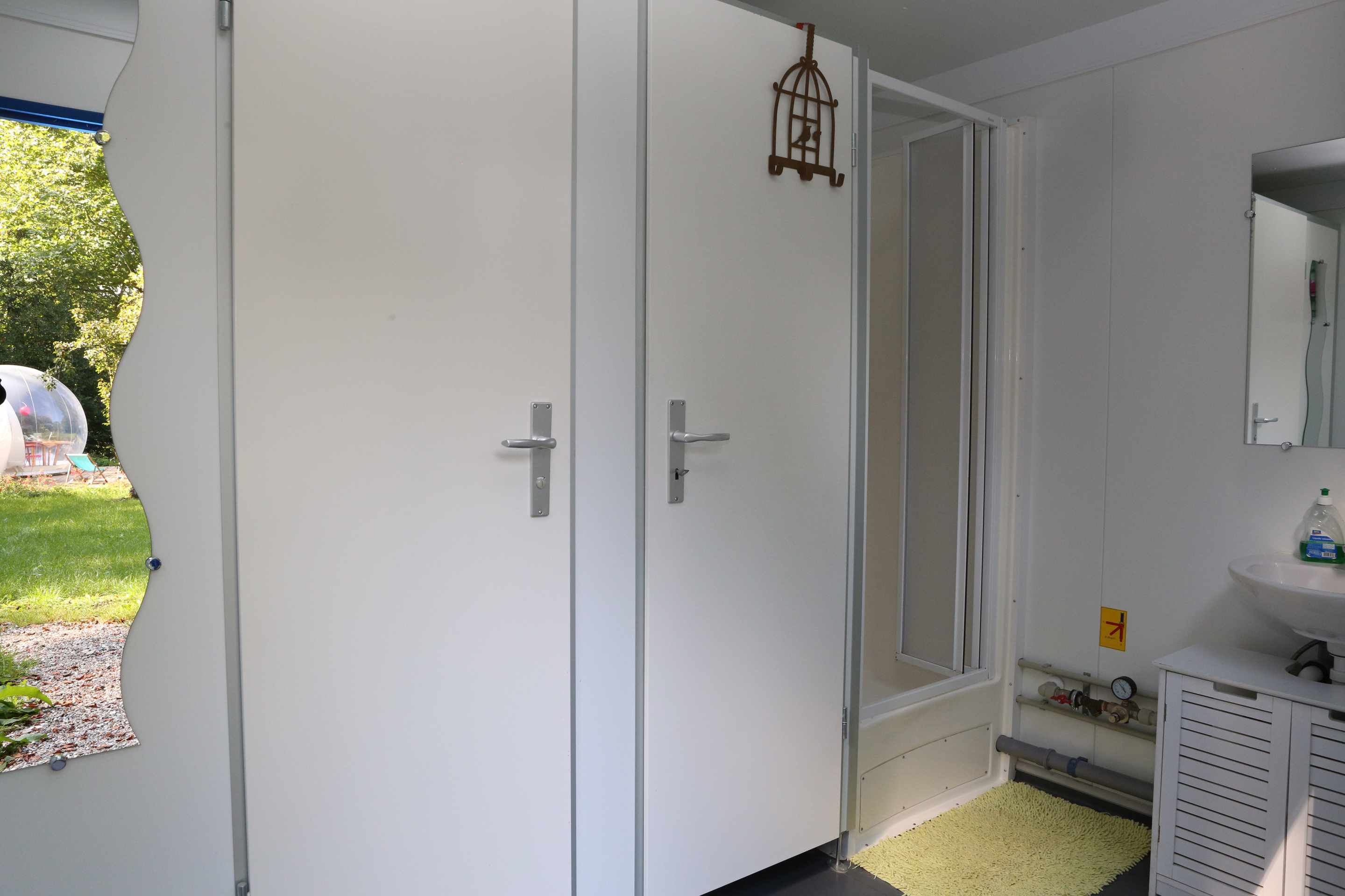 Un salon transparent vous accueille pour prendre vos petits déjeuners et vos repas. Une bouilloire, un micro onde et de la vaisselle  vous permettent de profiter en toute autonomie de votre bulle.  Votre salle de bain privative se trouve à 10 mètres de votre bulle dans le verger.