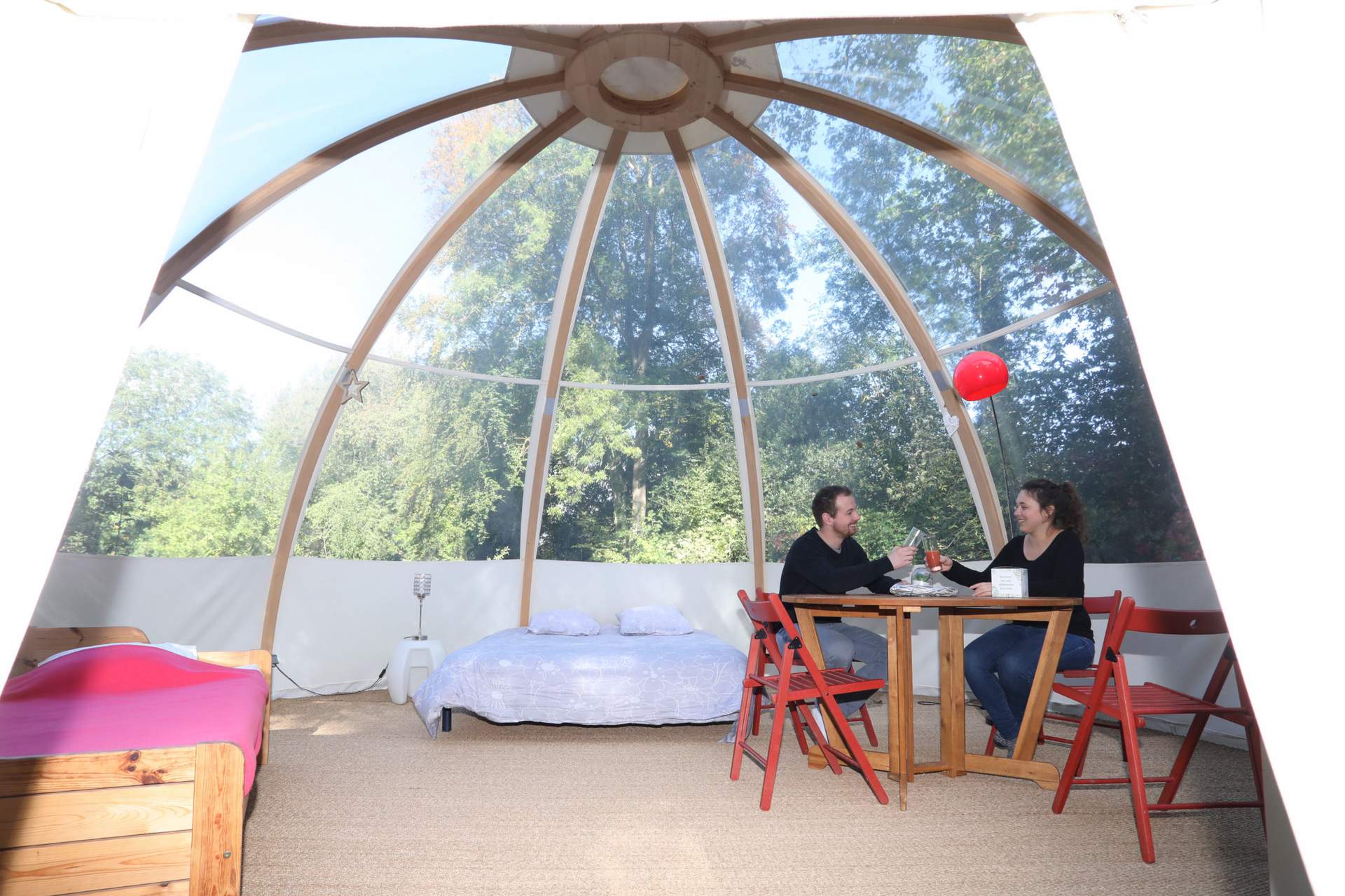 Votre bulle est nichée à l’abri des regards dans le verger aux murs centenaires du manoir des Cacheleux. Vous accédez à votre chambre par un couloir opaque (votre vestiaire). La chambre vous offre une vue panoramique sur le jardin clos.
