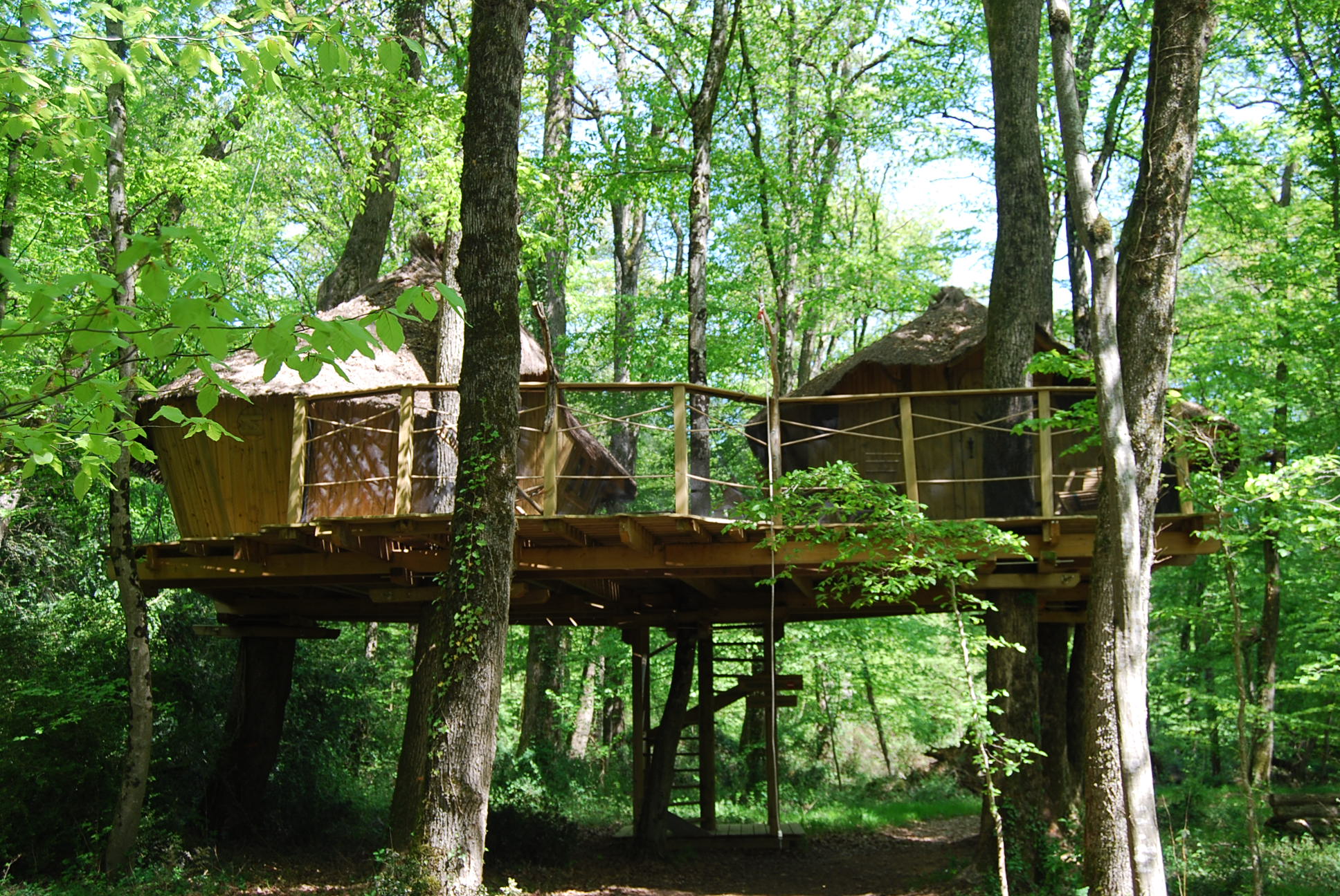 Situées dans les sous-bois, à 5 mètres de haut, nos cabanes 5 personnes sont accessible par un escalier.