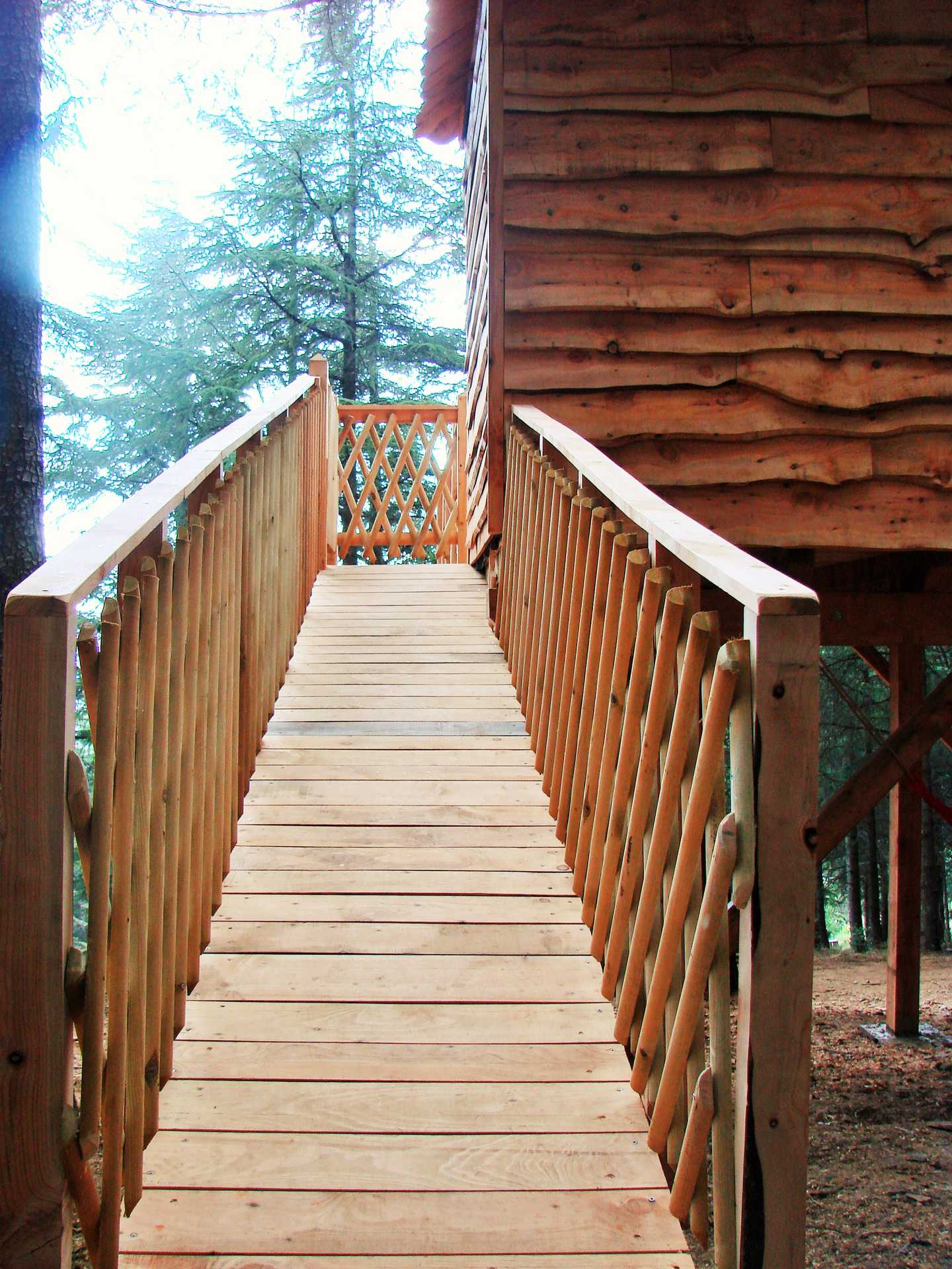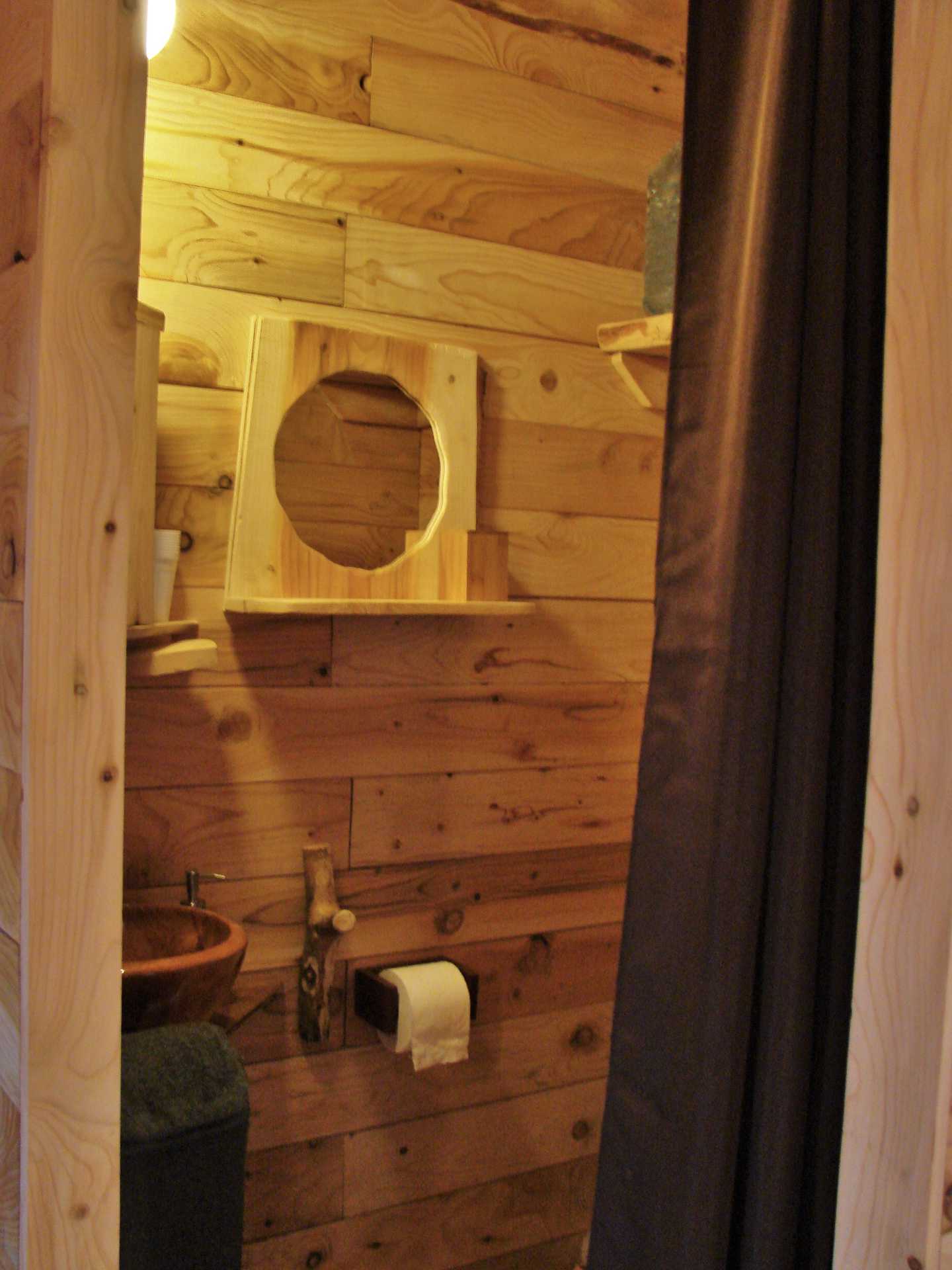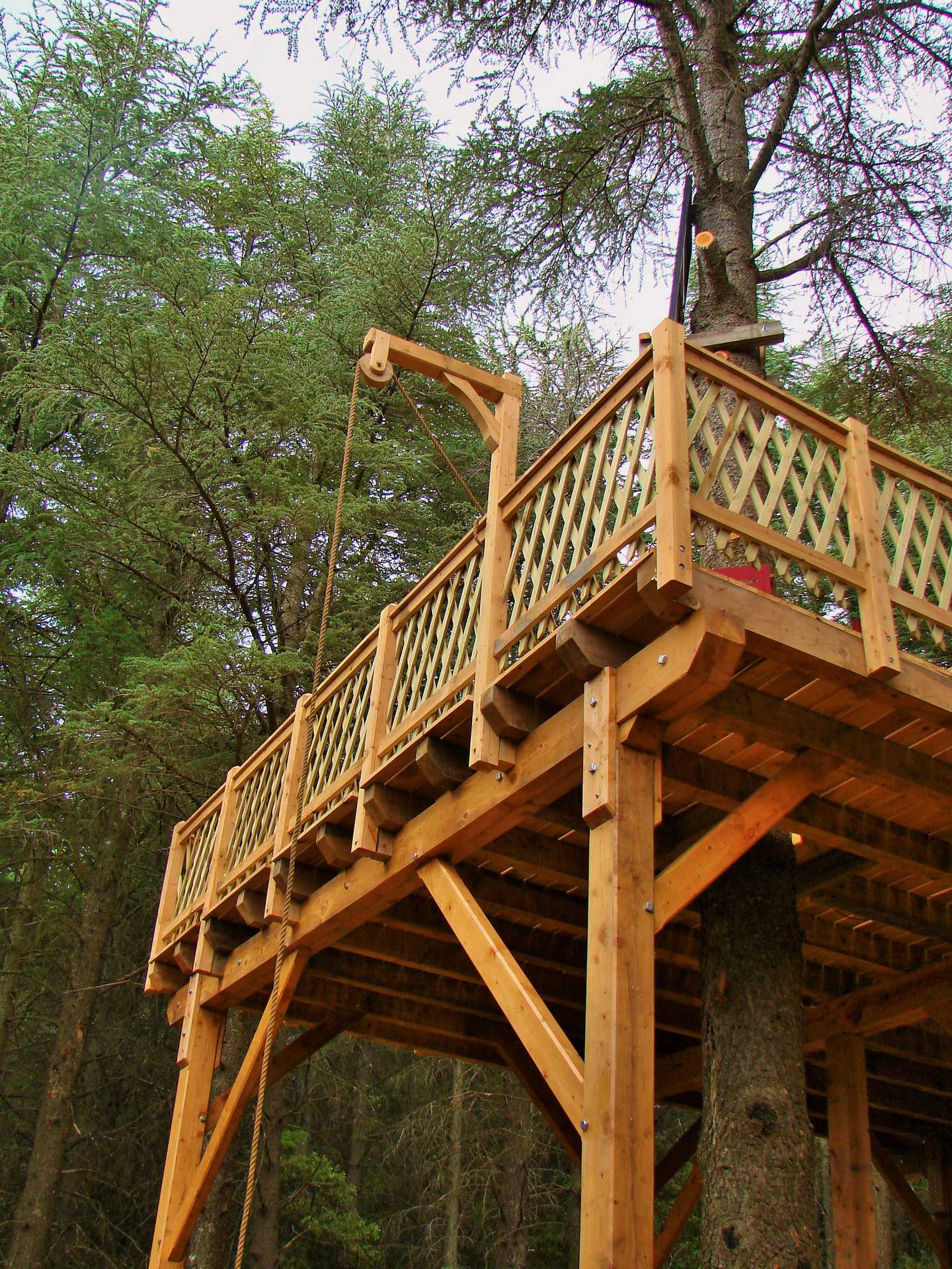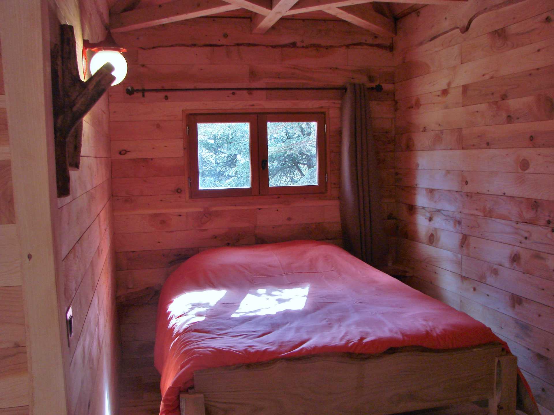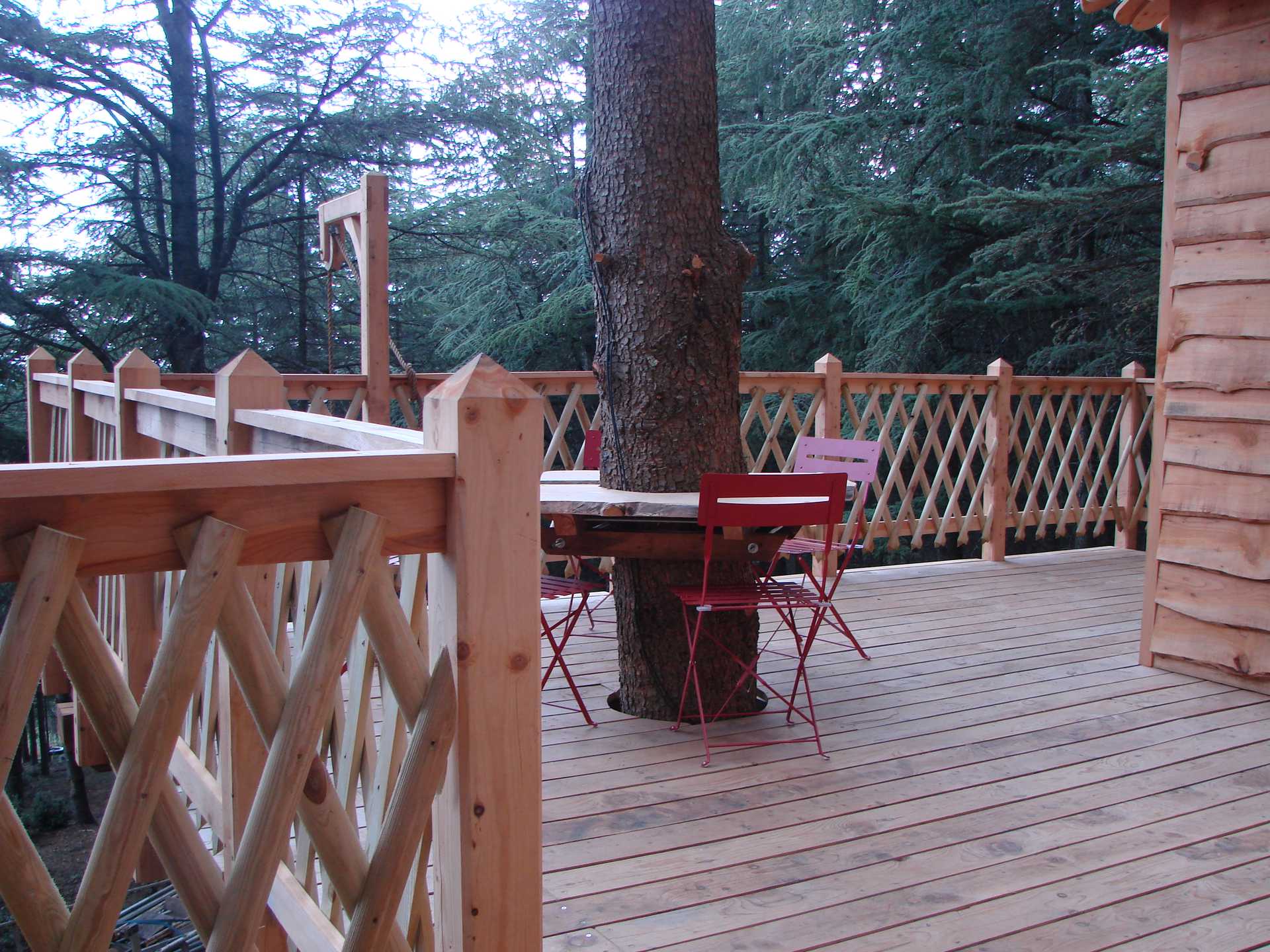 Superbe cabane réalisée en cèdre de l’atlas, isolée avec des matériaux naturels, différente par sa surface  ainsi que sa forme en L , elle peut accueillir jusqu’à 6 personnes, cabane en lien direct avec la nature. Une poulie vous aidera à monter les paniers repas.
