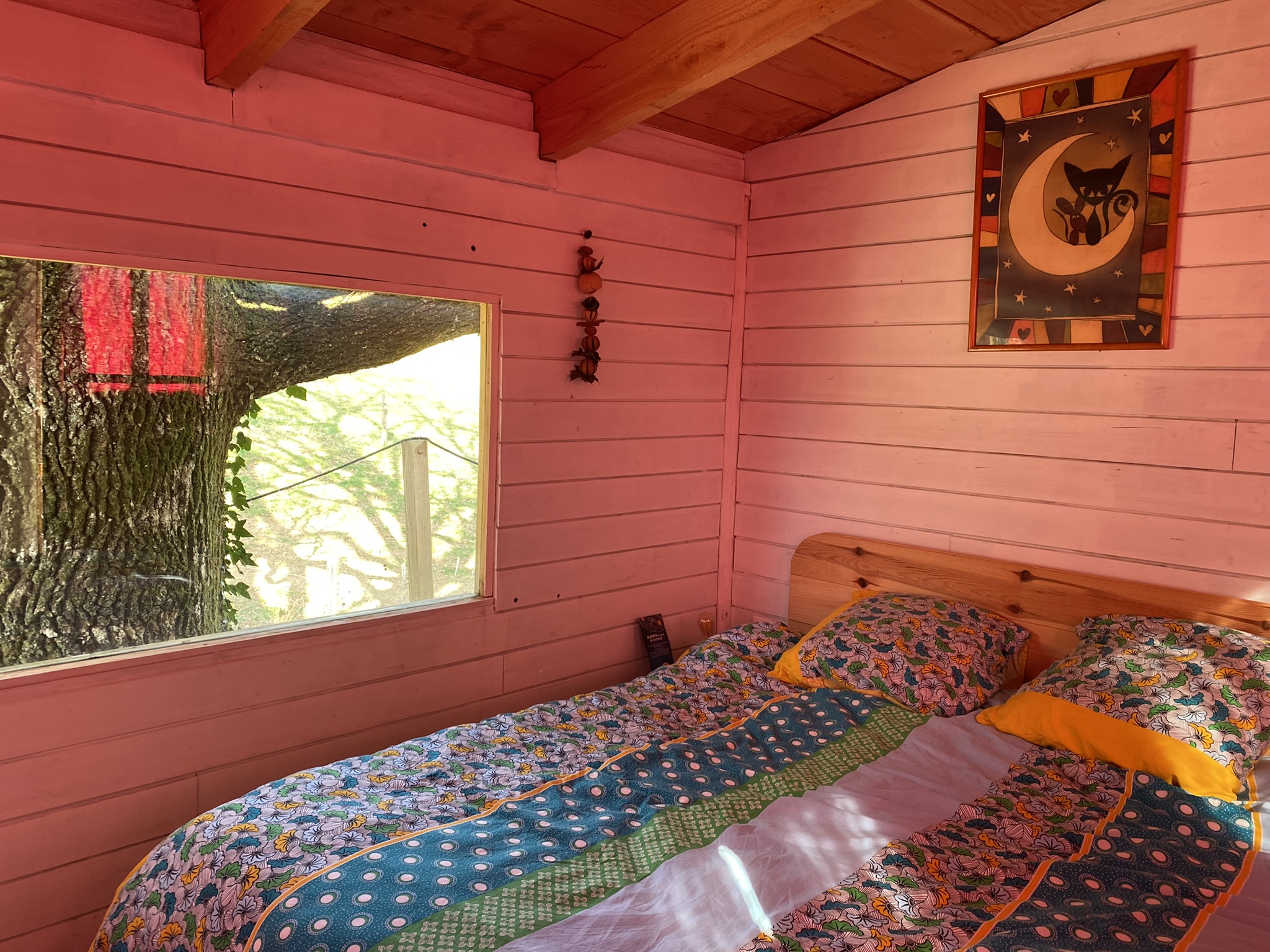 Cette cabane perchée dans un chêne tricentenaire est située en pleine campagne, pas de routes passantes à proximité, vous n’entendrez que les vaches et les oiseaux (parfois un agriculteur passant avec son tracteur pour aller nourrir son troupeau).  Elle offre un chambre avec grand lit et un petit bureau. Tout près, à 10 mètres, un petit bâtiment privatif est équipé d’une cuisine, d’une salle d’eau et de toilettes.