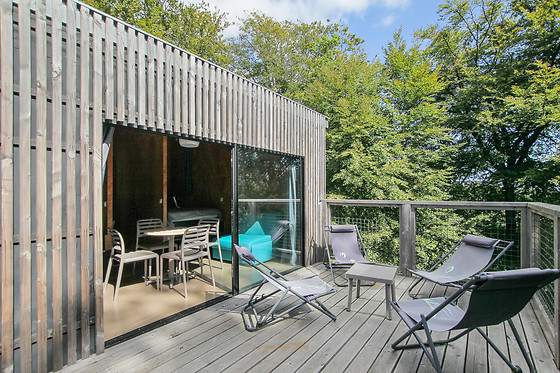 La cabane dans les arbres est un logement insolite en bois moderne proposant de larges ouvertures vers l’extérieur grâce à ses grands portes vitrées coulissantes qui donnent sur une terrasse extérieure de 15m2 équipée en mobilier pour se reposer à l’ombre des arbres ou partager de bons moments entre amis ou en famille.