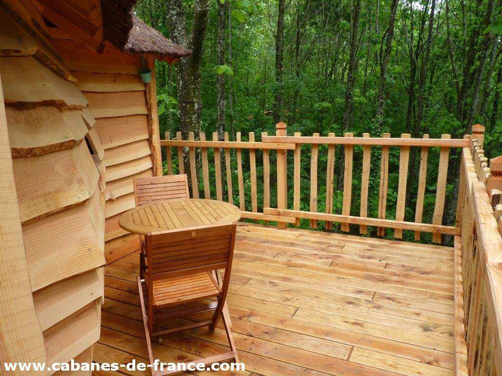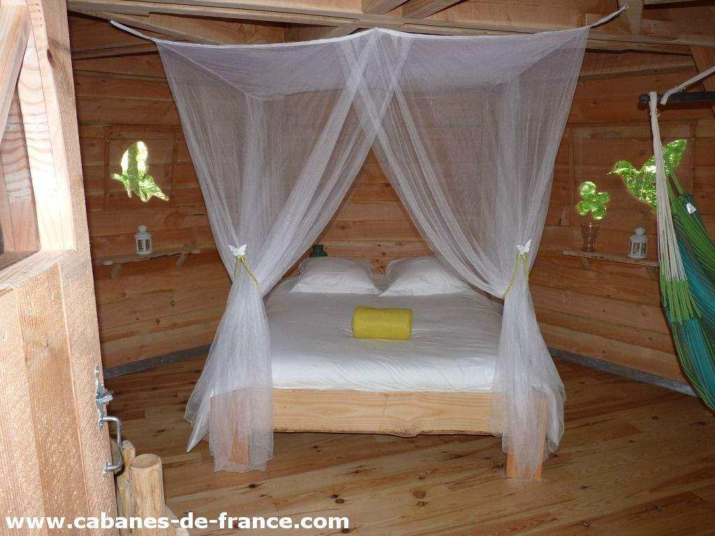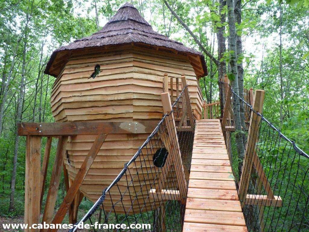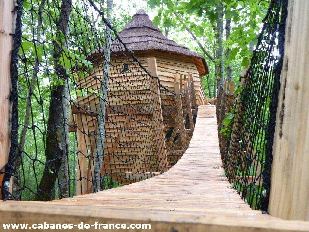 Notre cabane de Kelenn est perchée à 6m de haut. On y accède par un pont suspendue. Elle est composée de 2 niveaux avec une chambre au niveau de la terrasse pour les parents  et un salon dans la partie inférieur avec un accès par un escalier avec trois lits enfants