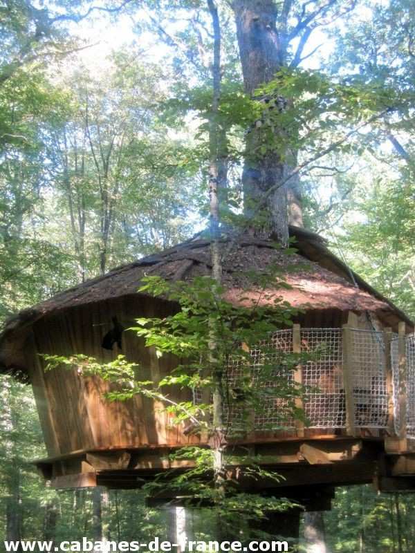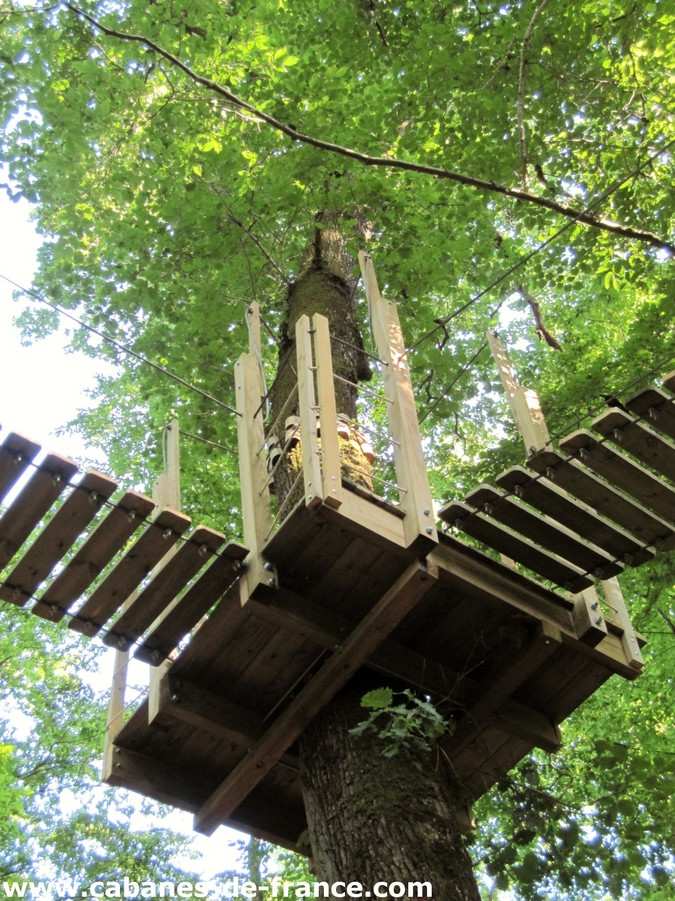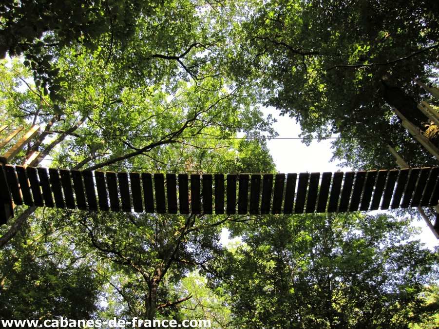 Vous accédez à la cabanes par un escalier et deux passerelles suspendues. Eclairage à la bougie et lampes de camping.