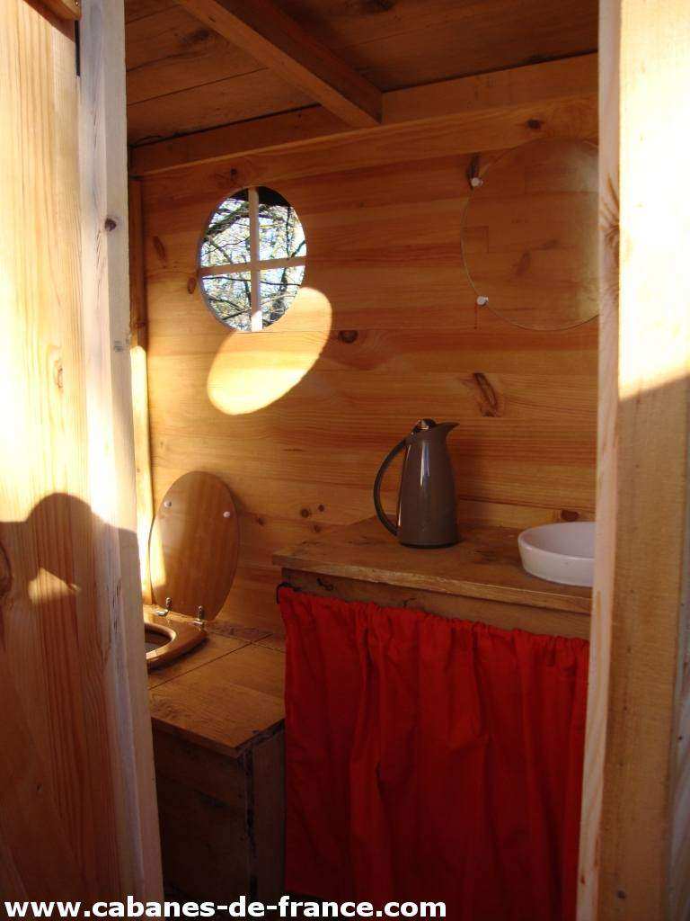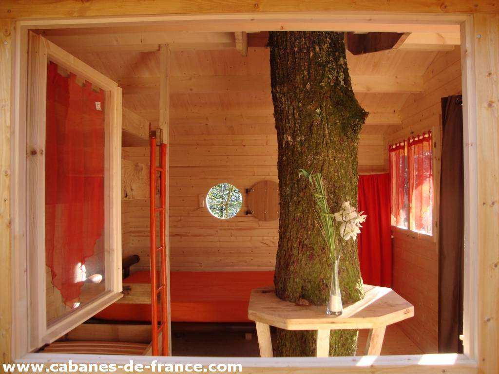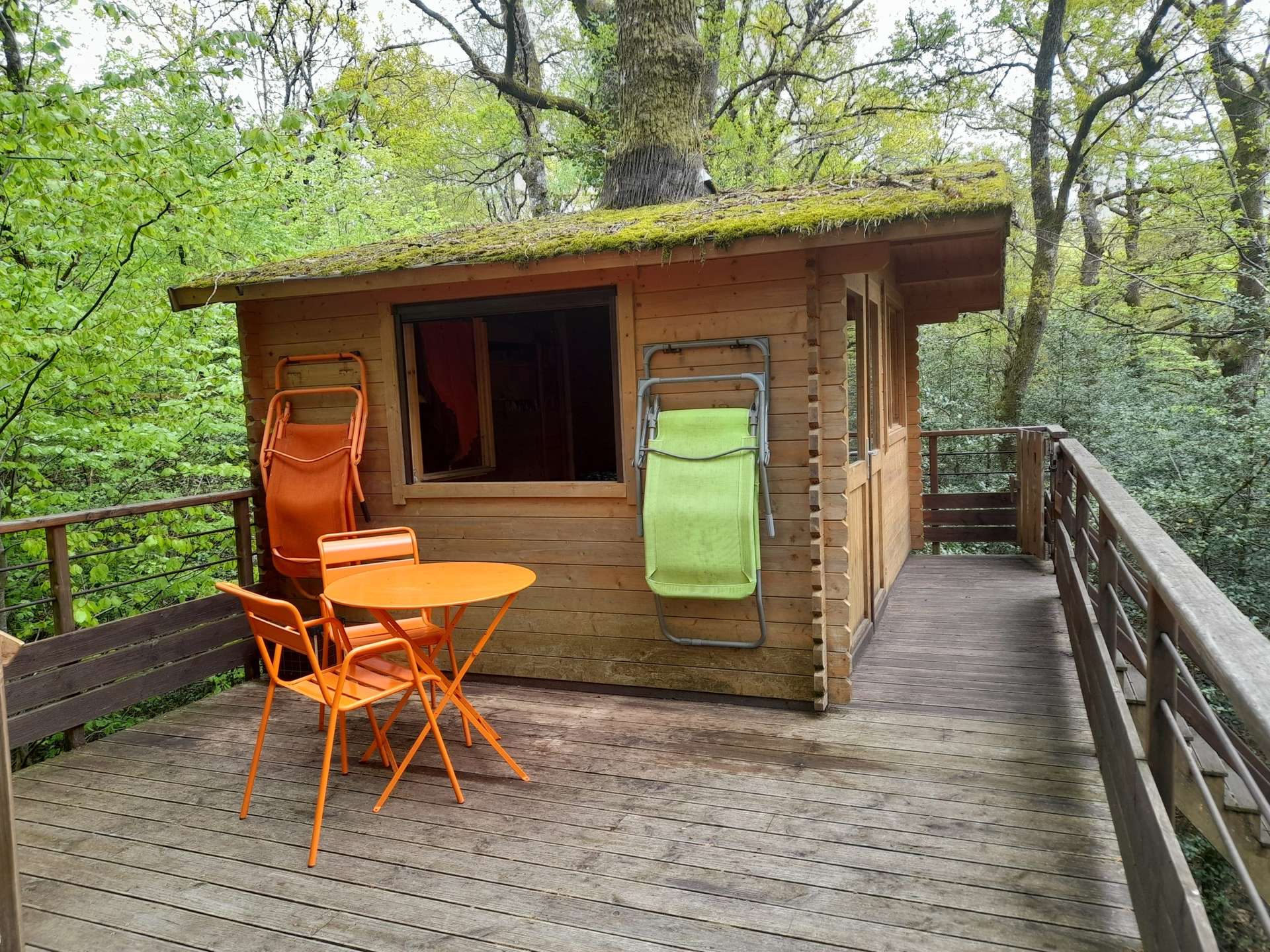 Cabane de 12m² avec terrasse de 20m² équipée d’un salon de jardin. Construite à 8m de haut autour de deux chênes, elle permet l’observation de toute la faune et la flore de la forêt. La cabane dispose d’un couchage pour 2 personnes ainsi que 2 lits superposés pour enfants. Des toilettes sèches et une douche à l’indienne sont à disposition. L’accès à la cabane se fait par un échelle de meunier. Les enfants de moins de 4 ans ne sont pas admis.