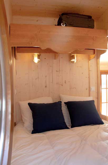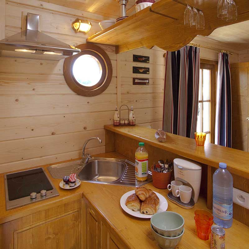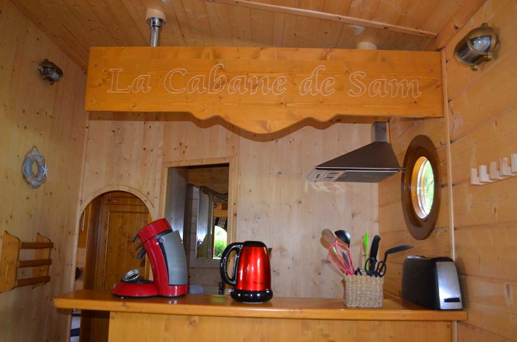 La Cabane de Sam a été pensée pour que chaque recoin ait son utilité. Six personnes peuvent y prendre place avec confort et intimité. Le lit double en alcôve est parfait pour un couple en quête de nid douillet.