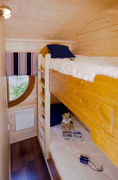 Deux lits simples superposés dans la cabine des moussaillons composent le deuxième espace nuit. Enfin, la banquette du salon se transforme en deux lits gigognes le soir venu !