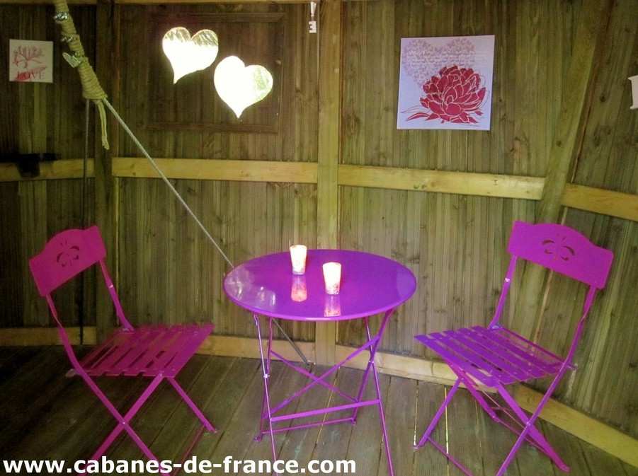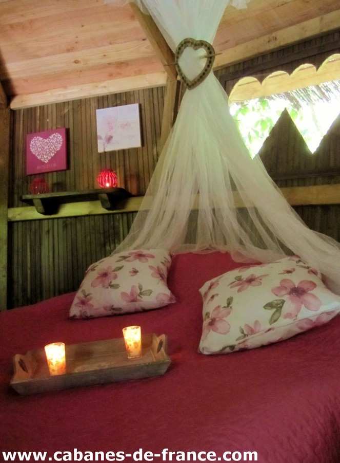Vous accédez à la cabane par un escalier et une passerelle suspendue. Eclairage à la bougie et lampes de camping.