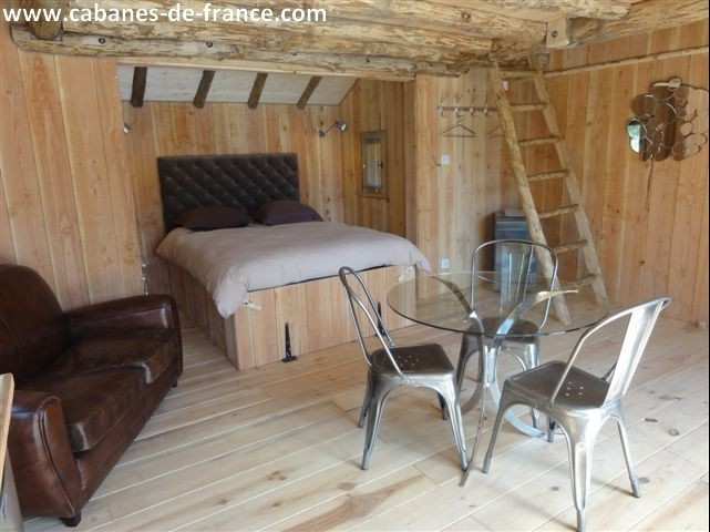 Cette cabane sur pilotis, exposée plein sud, dispose d’une grande baie vitrée pour profiter pleinement de la terrasse ouverte sur l’étang. D’une surface de 60m² (dont 29m² de terrasse), elle peut accueillir jusqu’à 5 personnes (avec trois lits simples sur la mezzanine et 1 lit double dans l’alcôve du salon).