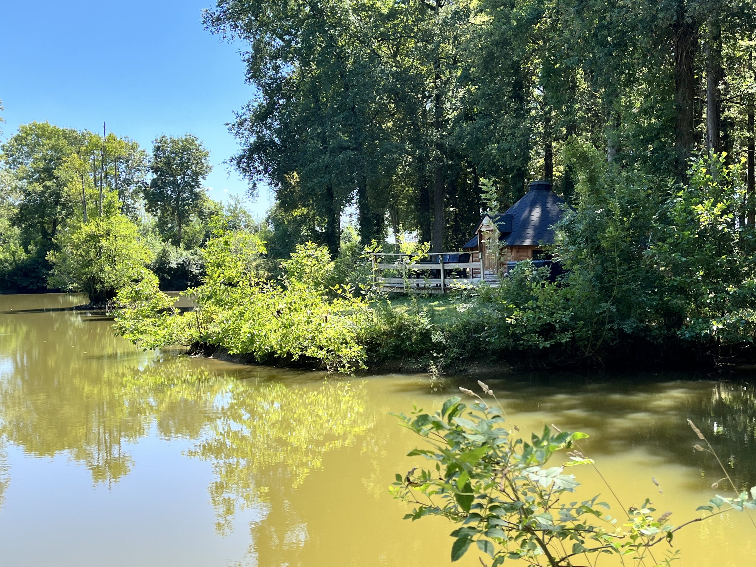 Le kota est situé au bord d’un étang et à la sortie de la forêt, les 2 univers pour une même cabane .