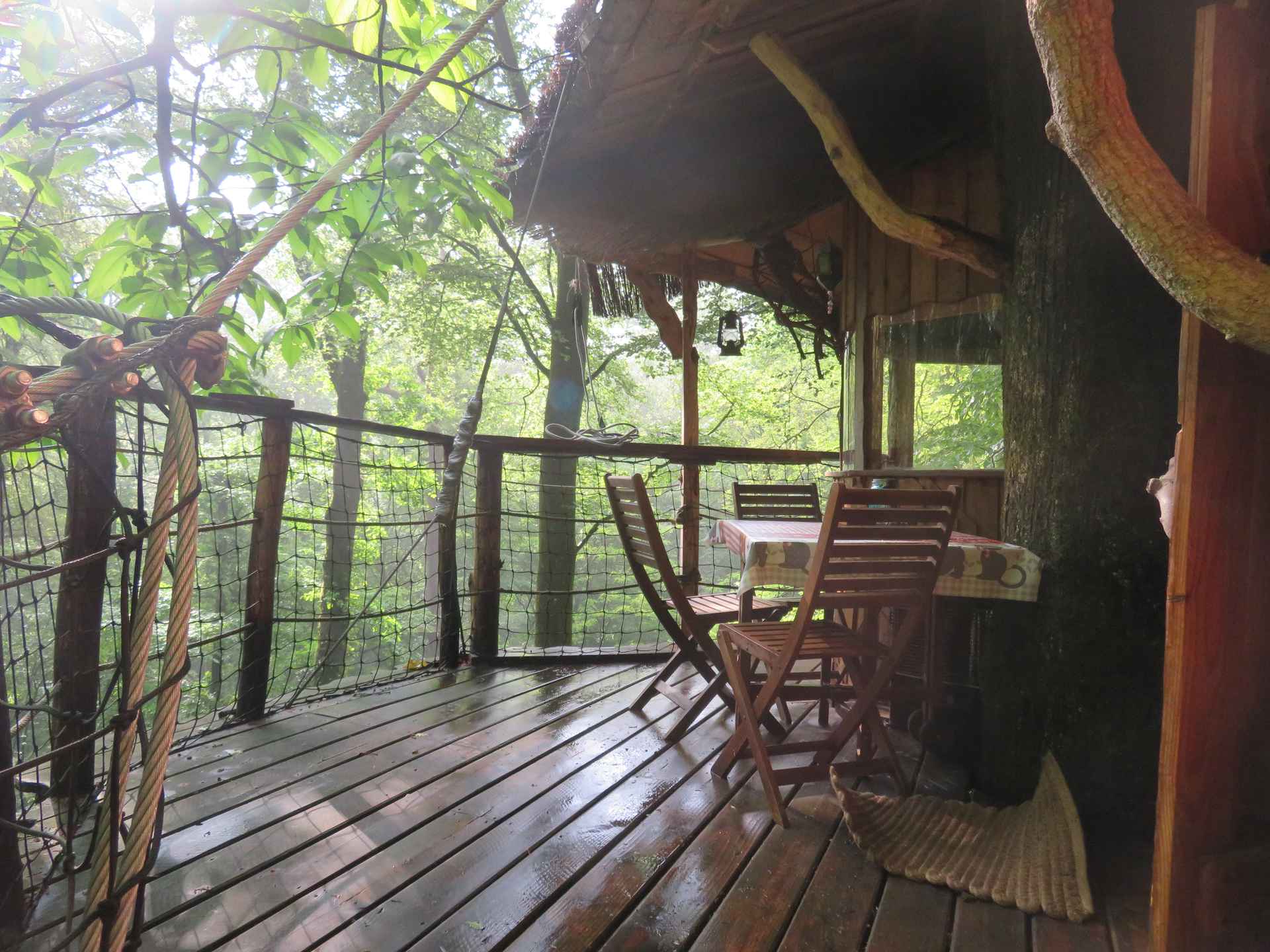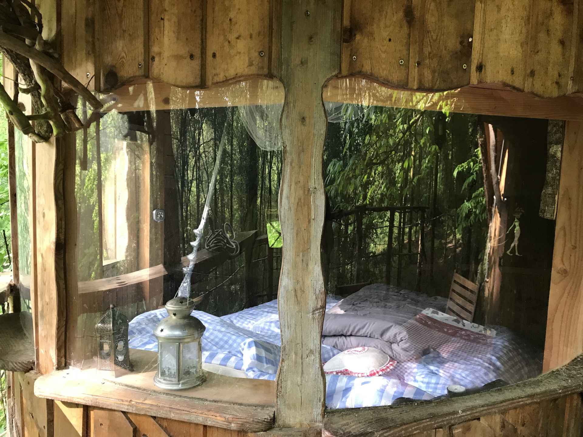 Attention : s’il y a du vent, l’arbre bougera et la vitre à coté du lit grincera et vous montrera que l’arbre et la cabane ne font qu’un.
