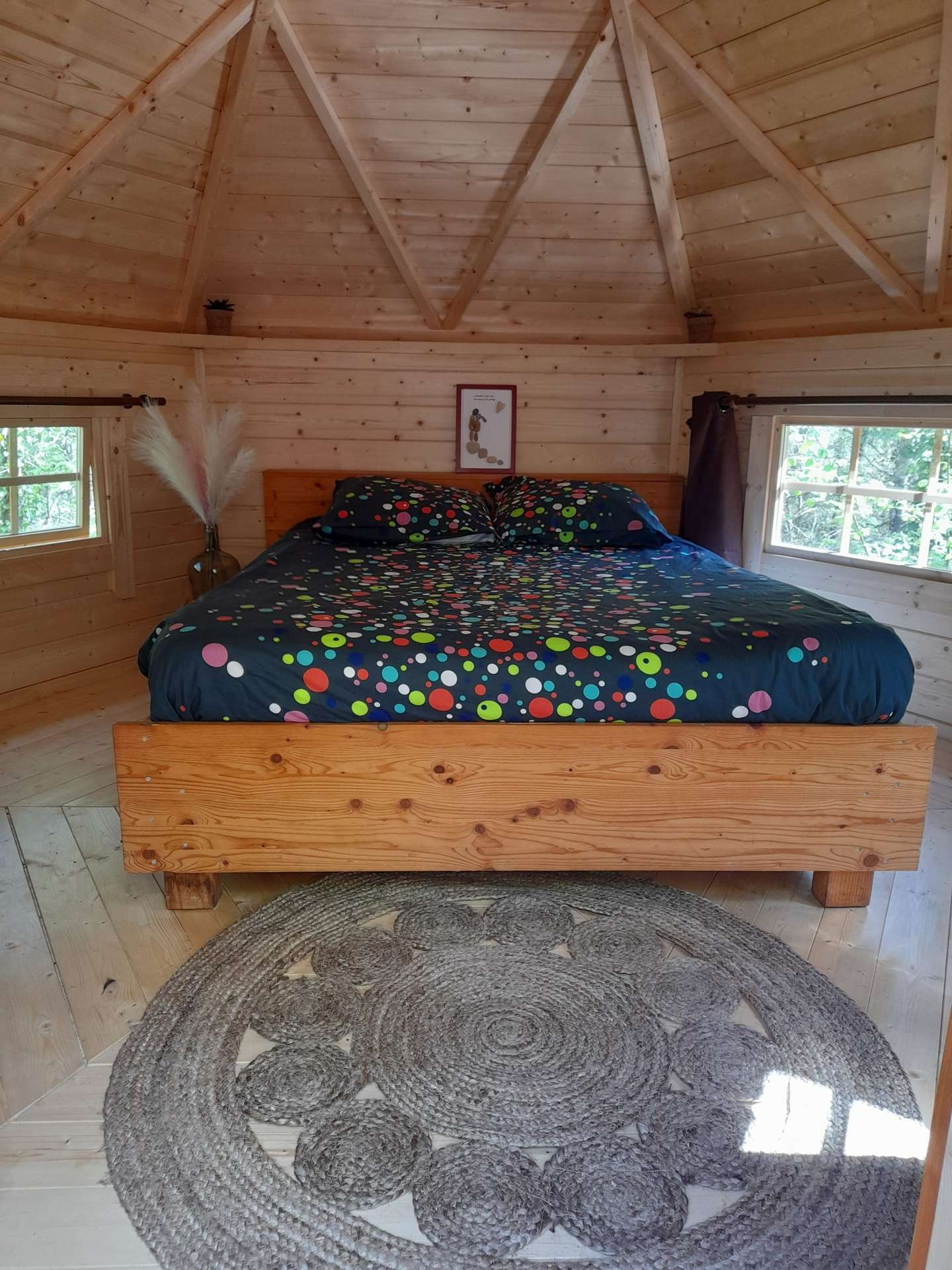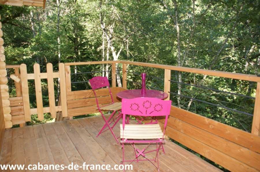 Cabane de 12 m² construite autour d’un chêne à plus de 5 mètres du sol. Vous apprécierez la vue plongeante sur le ruisseau grâce à sa terrasse de 8 m² où vous pourrez savourer le petit déjeuner. Equipée d’un lit double, de toilette sèche et du nécessaire pour faire sa toilette. L’accès se fait par un escalier de meunier.