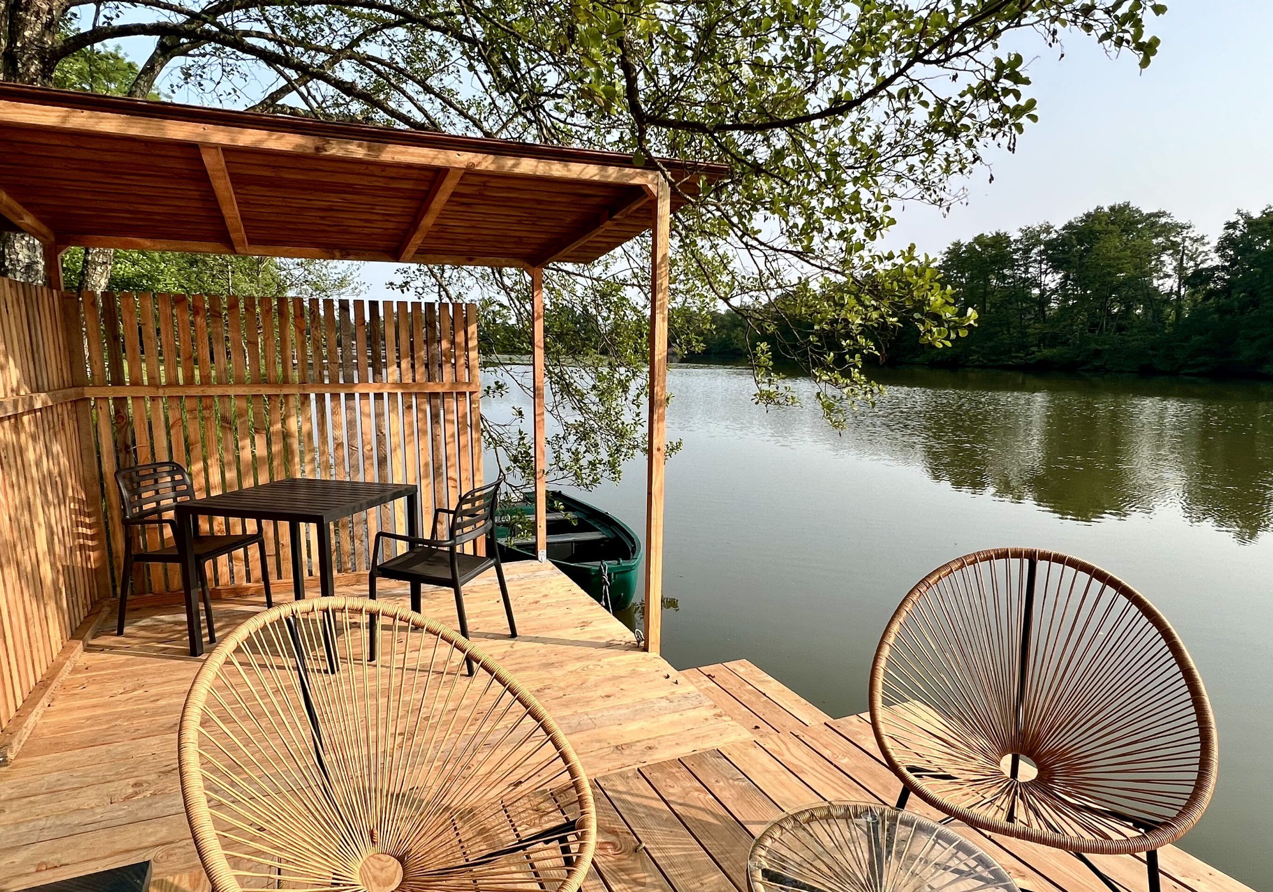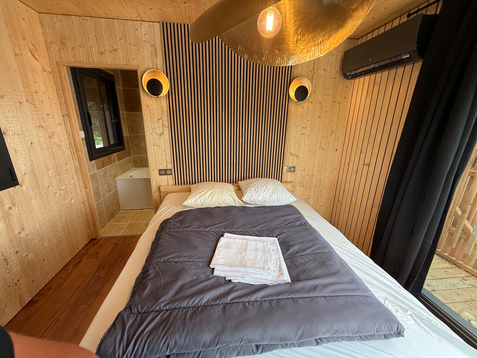 La nouvelle cabane Ecrin située au bord de l’étang, peut accueillir jusqu’à 2 personnes pour un parenthèse enchantée. Toute équipée pour votre confort, avec une clim. Profitez de la vue imprenable sur l’étang depuis votre terrasse couverte.
