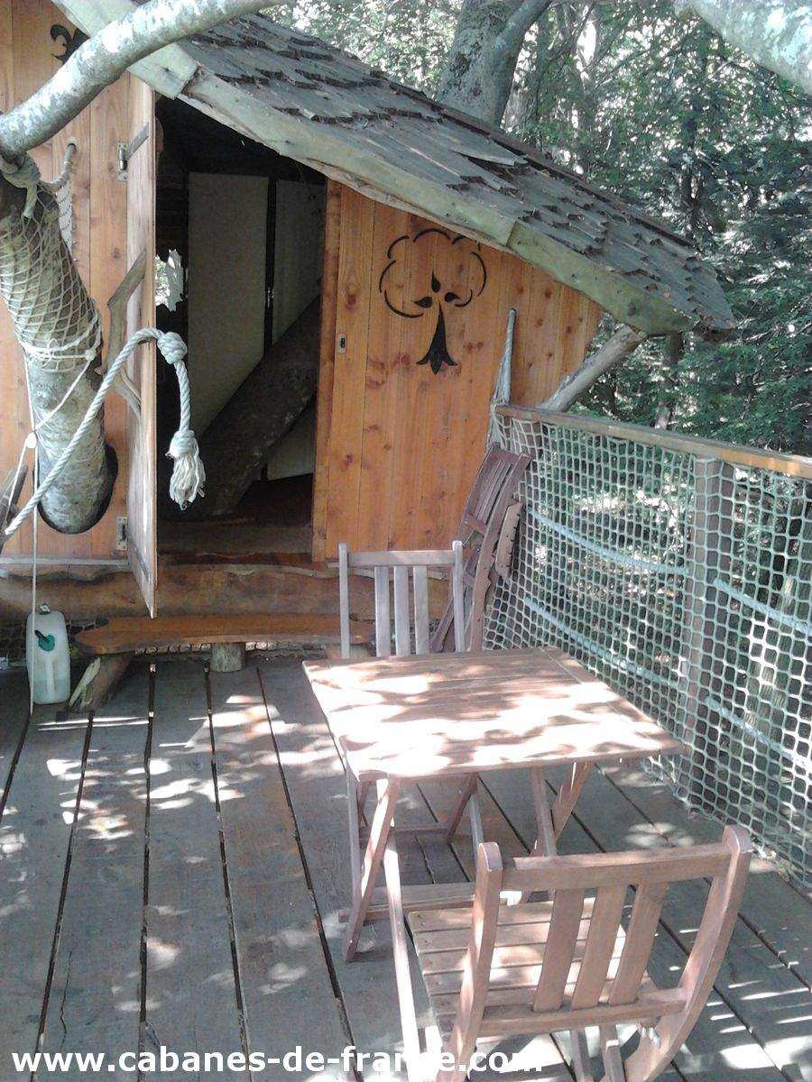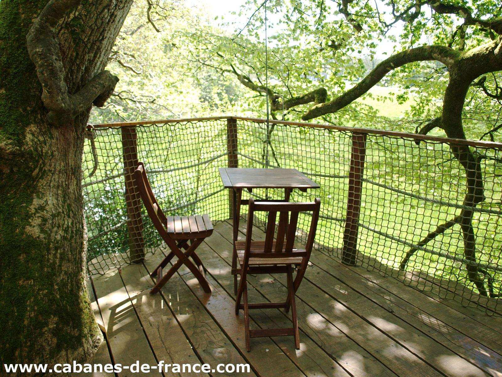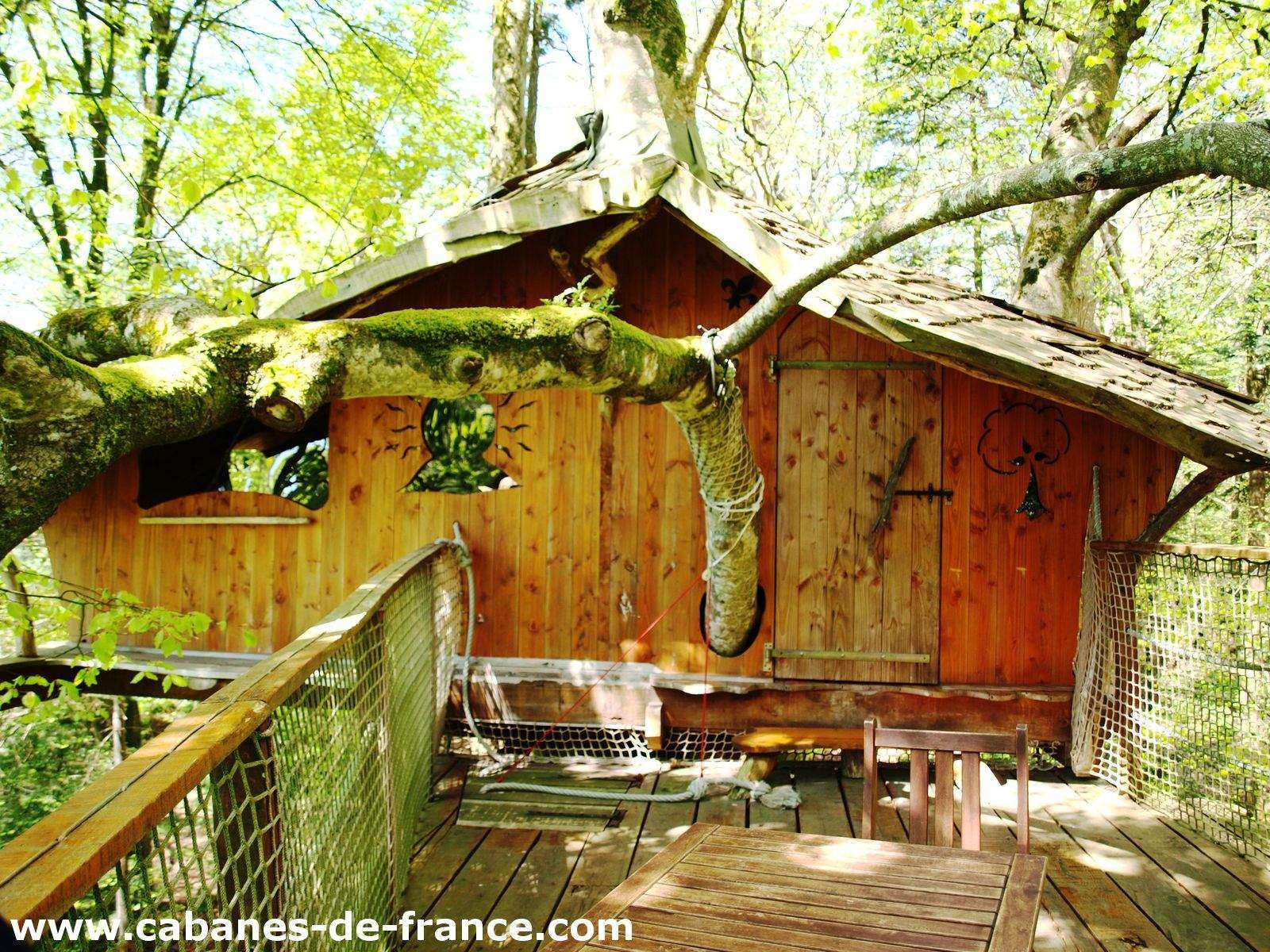 Solidement installée entre un magnifique hêtre et un chêne majestueux, la cabane « Jonquille » peut accueillir une famille avec des enfants à partir de 2 ans.  Son accès est donc facile, un escalier permet d’y grimper, puis on arrive directement sur la grande terrasse à 6 mètres de haut. A l’intérieur, un grand lit double et deux lits futons permettent d’y loger sous le même toit. Tables et chaises pour tous, toilettes sèches, réserve d’eau, lits faits à l’arrivée. Le matin, comme dans chacun de nos hébergements, votre petit déjeuners vous y sera livré vers 9 h, accroché à la corde.