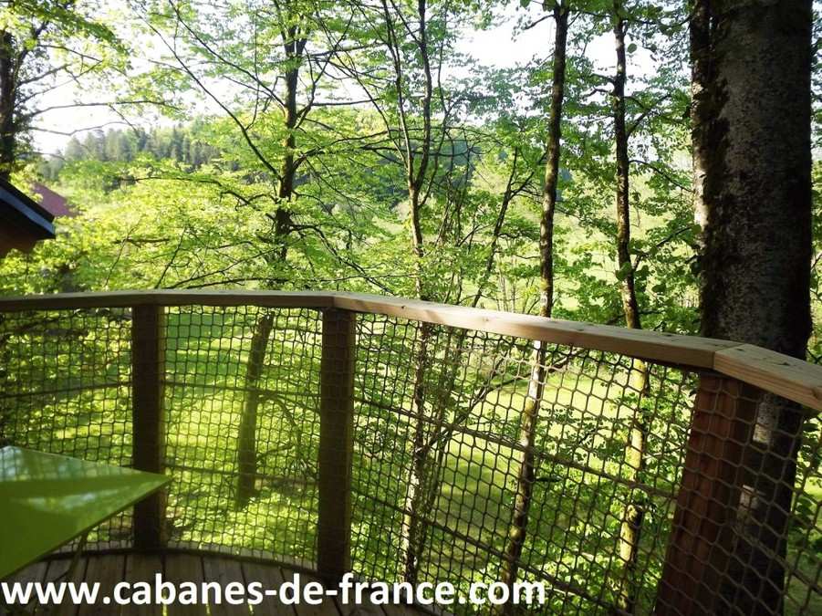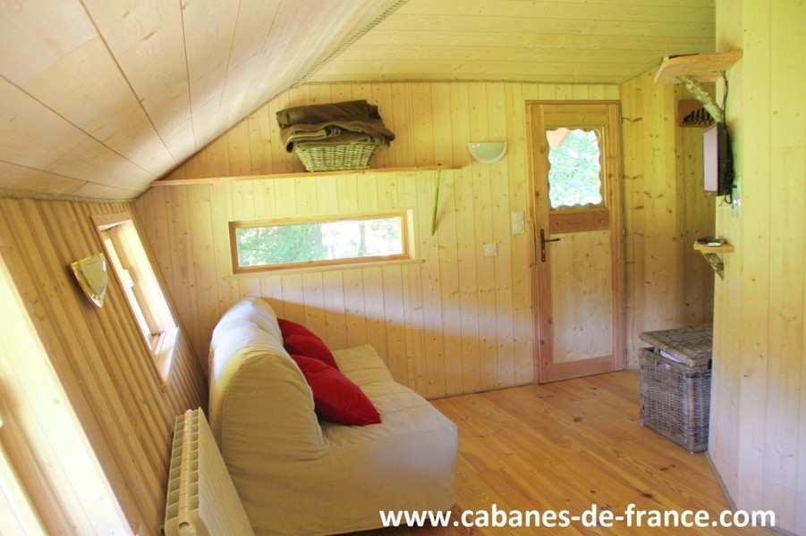 Cabane de presque 30 m² dont une grande terrasse de 5m² en surplomb de 15 m sur le parc et sa rivière, portée par un hêtre à 7m de haut, accessible par escalier et passerelle et aménagée en gîte tout confort (salle de bains, lavabo, douche, wc, eau froide/eau chaude, cuisinette tout équipée, isolation et chauffage électrique, connexion Internet SDSL 2 Mbits/sec par câble fourni disponible).