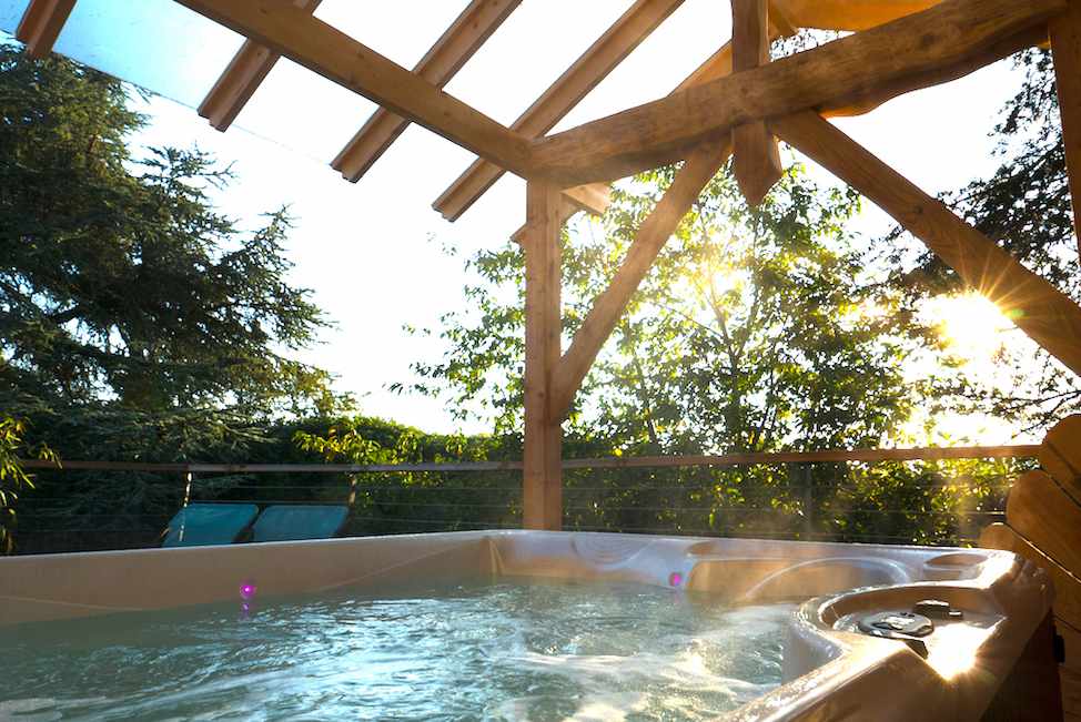 Une terrasse ouvrant sur la prairie où paissent des chevaux blancs… une autre terrasse accueillant un jacuzzi privatif à 37° toute l’année… un grand lit face à une fenêtre offrant le panorama calme et serein d’une nature apaisante… une vue sur le château… la douceur du soir et le régal du petit déjeuner chaud servi dans un panier et monté par une poulie… les charmes d’une évasion où le temps suspend son vol…