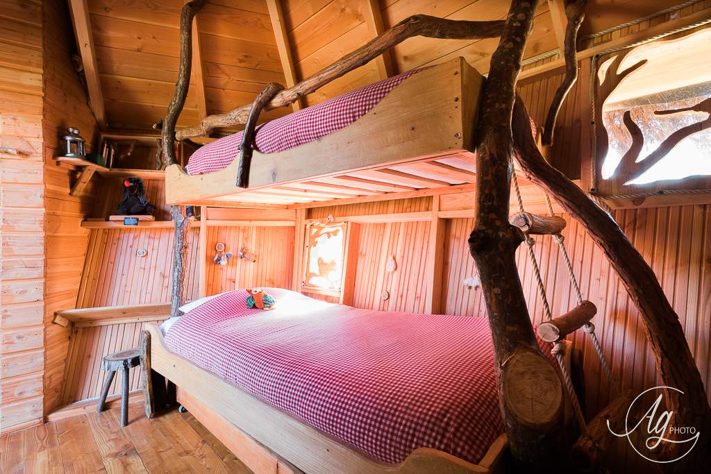 La cabane s’accroche dans la fourche d’un chêne majestueux de près de 200 ans. D’une capacité de 4 personnes + 1 enfant (un grand lit, deux lits superposés + un lit junior d’appoint) , elle est conçue pour une découverte en famille ou entre amis, un moment partagé de convivialité et d’aventure. Son accès se fait par une rampe inclinée adaptée à tous (poussettes, PMR accompagnée) .