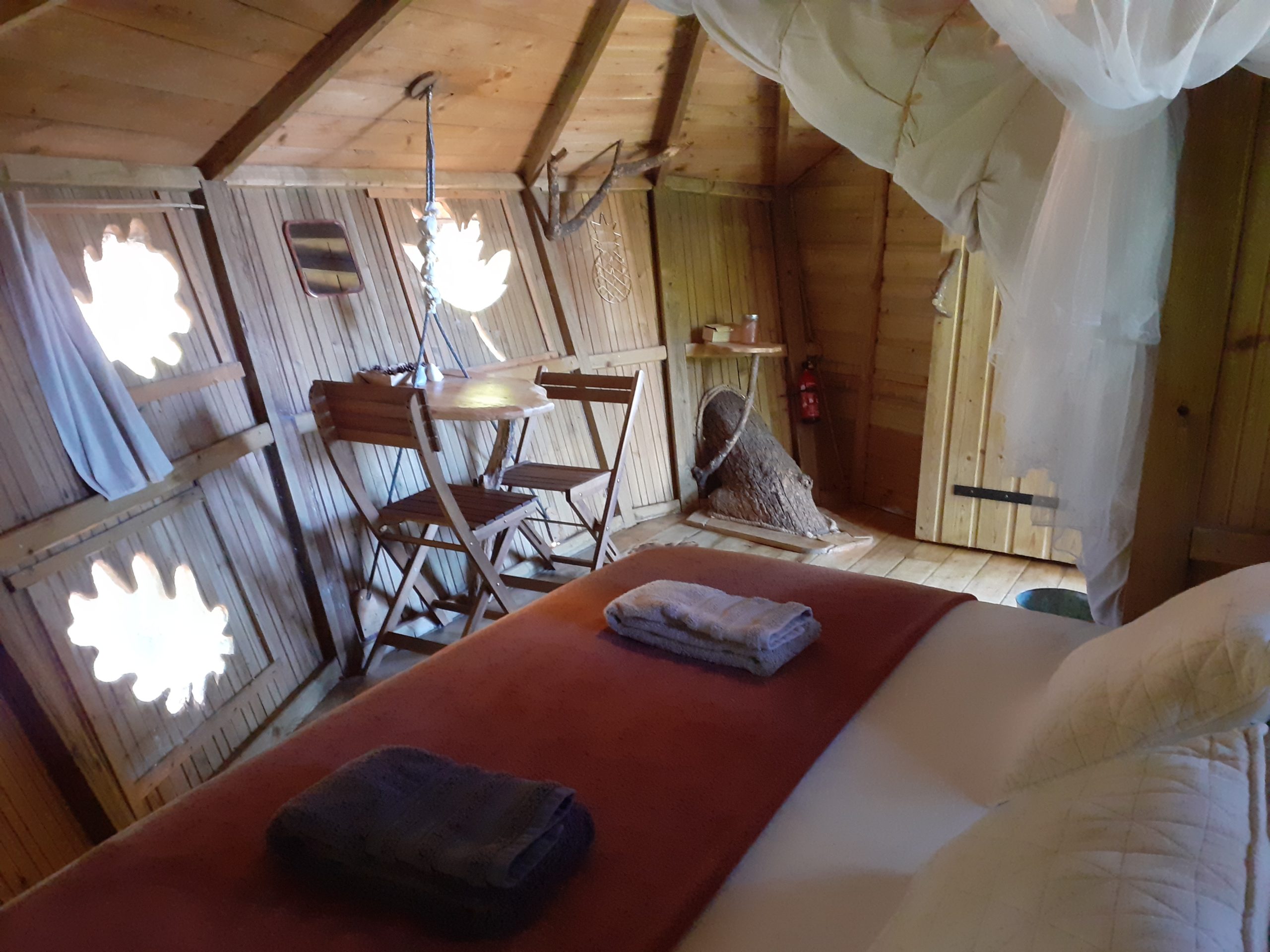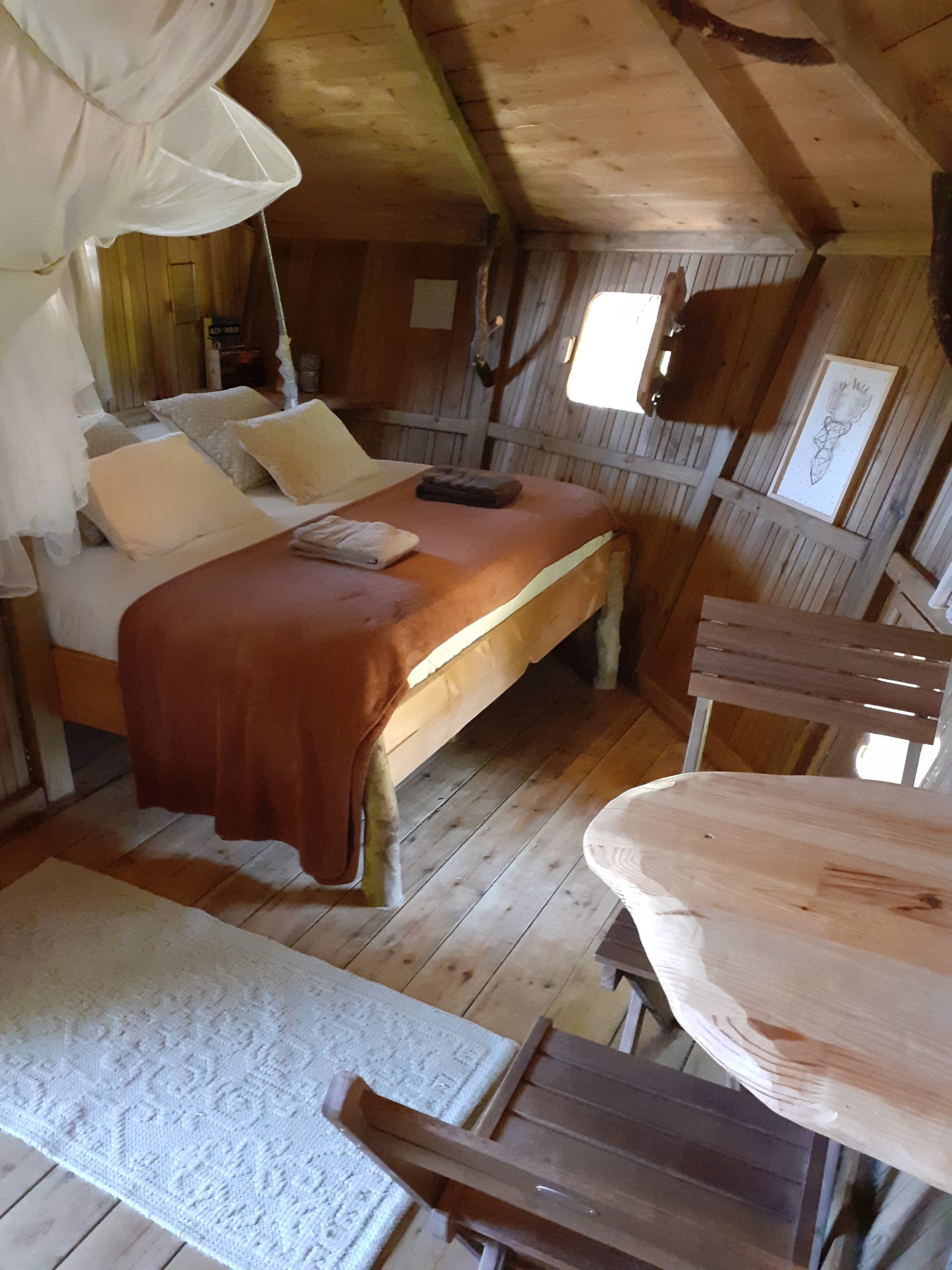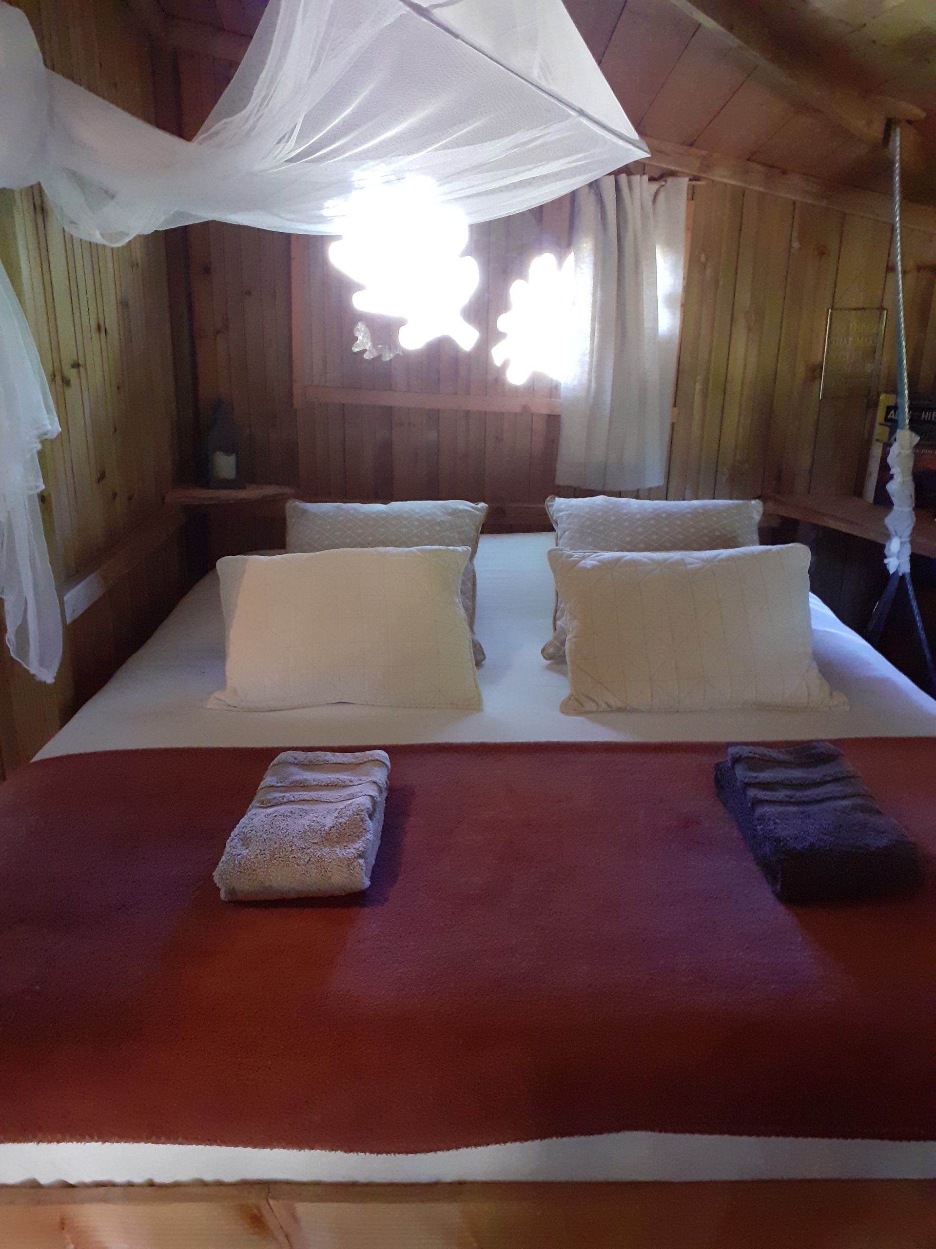 Cette cabane peut accueillir 2 personnes. Elle contient un lit double et une terrasse donnant sur le parc. Disposée à 9 mètres de hauteur, elle est idéale pour les amoureux d’aventure tout en restant extrêmement sécurisée avec des portillons, des rambardes et des filets. Elle accepte donc les enfants à partir de 12 ans.