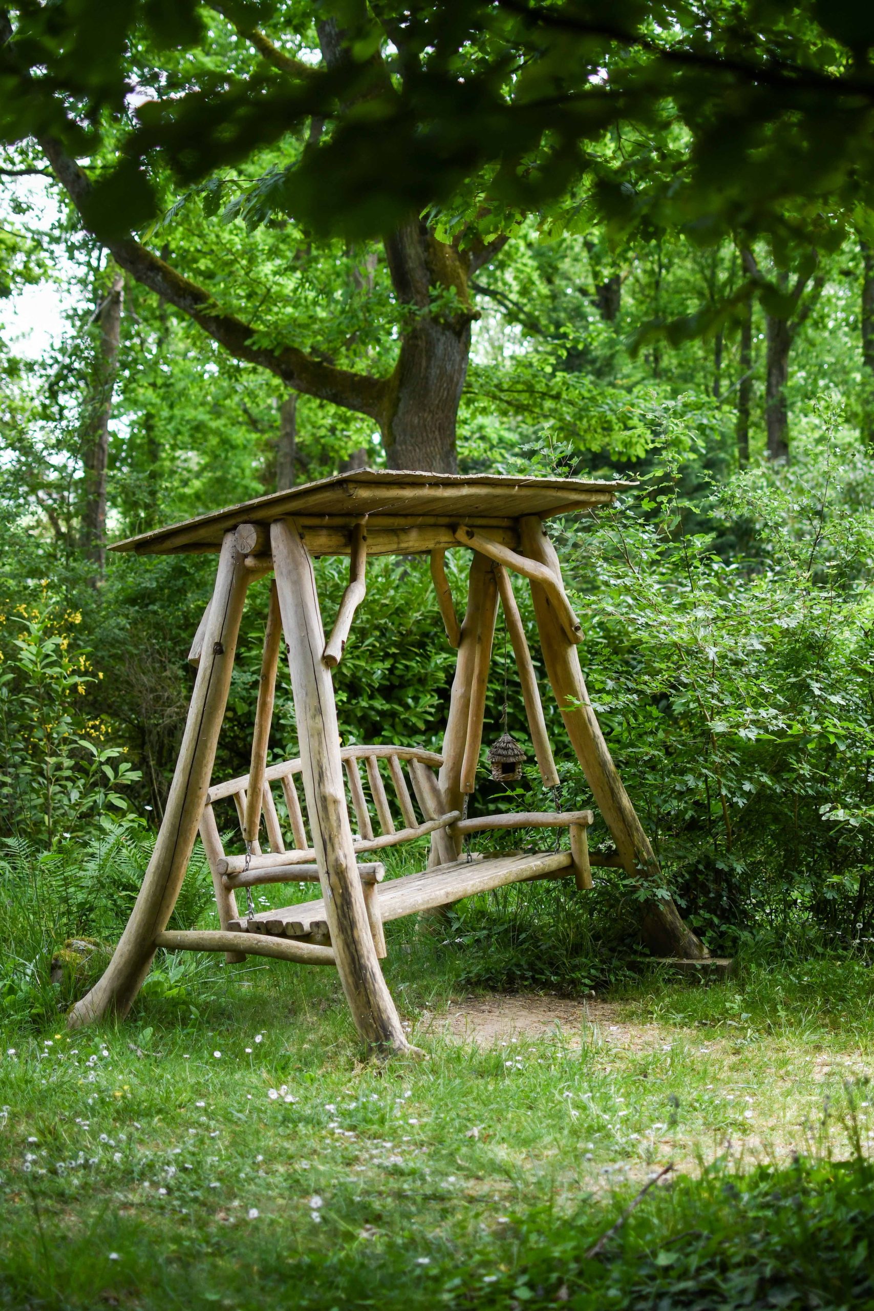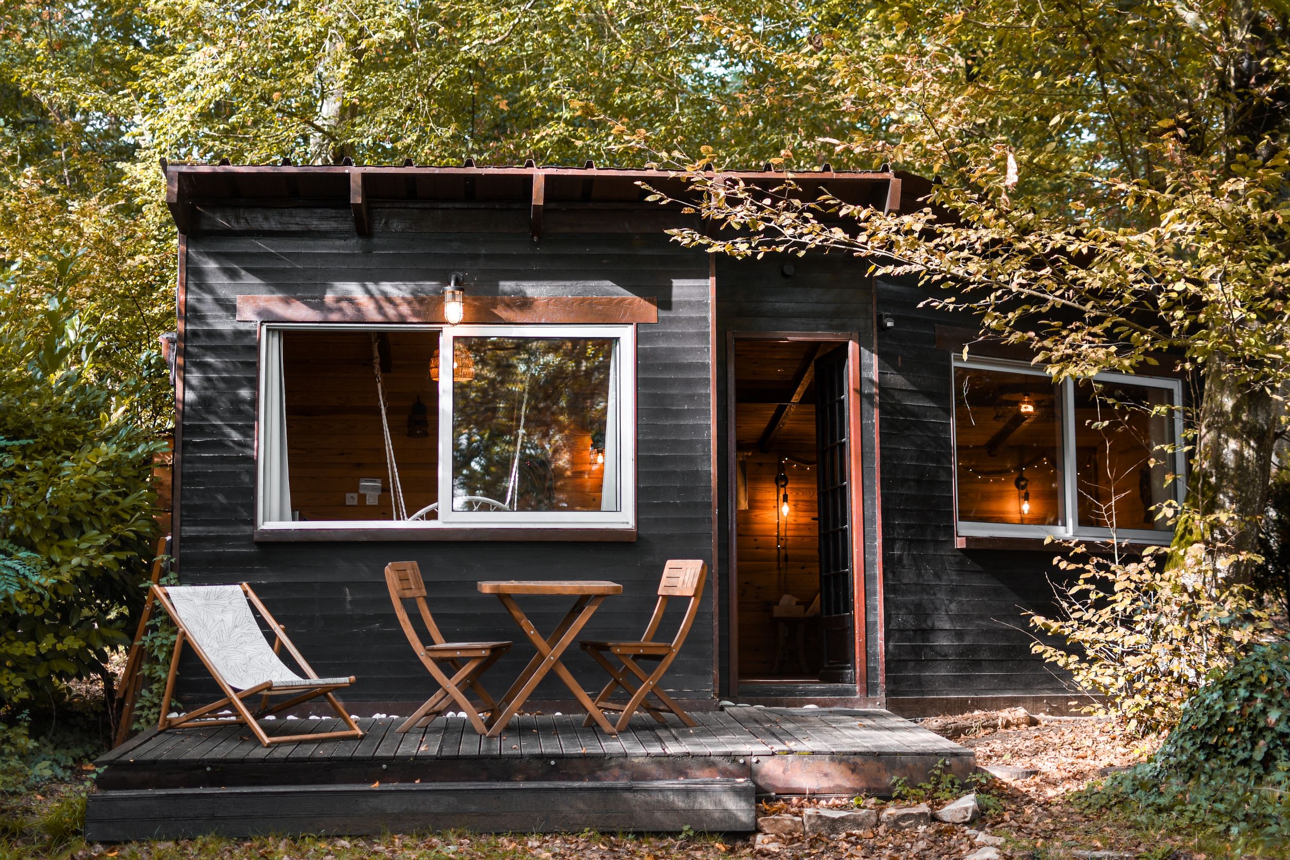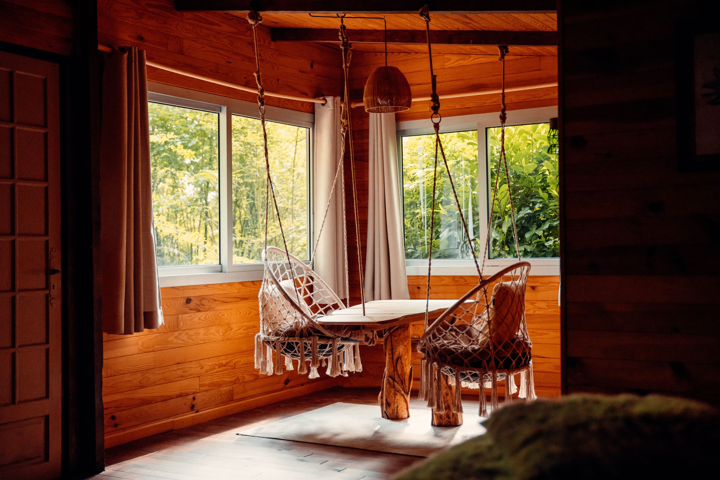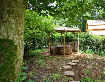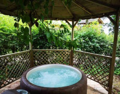 On aime : la balancelle et le jacuzzi privé dans le jardin de la cabane pour se la couler douce