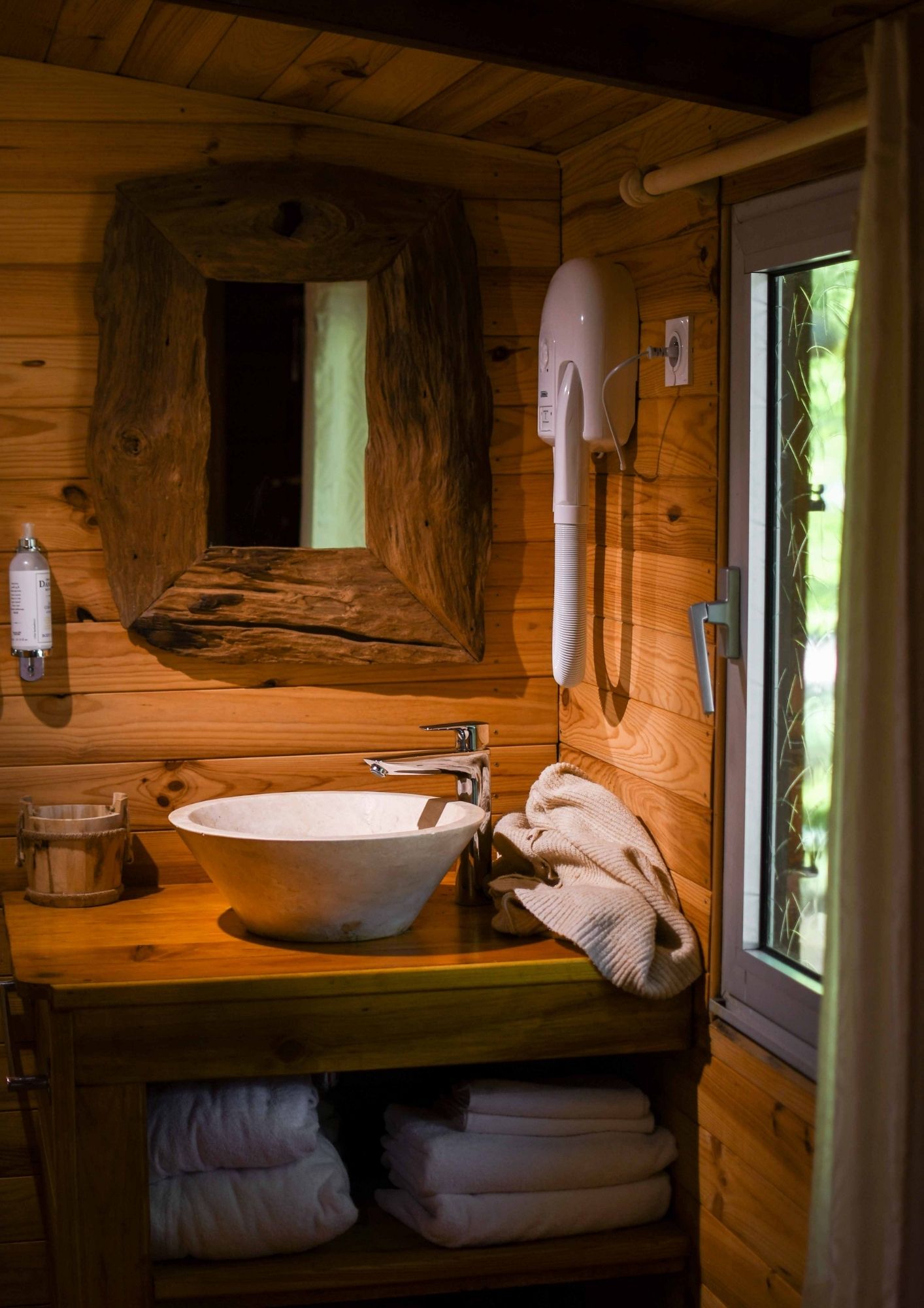 Décoré avec des matières naturelles, ce chalet dispose de tout le confort : eau, électricité, coin repas avec mini-frigo, micro-ondes, cafetière Nespresso et une jolie salle de bain.