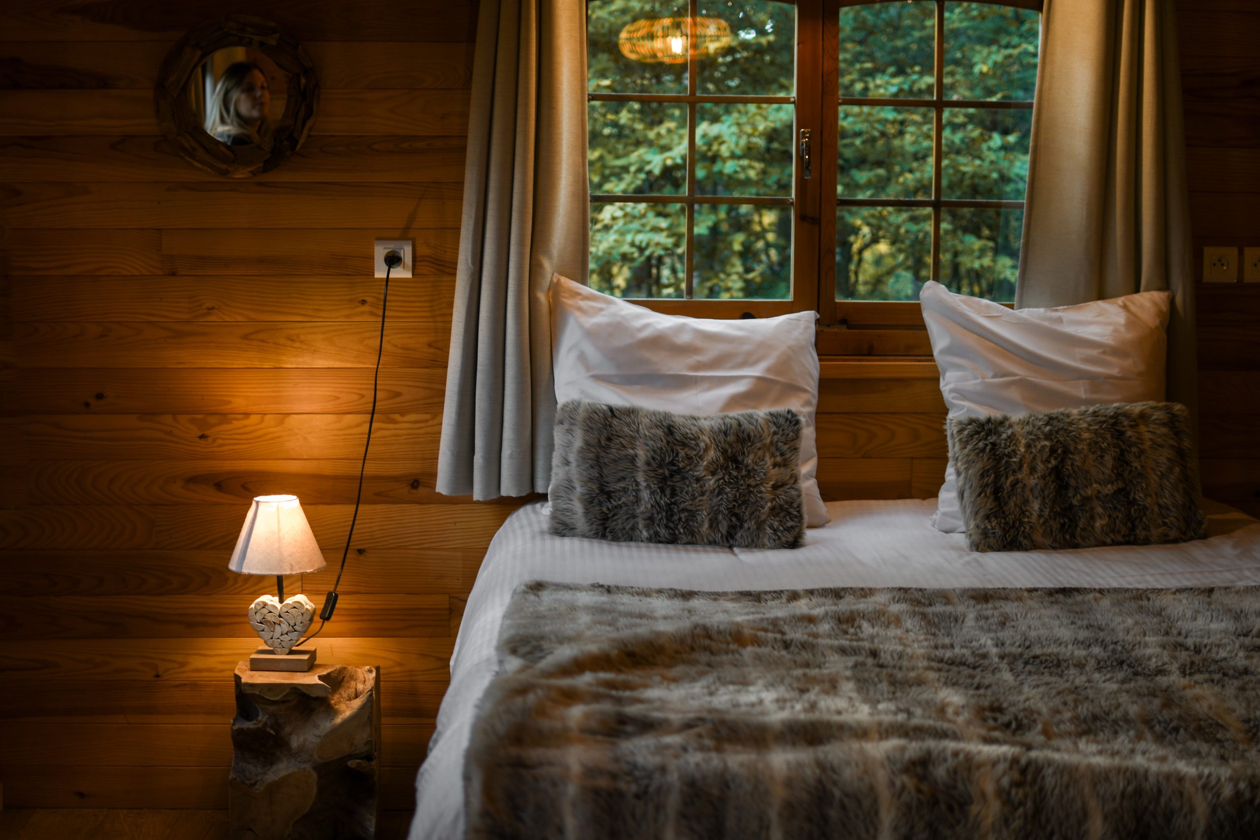Cet chalet vous garantit un séjour en osmose avec la nature.  Profitez d’ un bain de bulles dans le jacuzzi entouré par les arbres, à l’abri des regards. Joliment décorée, la cabane dispose de tout le confort : micro-ondes, mini-frigo, cafetière Nespresso, salle de bain.