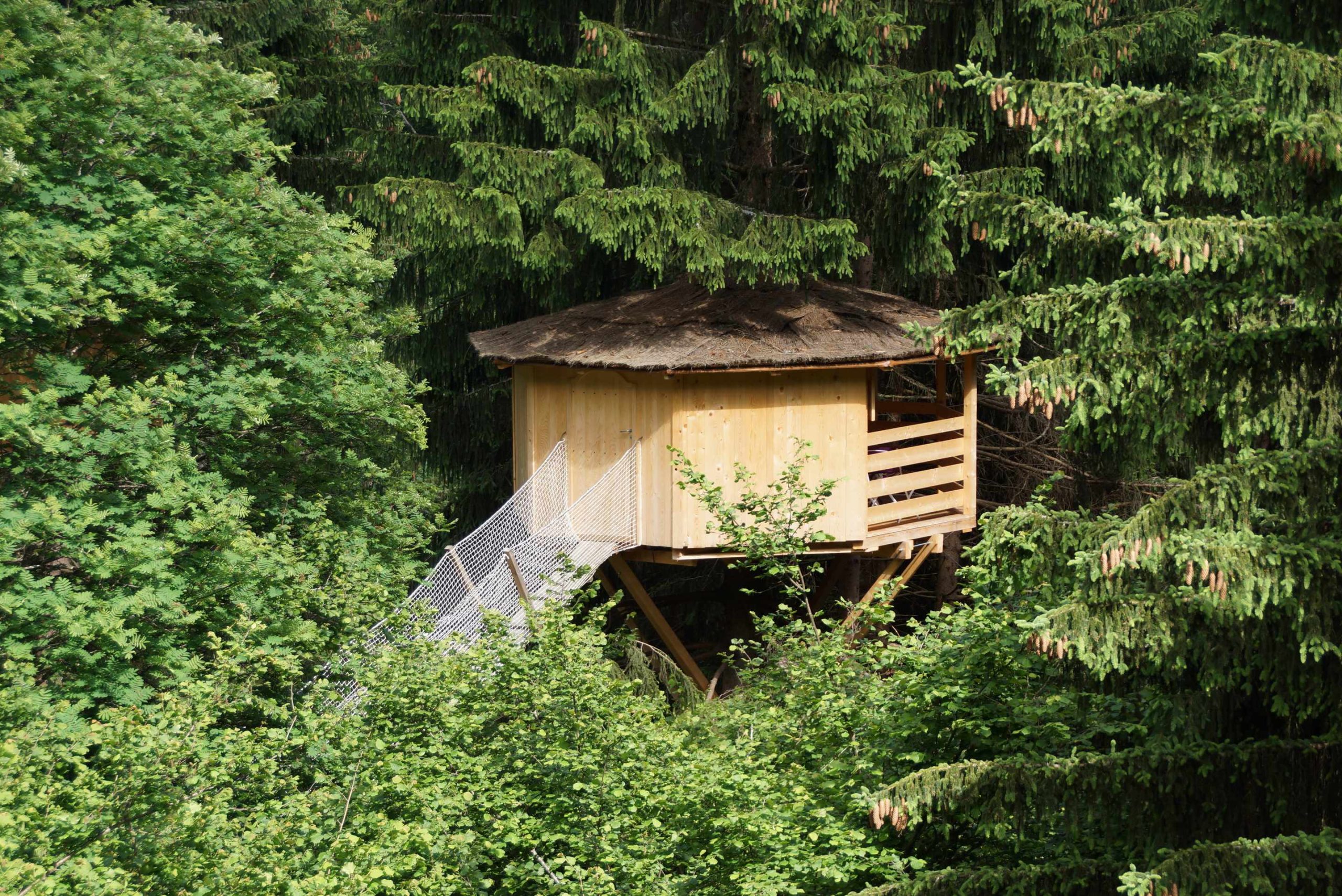 Cabane sur pilotis perchée dans la forêt face au mont blanc.