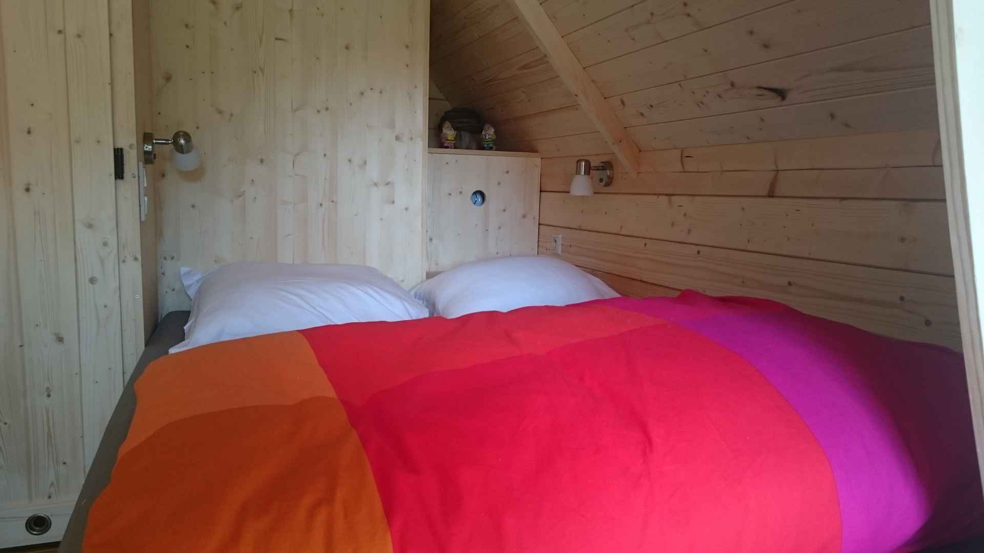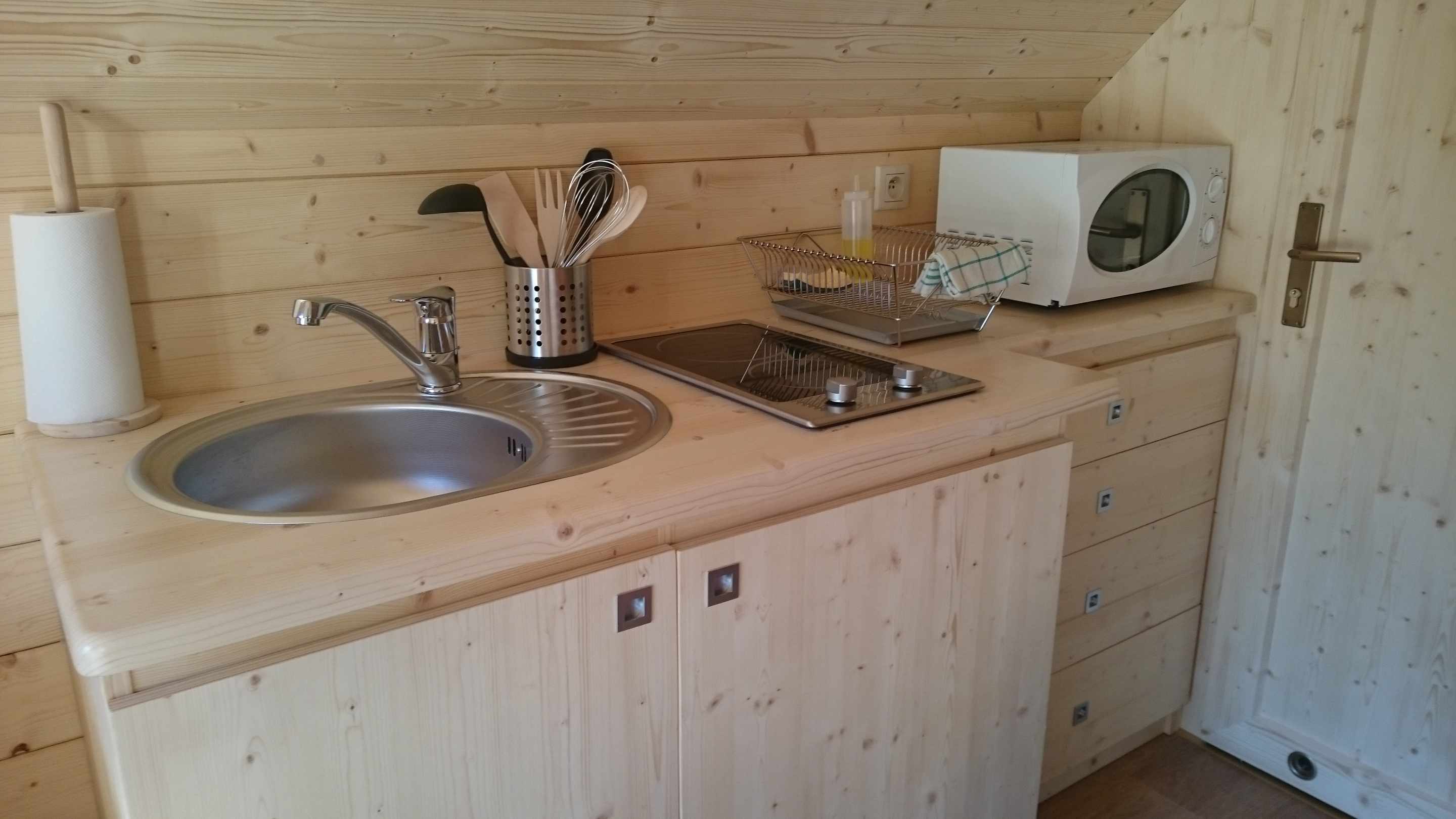 Un vrai micro-gîte de 13 m2, tout confort, équipé d’un lit double 140 x 200, d’une banquette-lit  80 x 190 pour 1 enfant (literie hôtelière), d’une table en bois à rabats avec 4 tabourets, une kitchenette équipée de vaisselle, d’un évier, de 2 plaques de cuisson et d’un réfrigérateur, une salle d’eau avec une cabine de douche, WC, lavabo. Terrasse en bois.