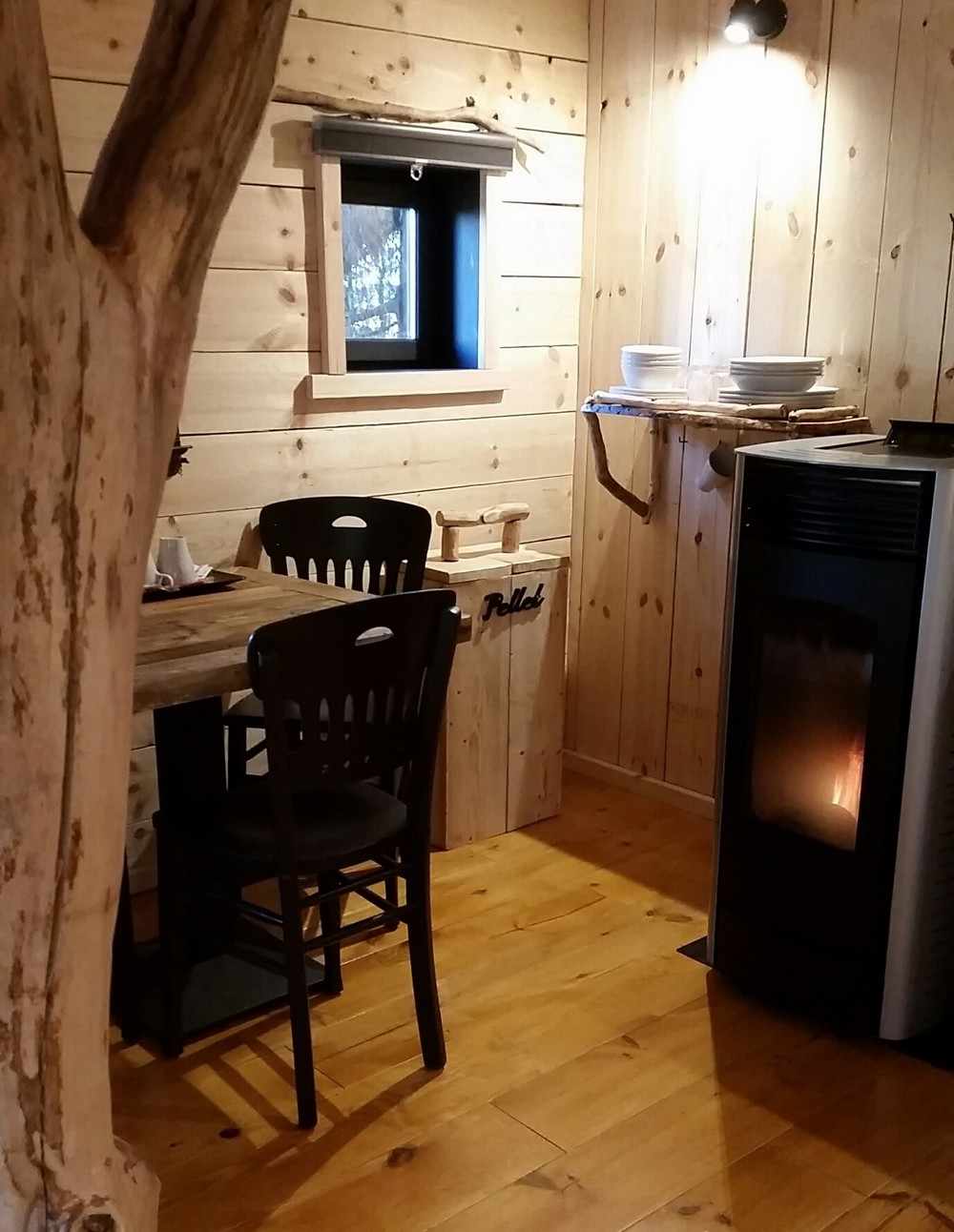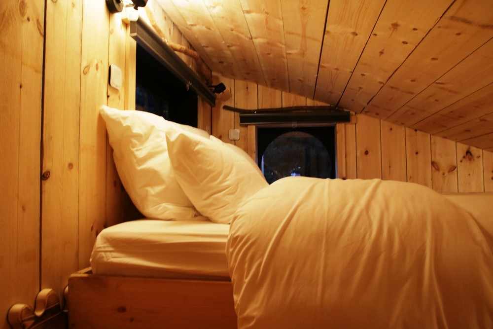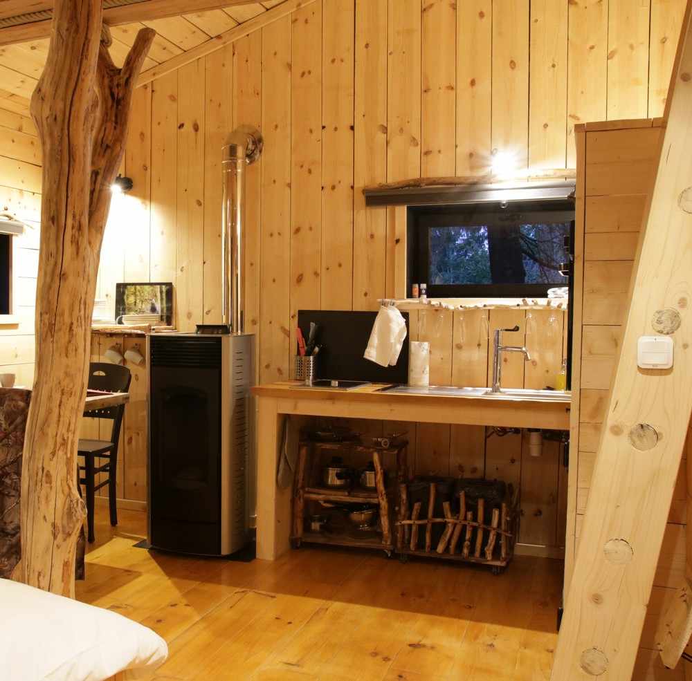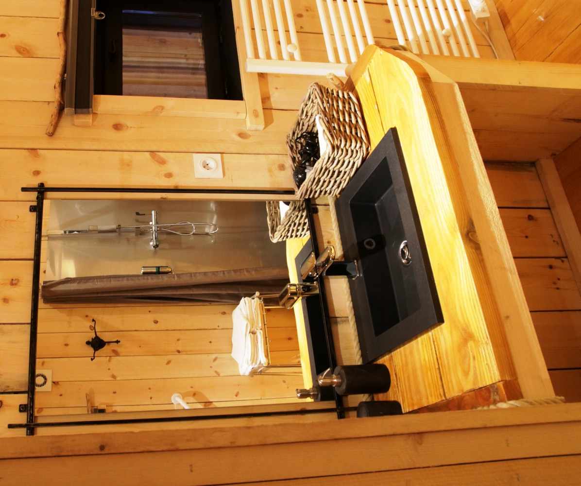 La cabane propose une grande pièce à vivre, d’une grande salle de bain avec douche et WC, ainsi qu’une chambre cosy en mezzanine.