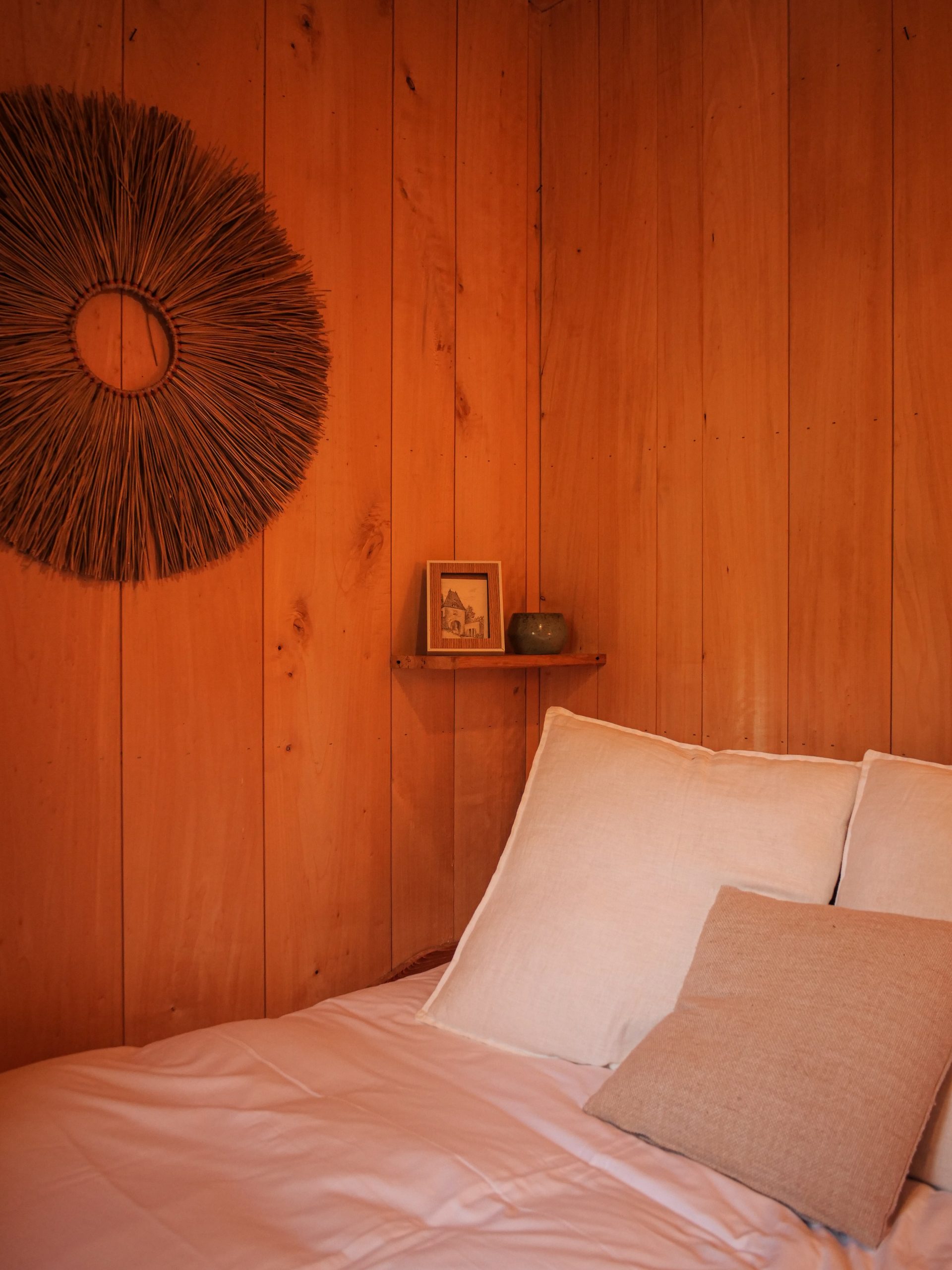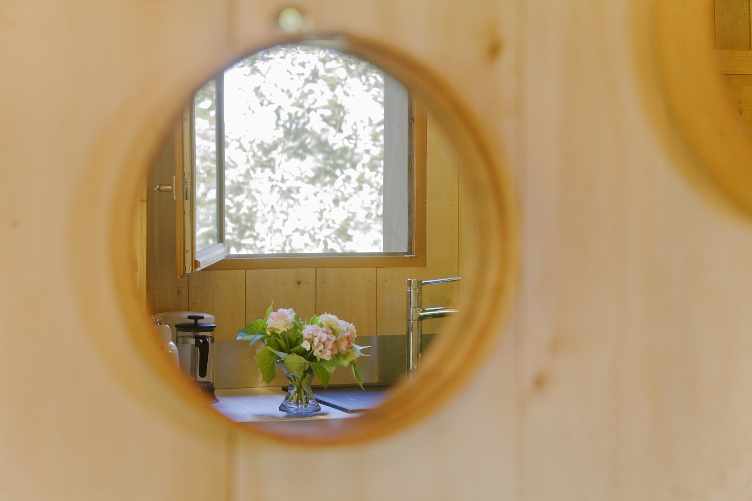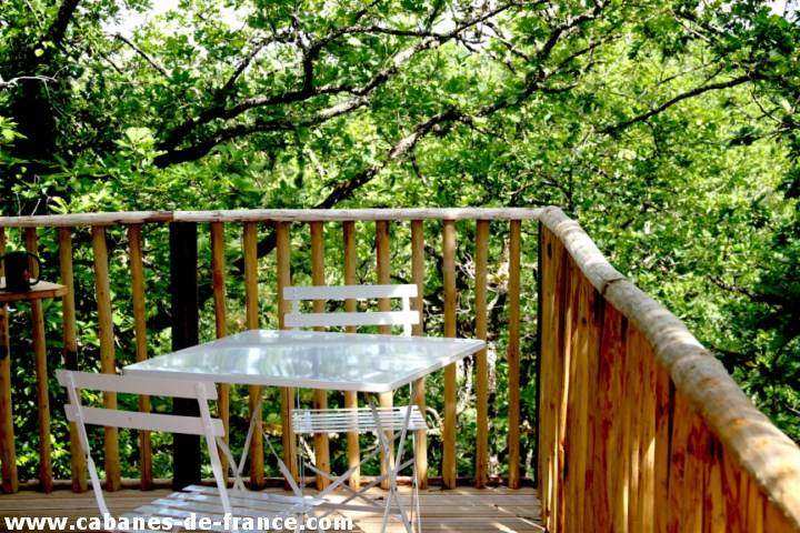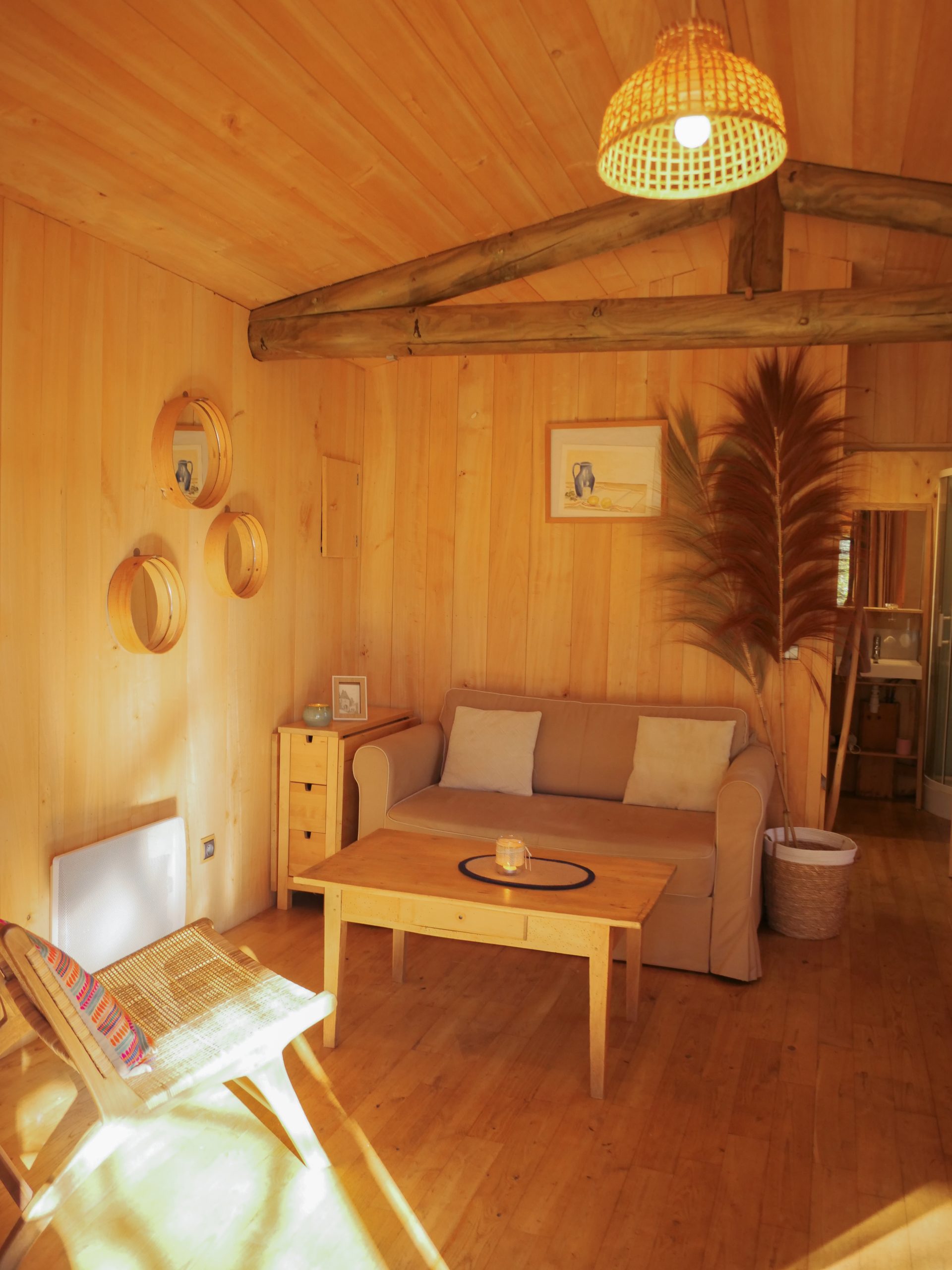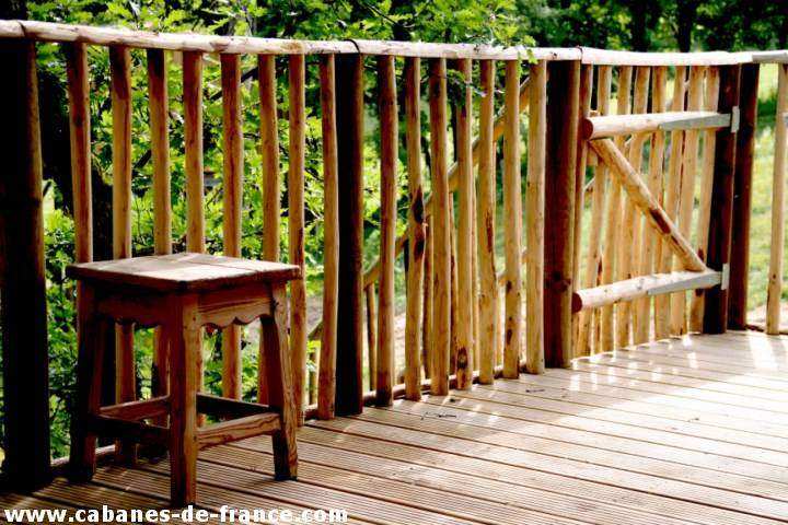 Une cabane perchée, qui se découvre au bout d’un grand escalier en bois. Sa grande terrasse permet de profiter des fins de journées ensoleillées.
