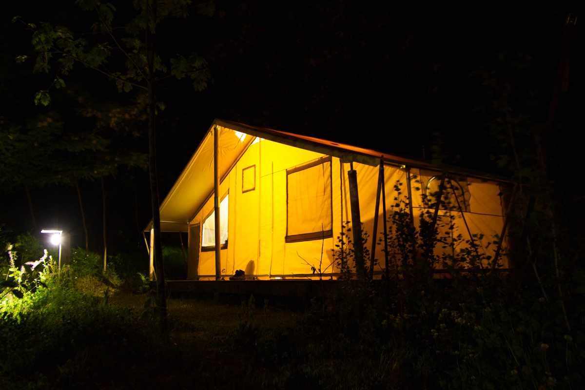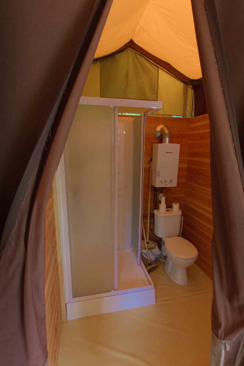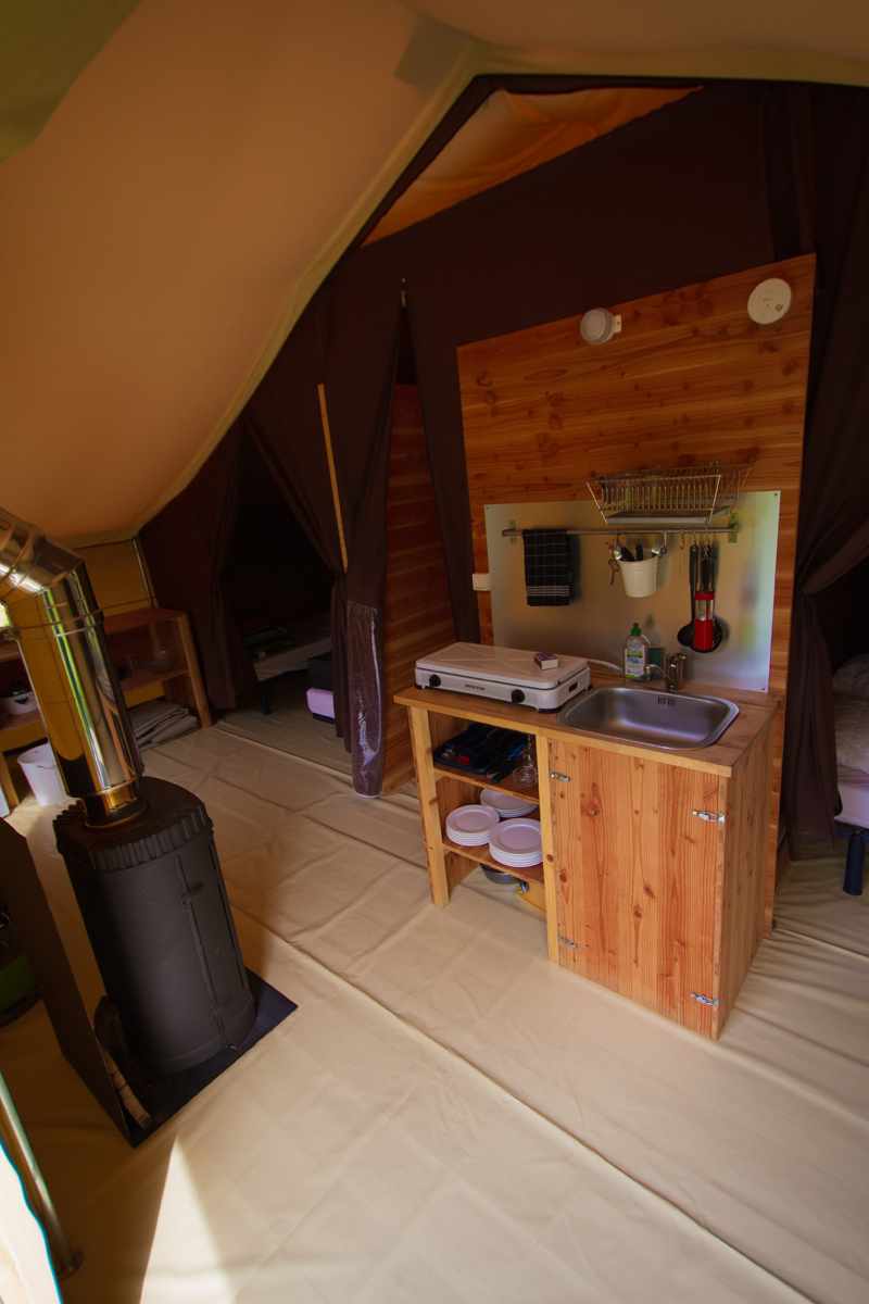 Grande tente équipée, idéale pour camper en toute saison.