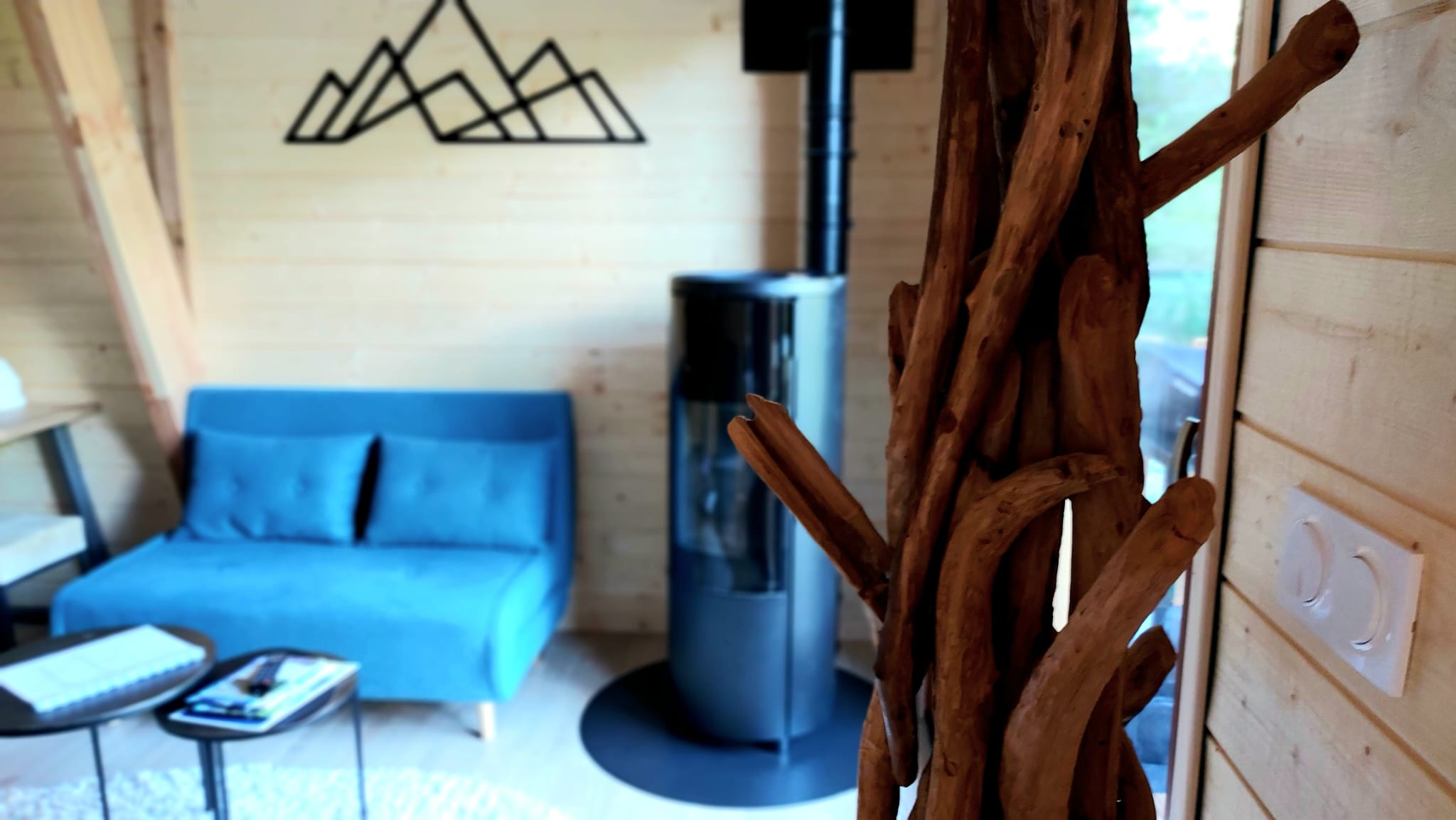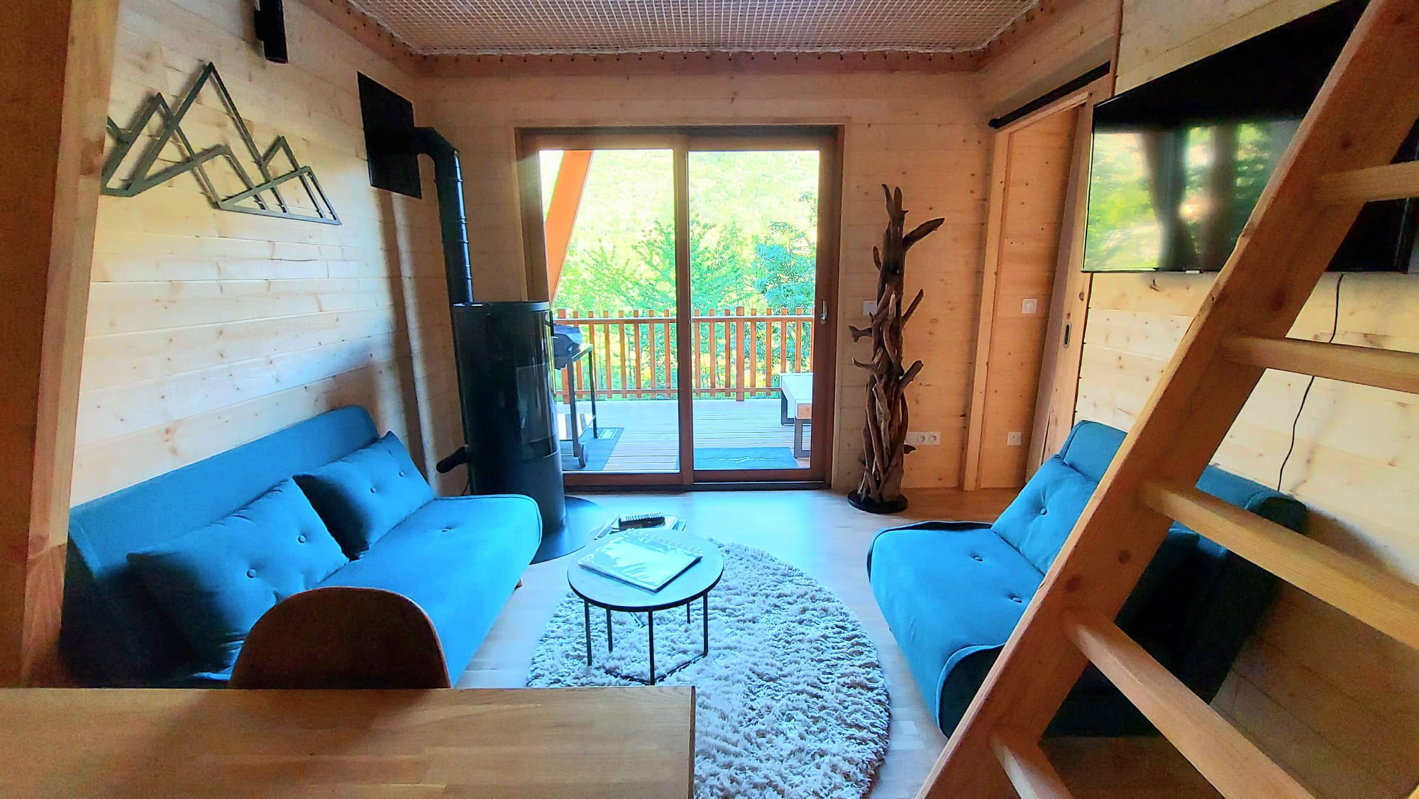 En hiver vous pourrez vous réchauffer auprès du poêle et contempler la vue sur la montagne depuis le filet suspendu au-dessus du séjour.