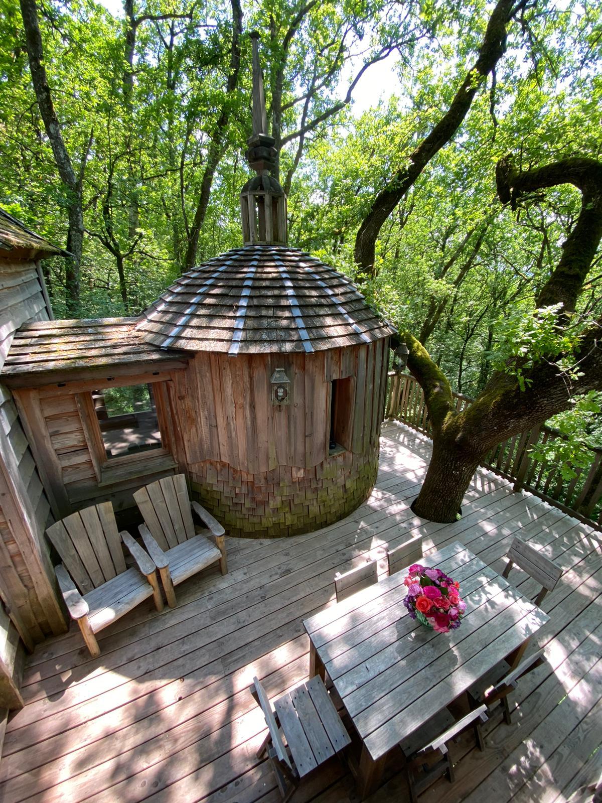 Hautefort est grande cabane familiale pouvant accueillir jusqu’à 6 personnes et perchée à 8 mètres de haut.