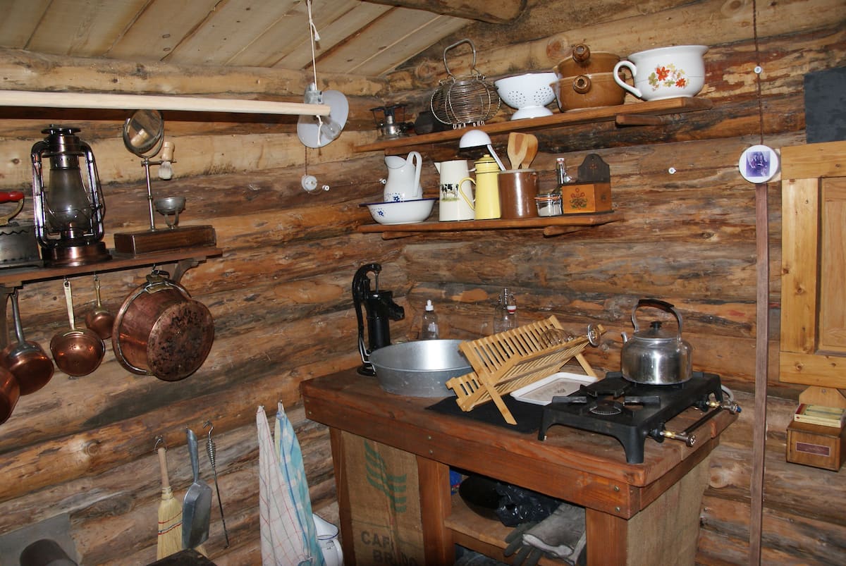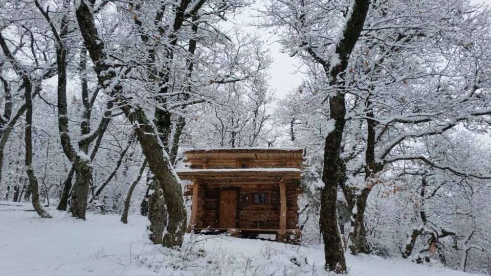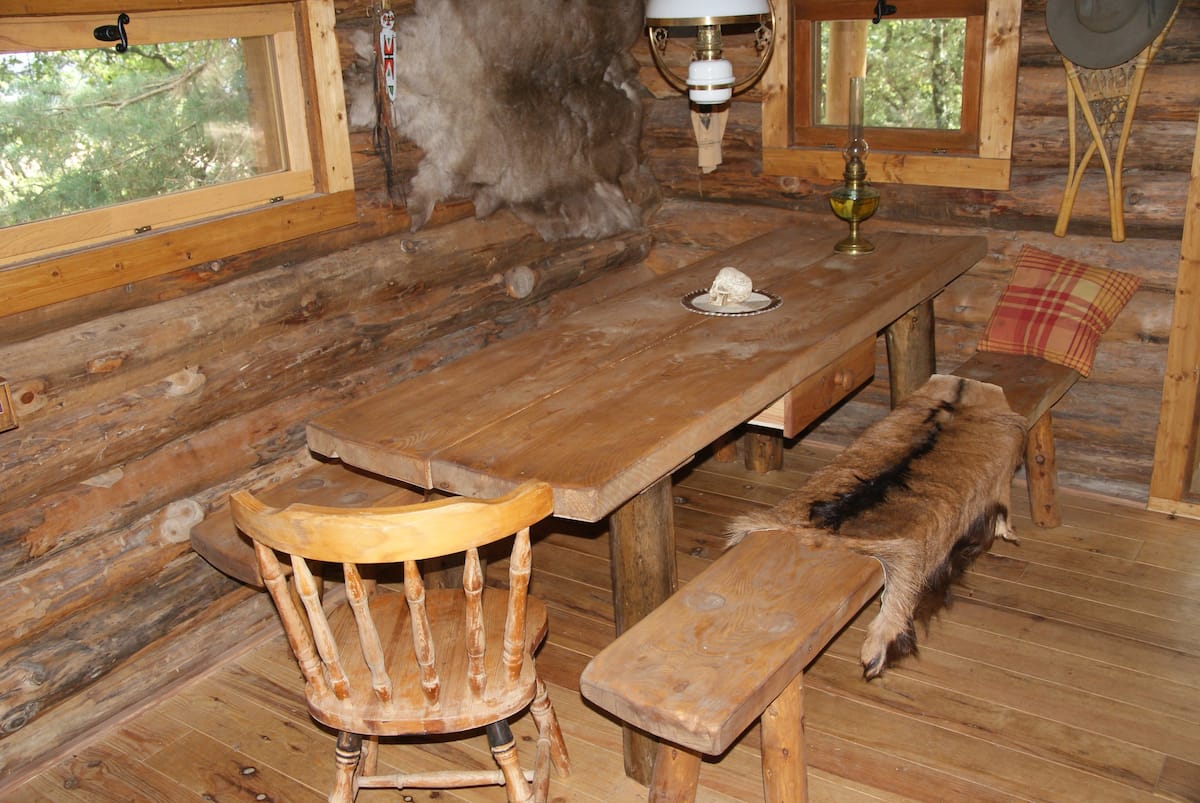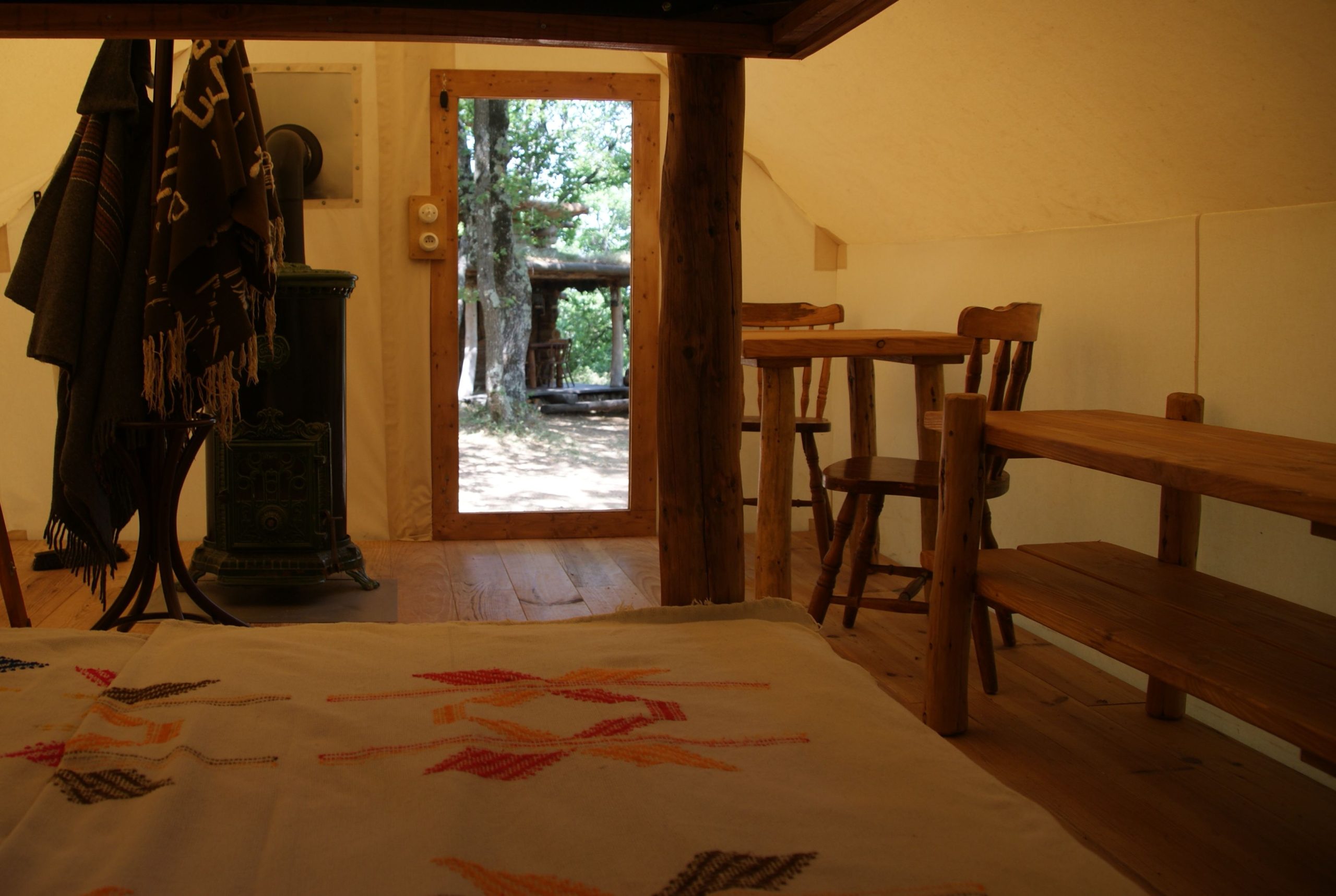 Une véritable cabane construite en fuste et une authentique tente de trappeur chauffées par des poêles à bois.