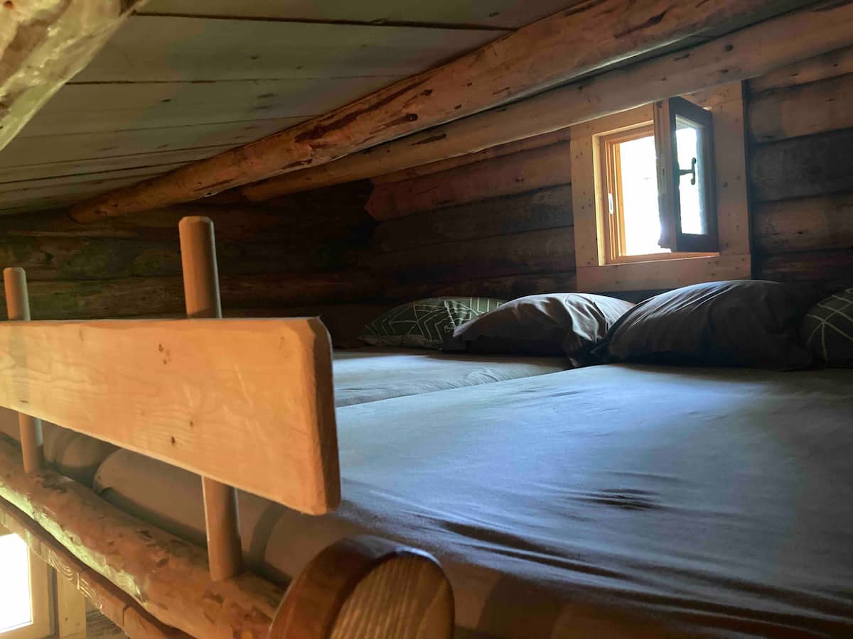 Dans la cabane le couchage en mezzanine éclairée par un petit fenestron comporte quatre places sur matelas à mémoire de forme.