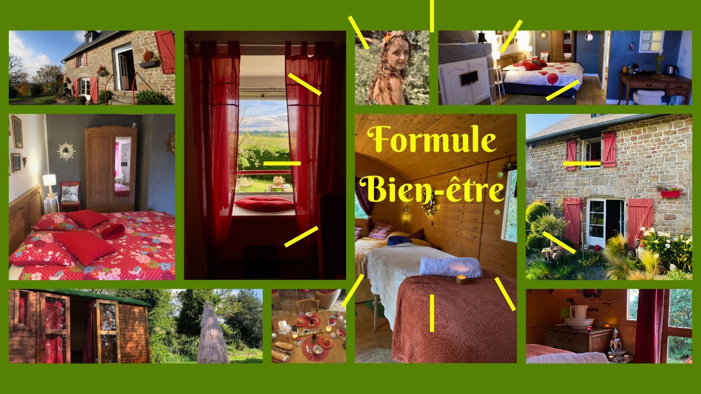 Dans un cadre ressourçant, en nature et sans artifices, non loin de LA vibrante Merveille (le Mont Saint Michel), nous vous proposons une nuit (ou plusieurs) dans notre chambre d’hôtes Aux Anges, petit-déjeuner maison et bio inclus, associé à un moment de détente et de douceur absolue pour 1 personne (1h30 environ) dans la roulotte Nature et Charme, au choix : un massage Ayurvédique Abhyanga, un soin Ecoute Holistique Sensitive ou un soin de guérison LaHoChi.
