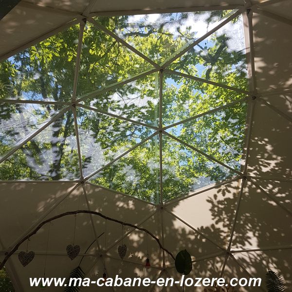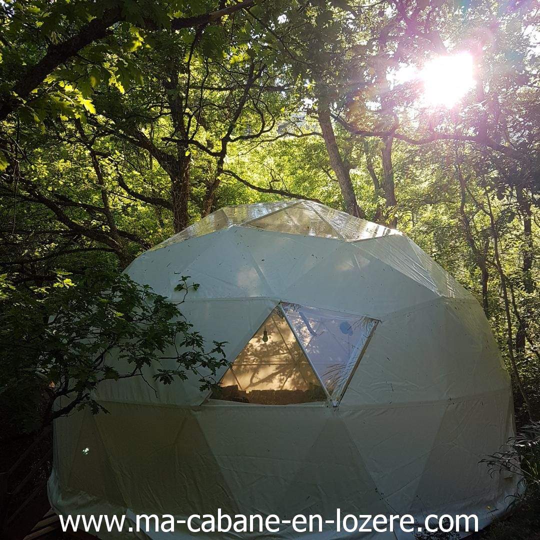 Un grand dôme géodesique dédié aux arbres, en hauteur , au cœur de la forêt avec vue panoramique  sur les branche depuis votre lit. Hébergement Glamping pour 2 adultes ou 2 adultes et un enfant. Belle terrasse en bois avec mobilier extérieur, hamacs et jardin privatif en forêt. Très jolie salle d’eau et wc dans une cabanette perchée privative à proximité. Equipé de frigo, vaisselle, café, thé. Petit déjeuners inclus.