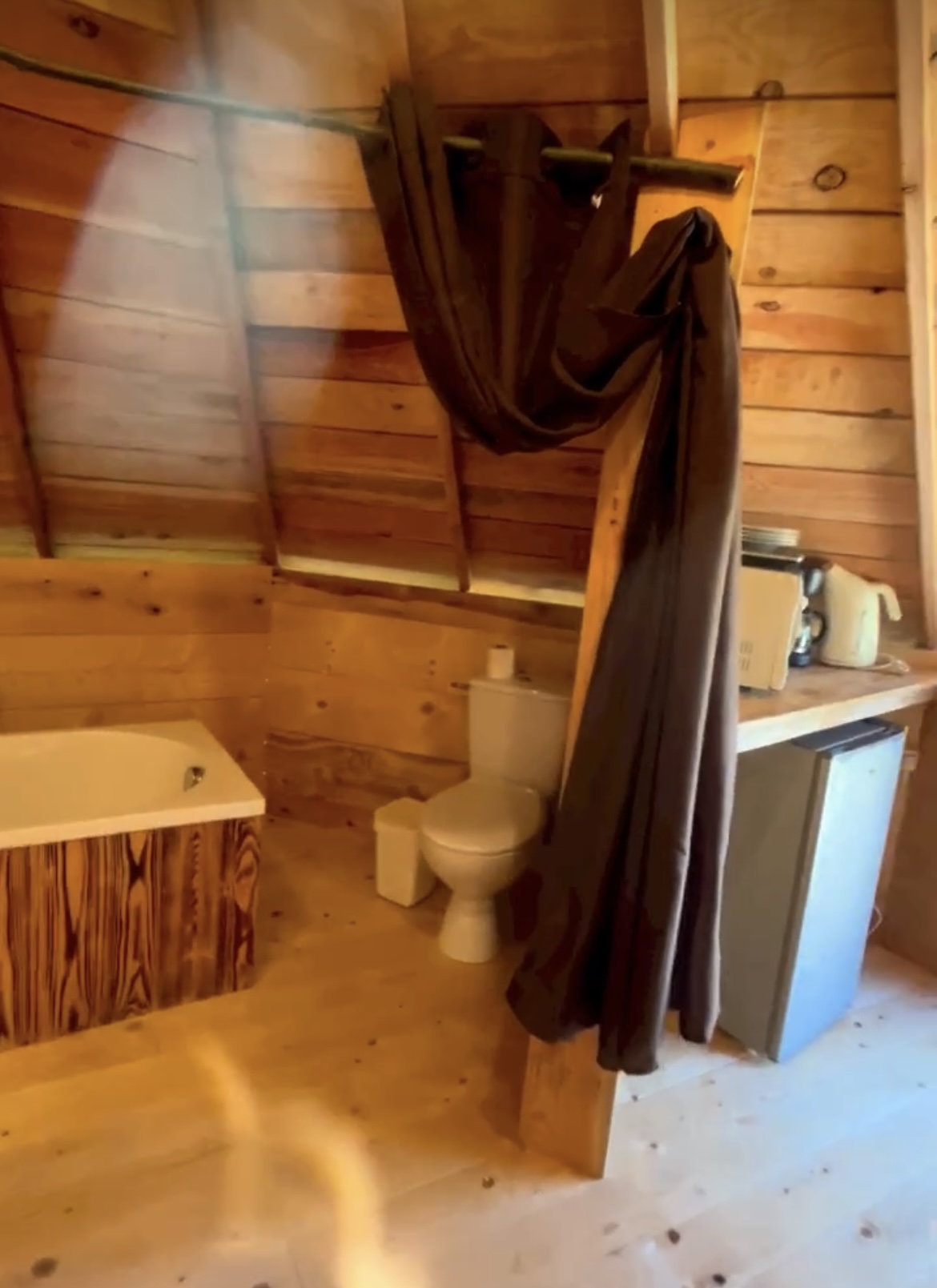 Insolite à l’intérieur avec sa baignoire dans la pièce et tout équipé : évier lavabo, frigo, plaque de cuisson, micro-onde, sanitaire.
