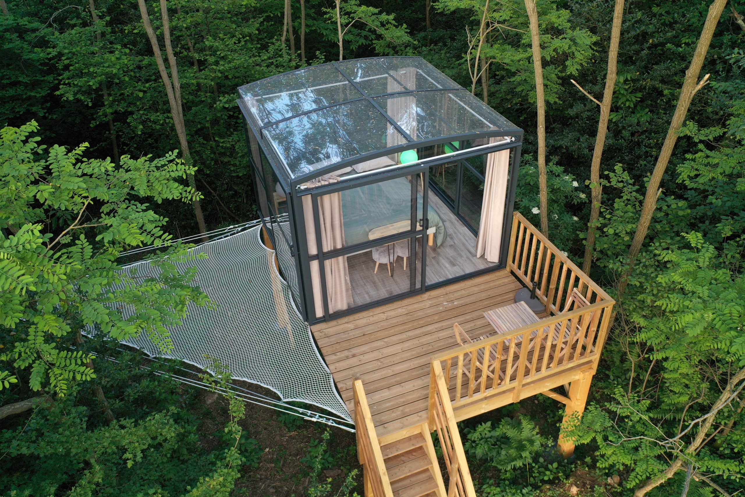 a Bulle des bois est un hébergement d’une surface de 9m². Sa hauteur de 2,40 m permet de se tenir debout. L’ensemble des parois et toitures sont équipées de plaques de polycarbonate totalement transparentes, ce qui permet d’observer la nature environnante et de contempler le ciel étoilé. Elle est dotée d’une ouverture coulissante. Ce logement possède des rideaux pour préserver votre intimité. Une moustiquaire de lit vous protégera des éventuels moustiques.