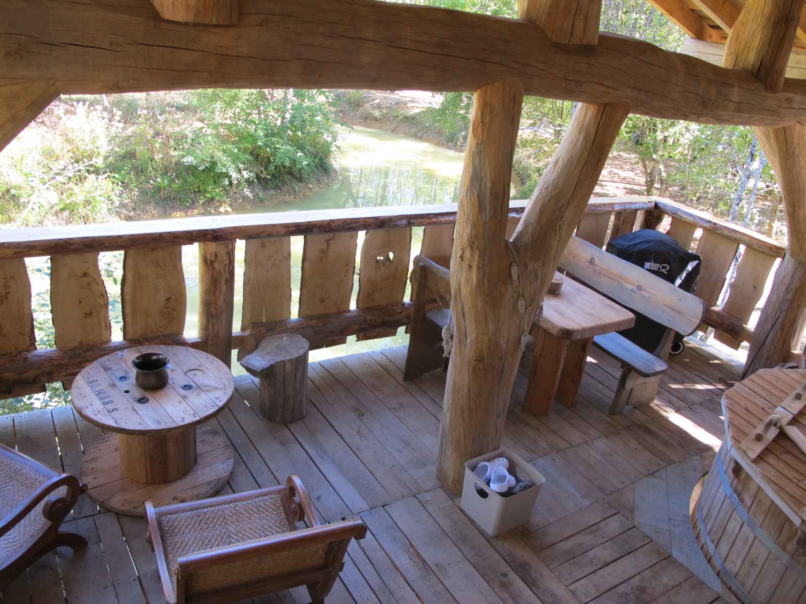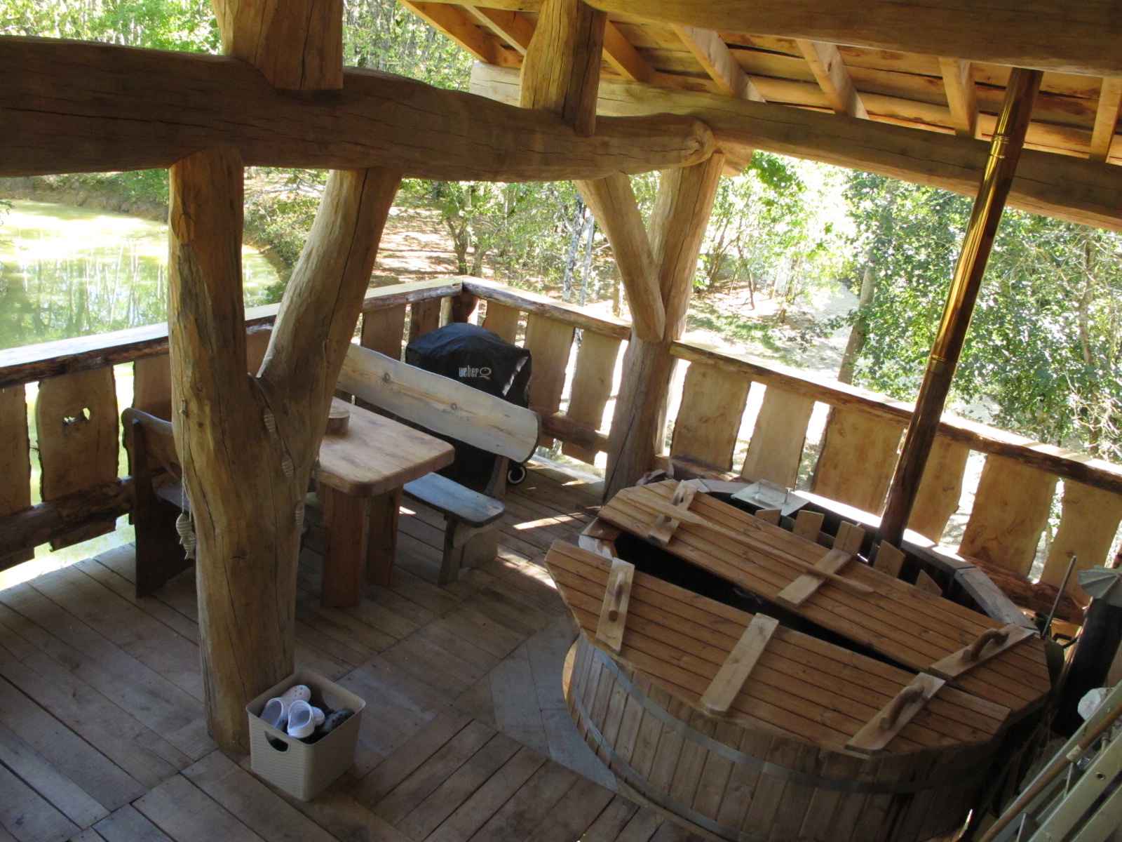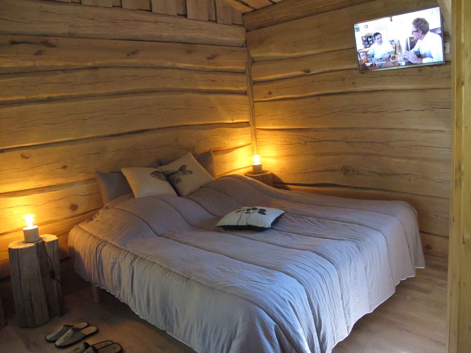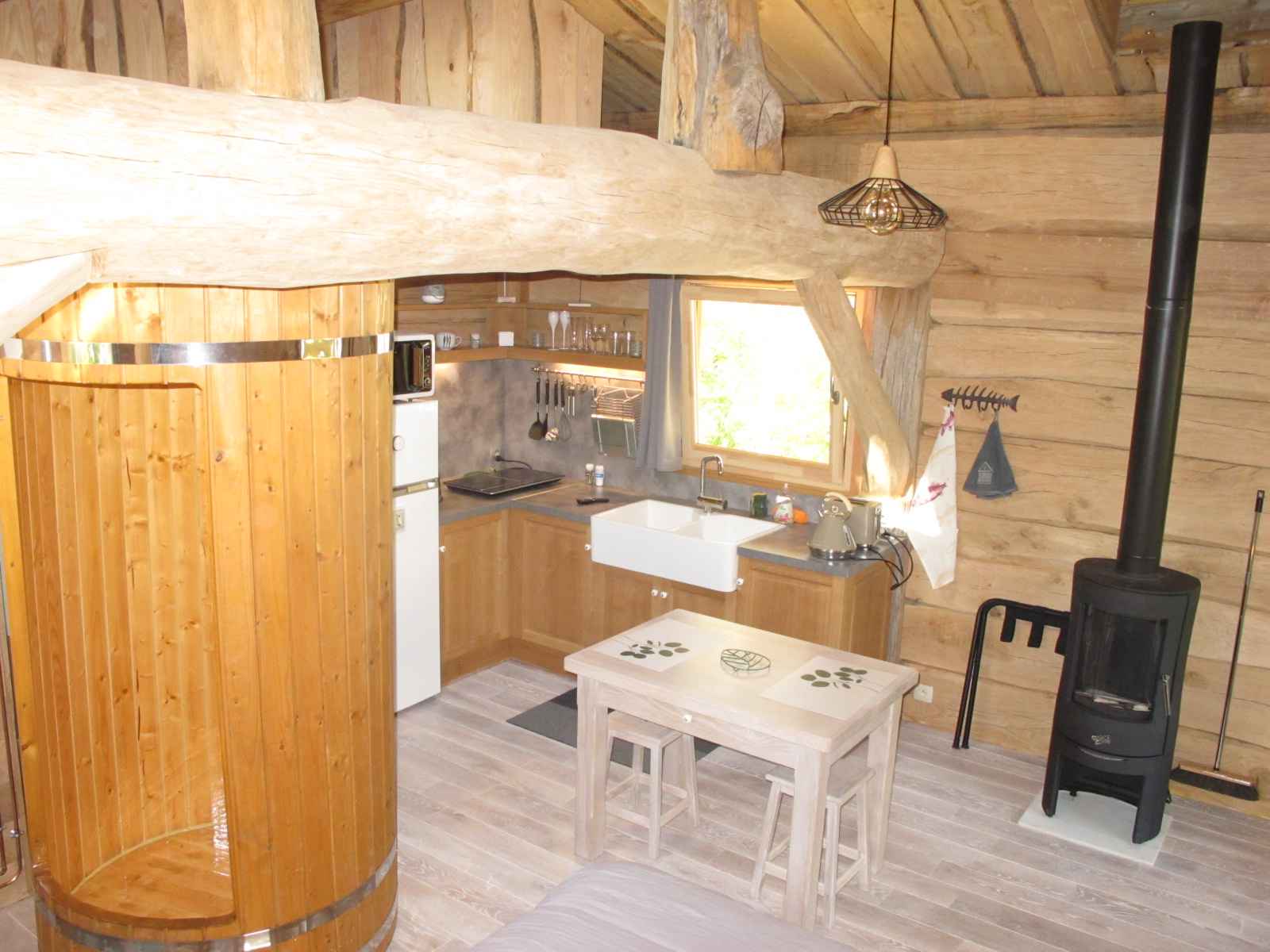 Cabane en chêne sur pilotis à 3 m de haut. Terrasse couverte de 30 m² avec bain finlandais et BBG Gaz disponible toute l’année. La cabane comprend une pièce de vie avec coin cuisine équipé, coin repas et lit king size (possibilité de 2 couchages séparés) avec TV écran plat, tablette tactile avec wifi et poêle à bois pour les longues soirées d’hiver. Un coin salle d’eau contenant douche en bois, lavabo, avec wc séparé. Un sauna extérieur est mis à disposition.