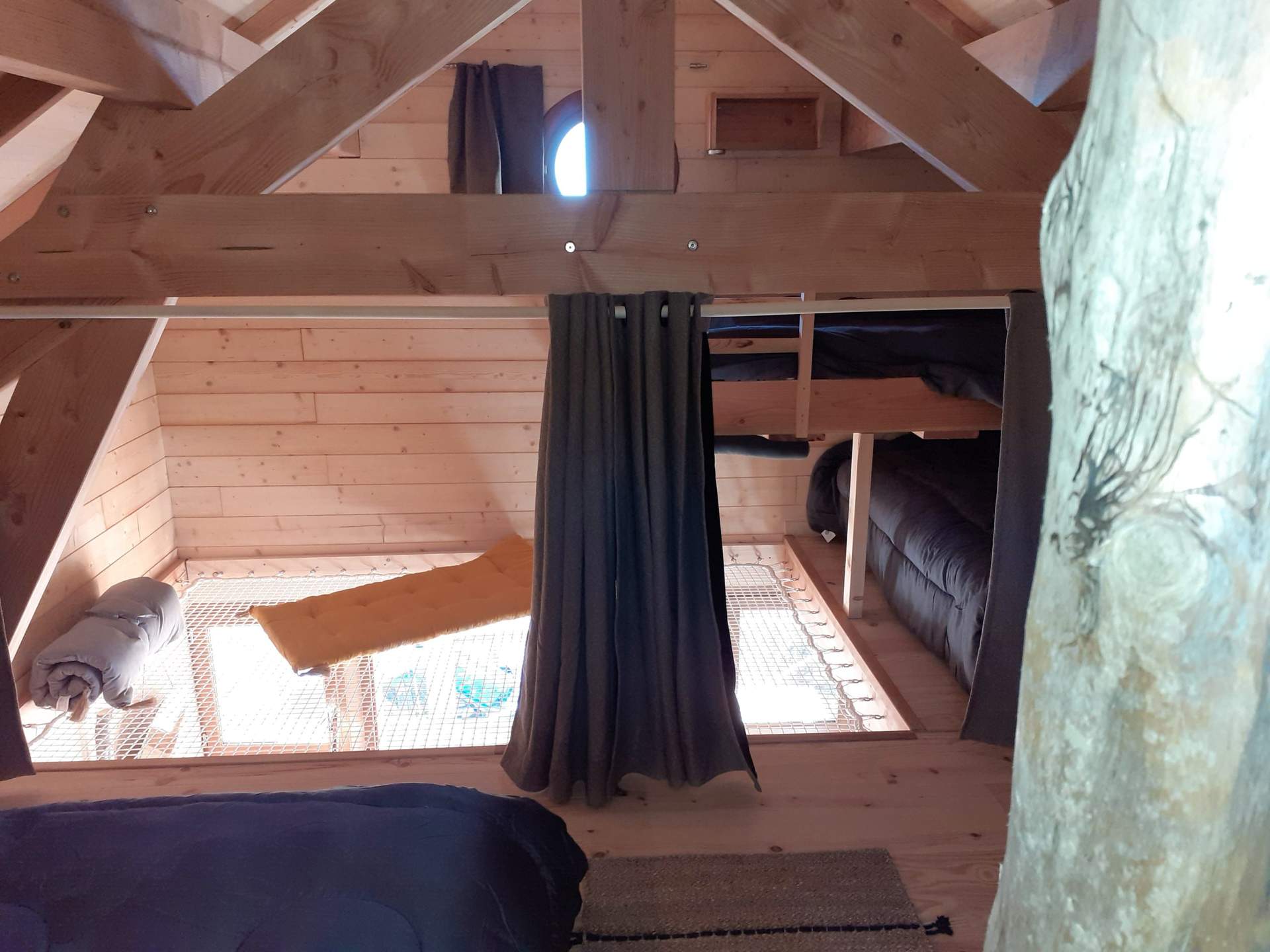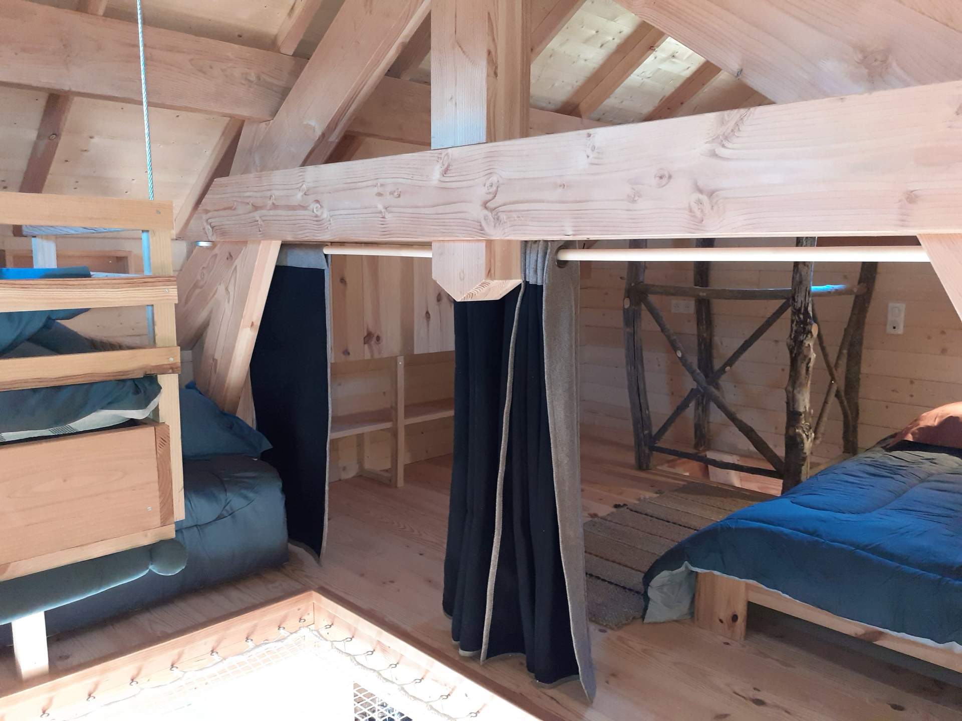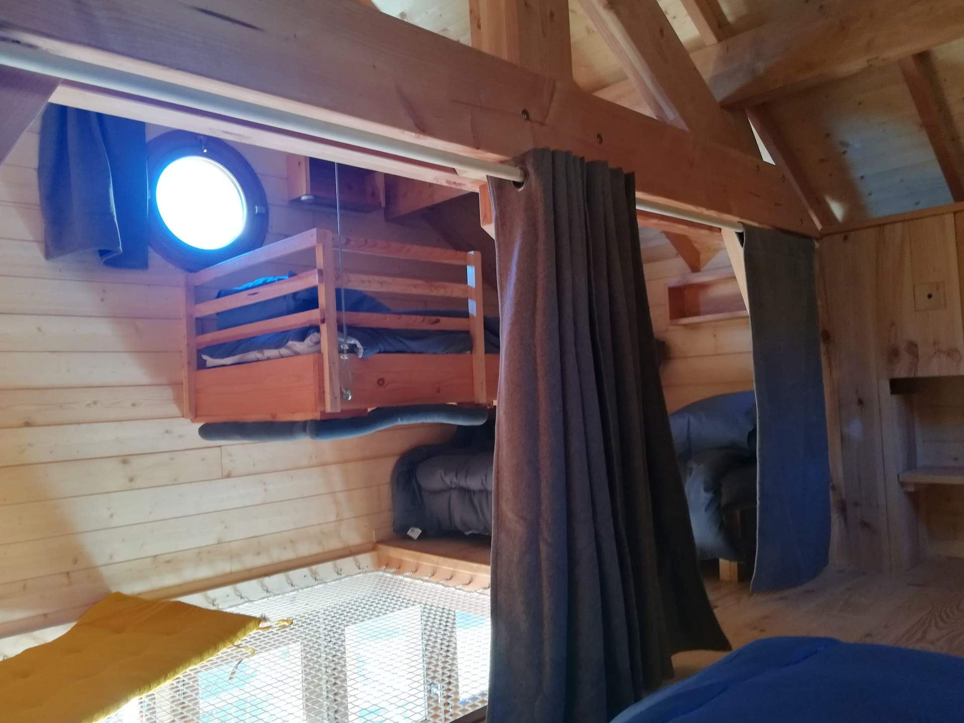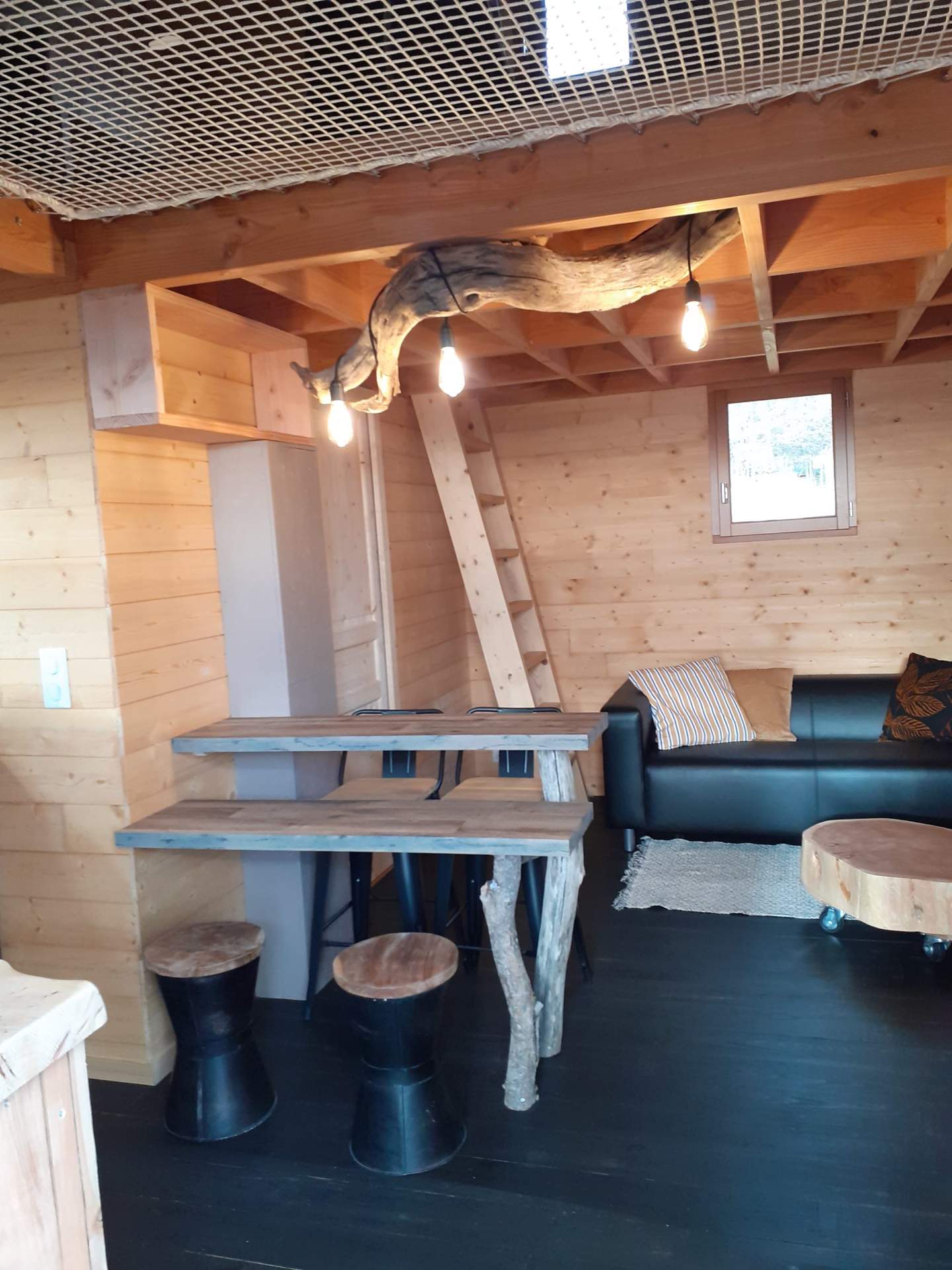• La cabane , tout confort, conçue pour 4 personnes comporte une pièce de vie (17 m2 ) et une mezzanine avec un filet de détente ( 20m2 ) accessible par une échelle de meunier.