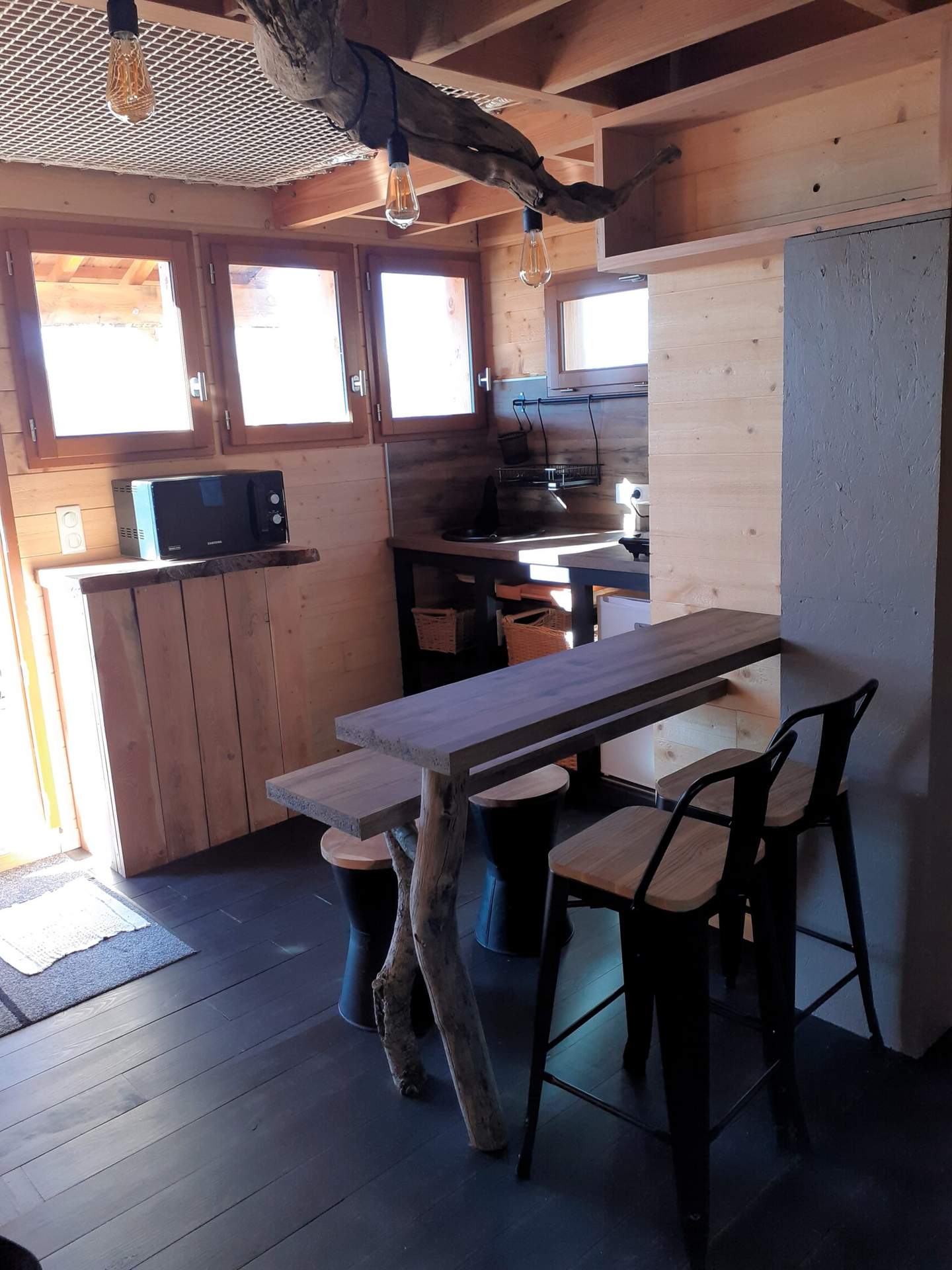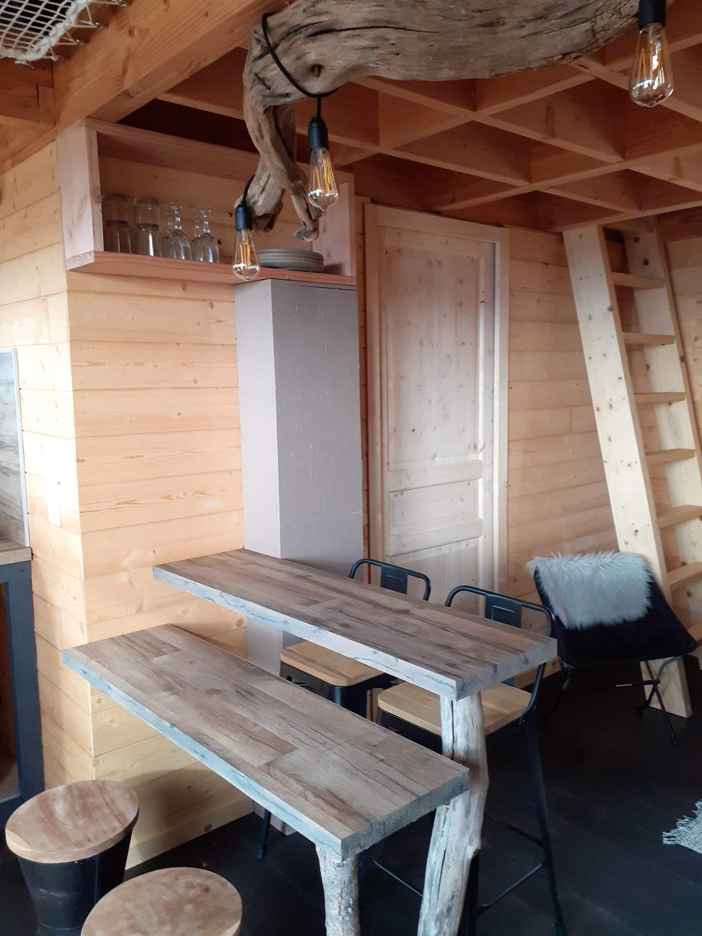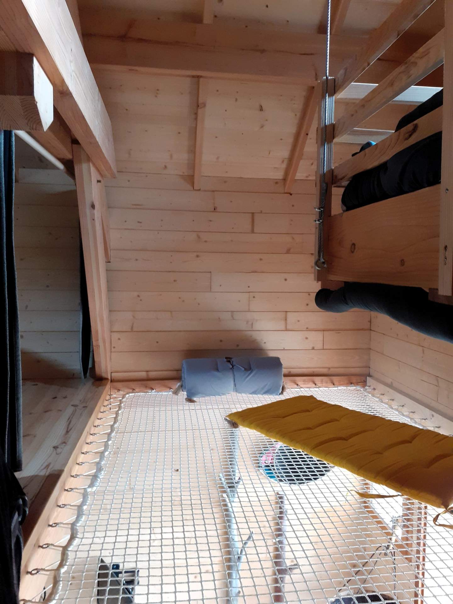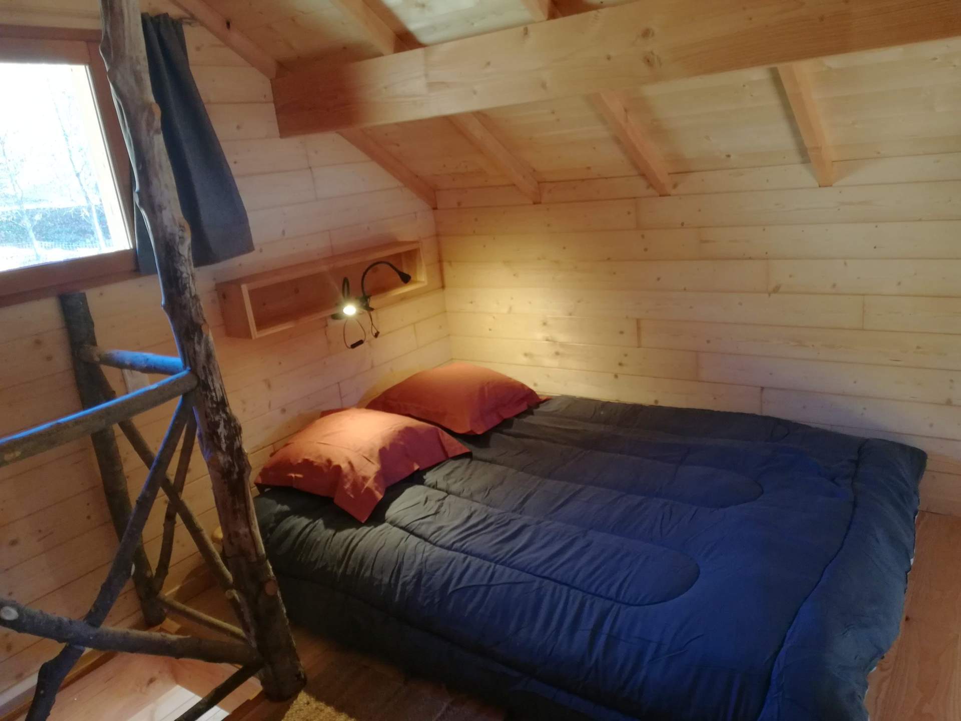 • La cabane , tout confort, conçue pour 4 personnes comporte une pièce de vie (17 m2 ) et une mezzanine avec un filet de détente ( 20m2 ) accessible par une échelle de meunier.