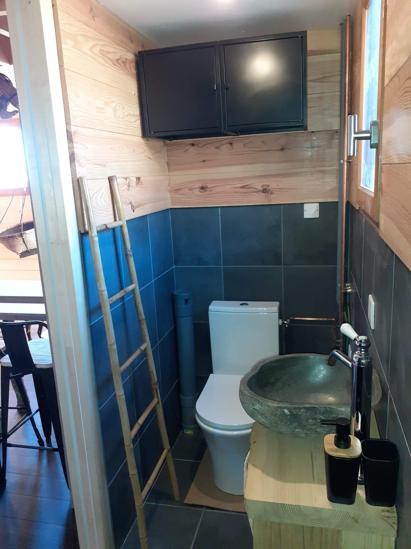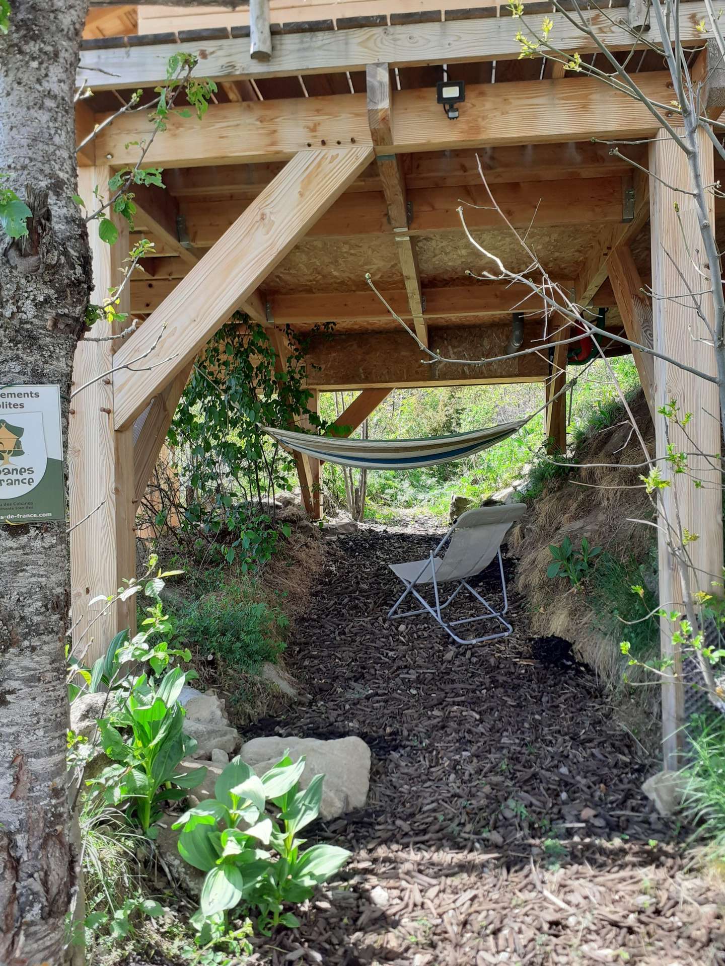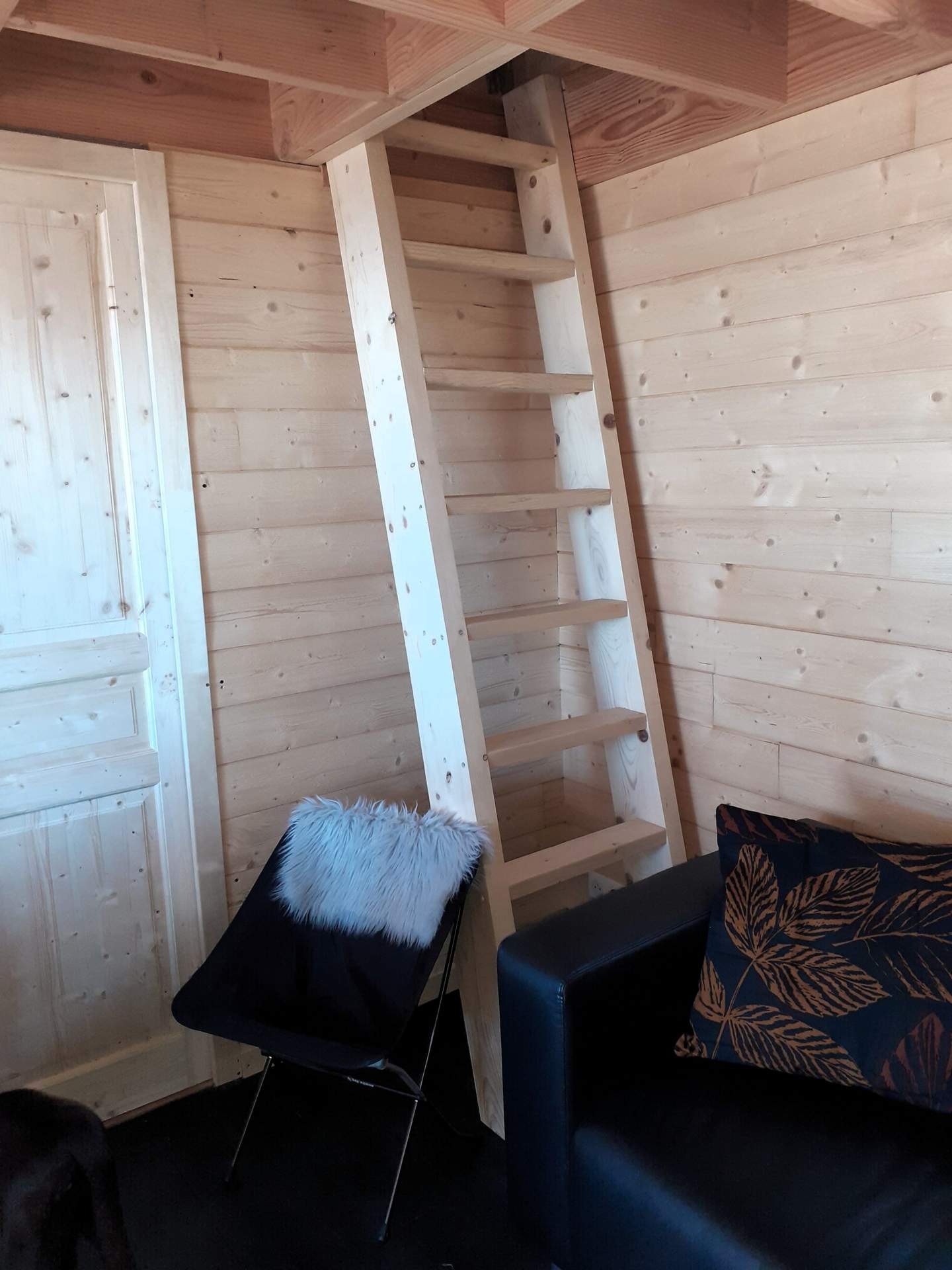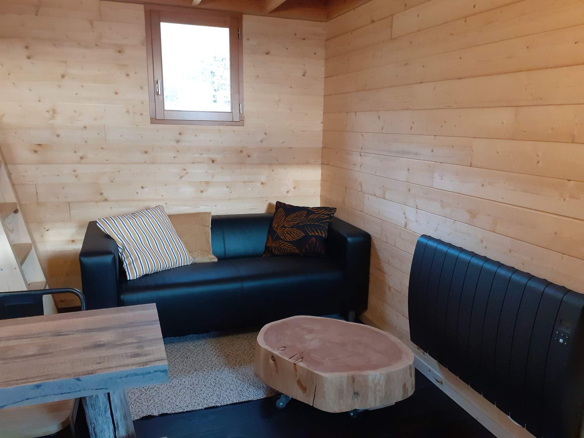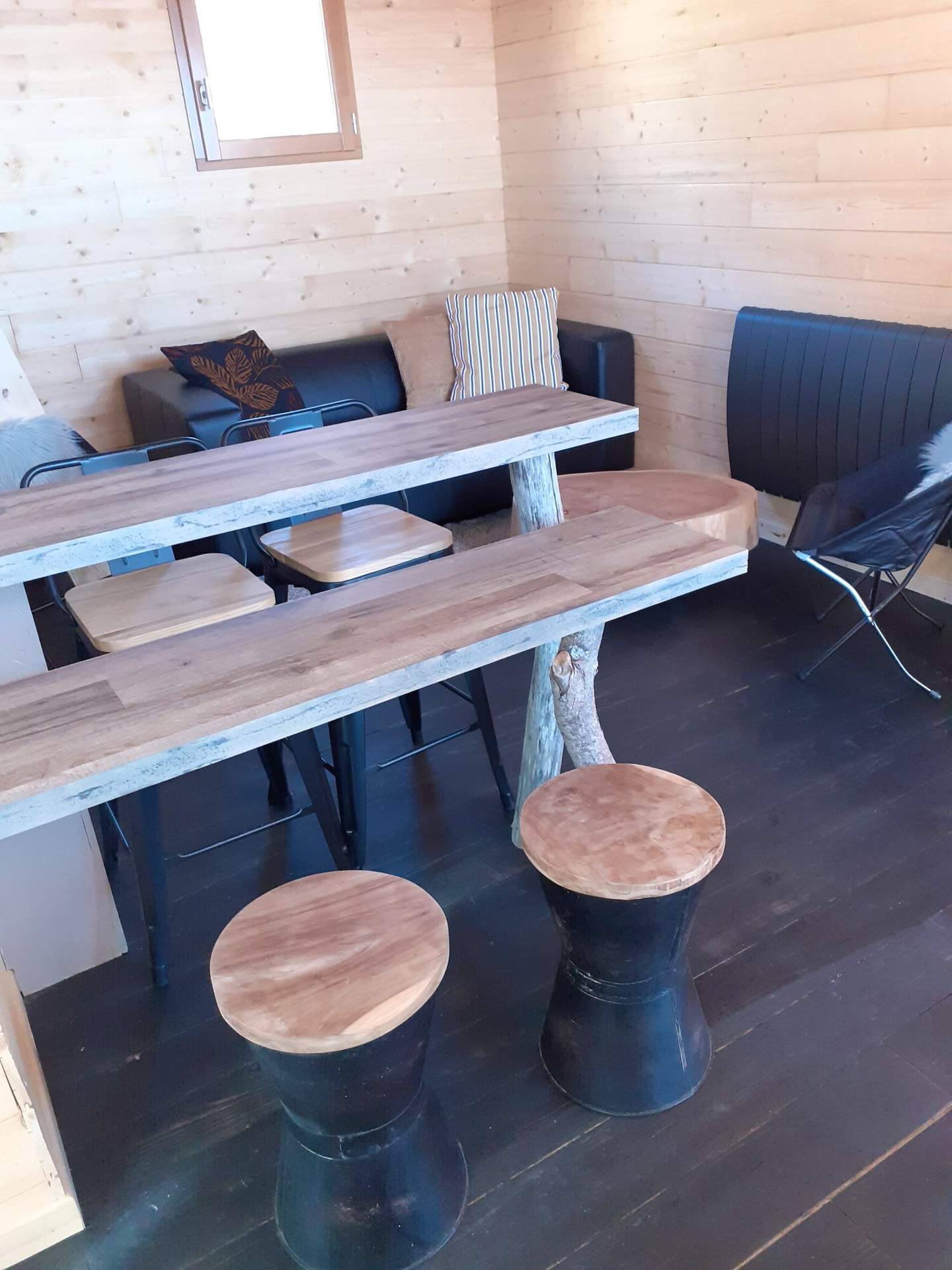 • La cabane , tout confort, conçue pour 4 personnes comporte une pièce de vie (17 m2 ) et une mezzanine avec un filet de détente ( 20m2 ) accessible par une échelle de meunier.