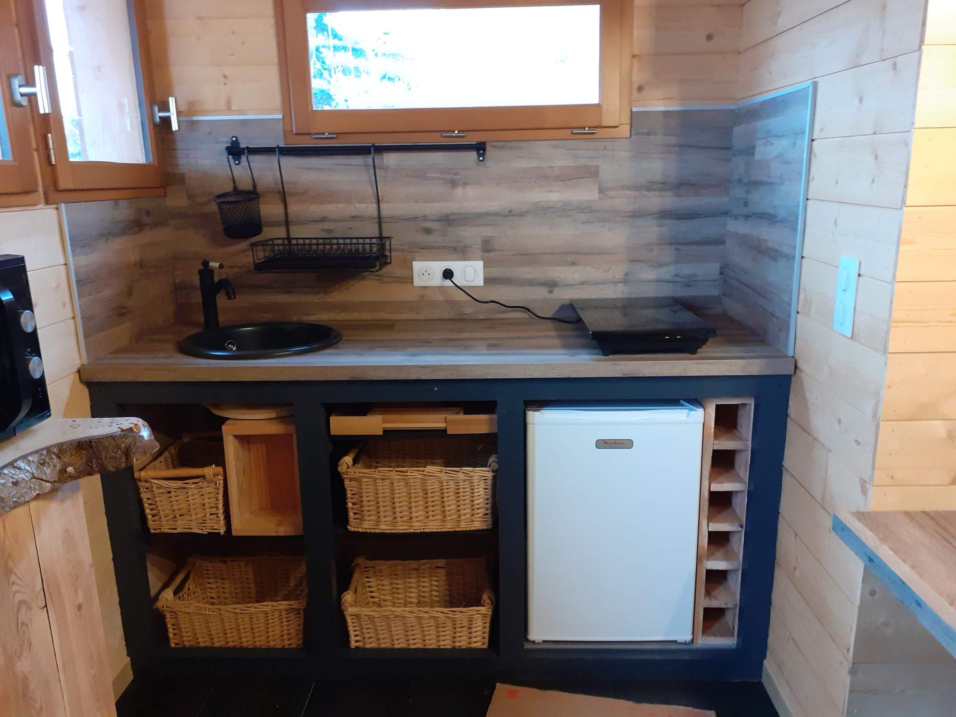 • La kitchenette se trouve dans la pièce de vie ainsi que le salon et le coin repas.