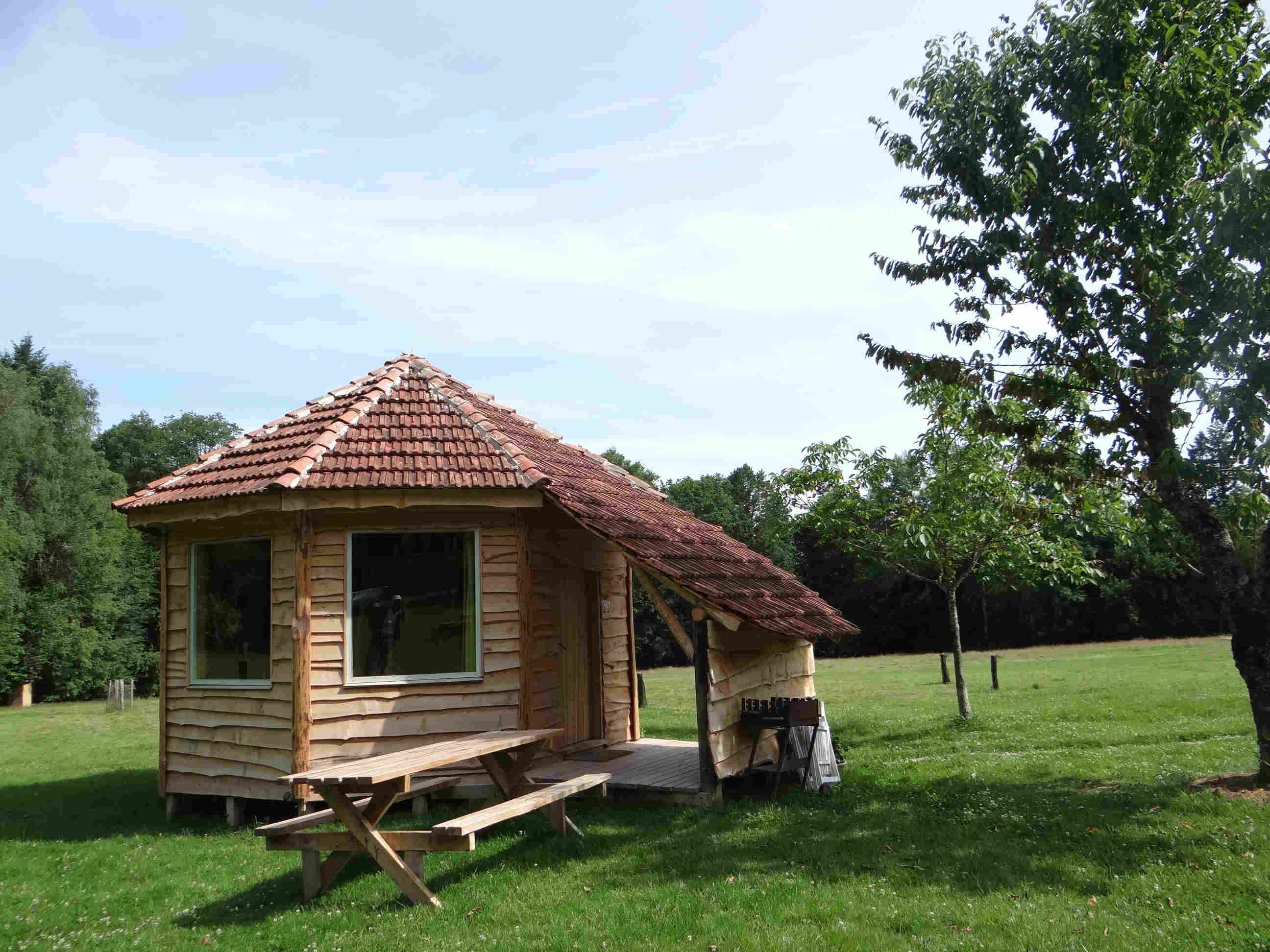 Cette cabane peut accueillir 4 personnes, 1 lit double et deux lits simples en mezzanine (à partir de 6 ans). Toilette sèche à l’arrière de la Cabane et coin cuisine et espace sanitaire à proximité.