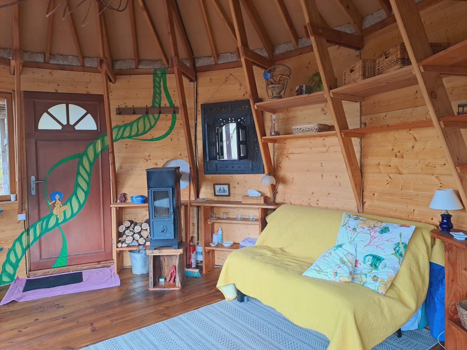 Somptueuse cabane en bois à 16 pans avec tout le nécessaire, y compris un frigo et une chaîne hi-fi. Sans parler du luxe de disposer de sa douche personnelle …